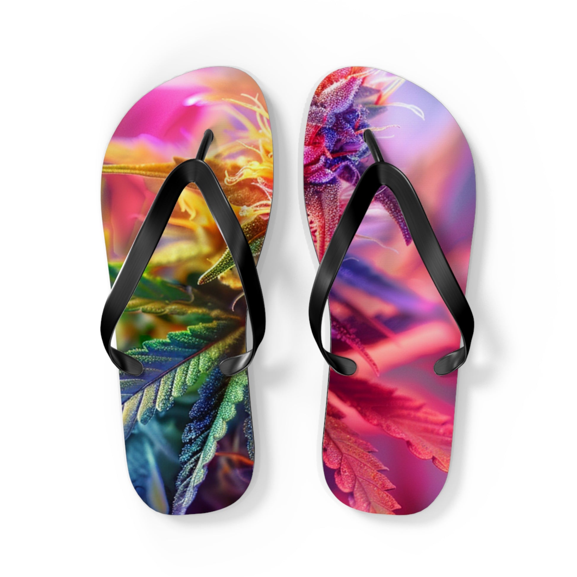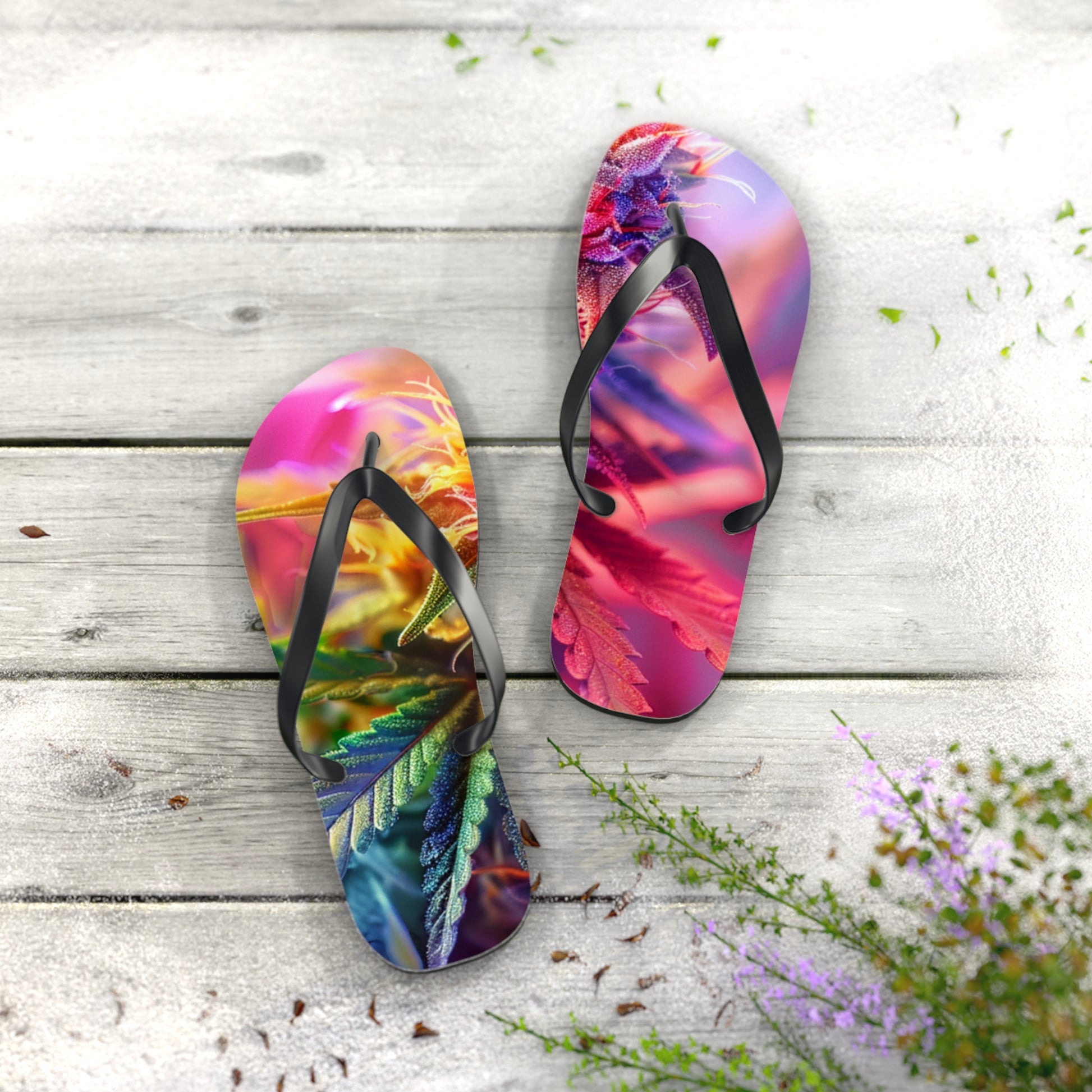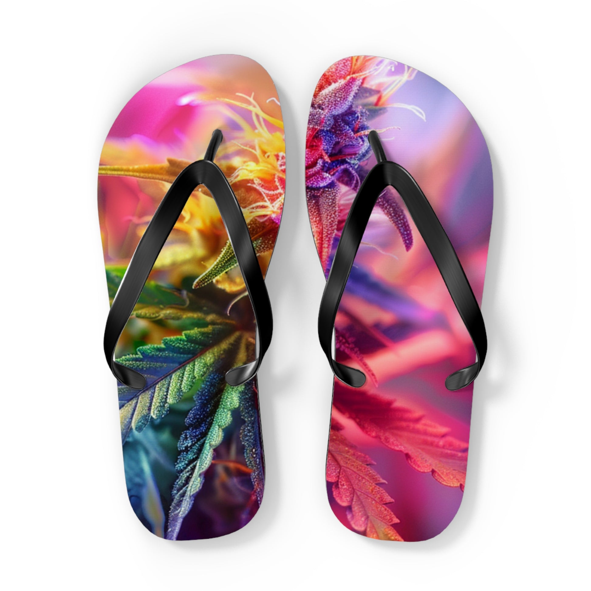 Where color meets comfort. These flip-flops feature a striking macro-art design inspired by nature’s intricate textures and vibrant gradients. The imagery plays with abstraction—blending leaflike forms and trichome-inspired details into a dreamy, prismatic landscape.