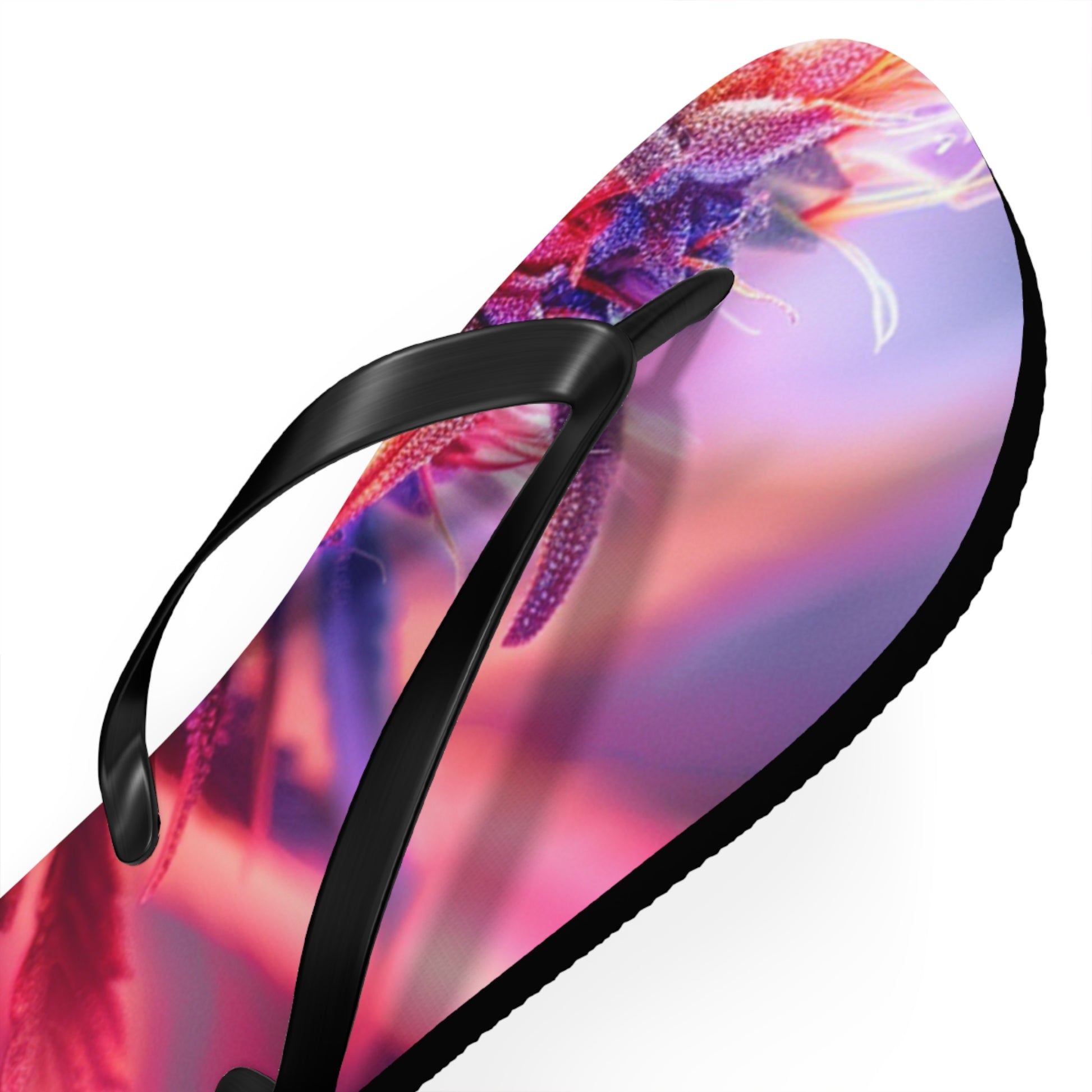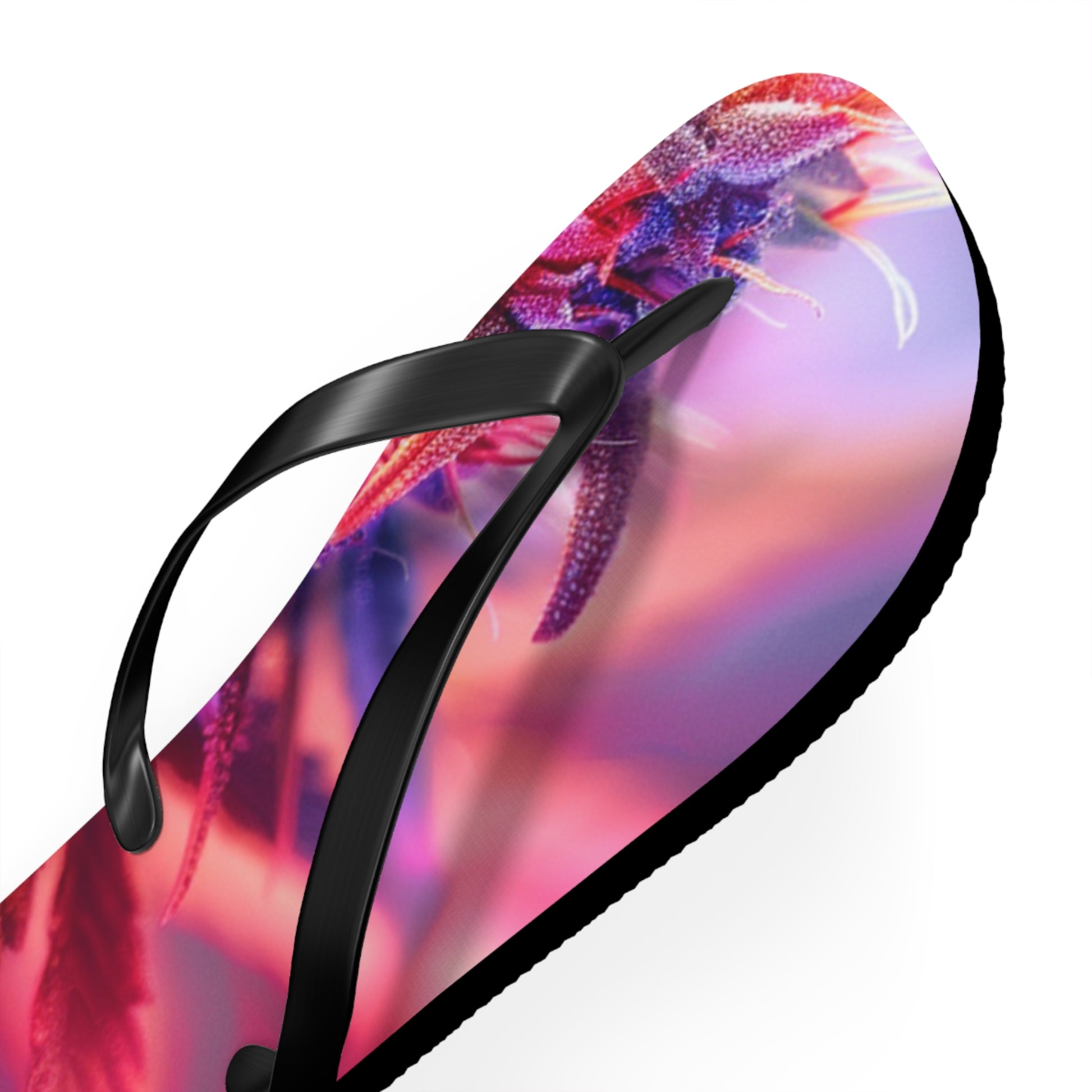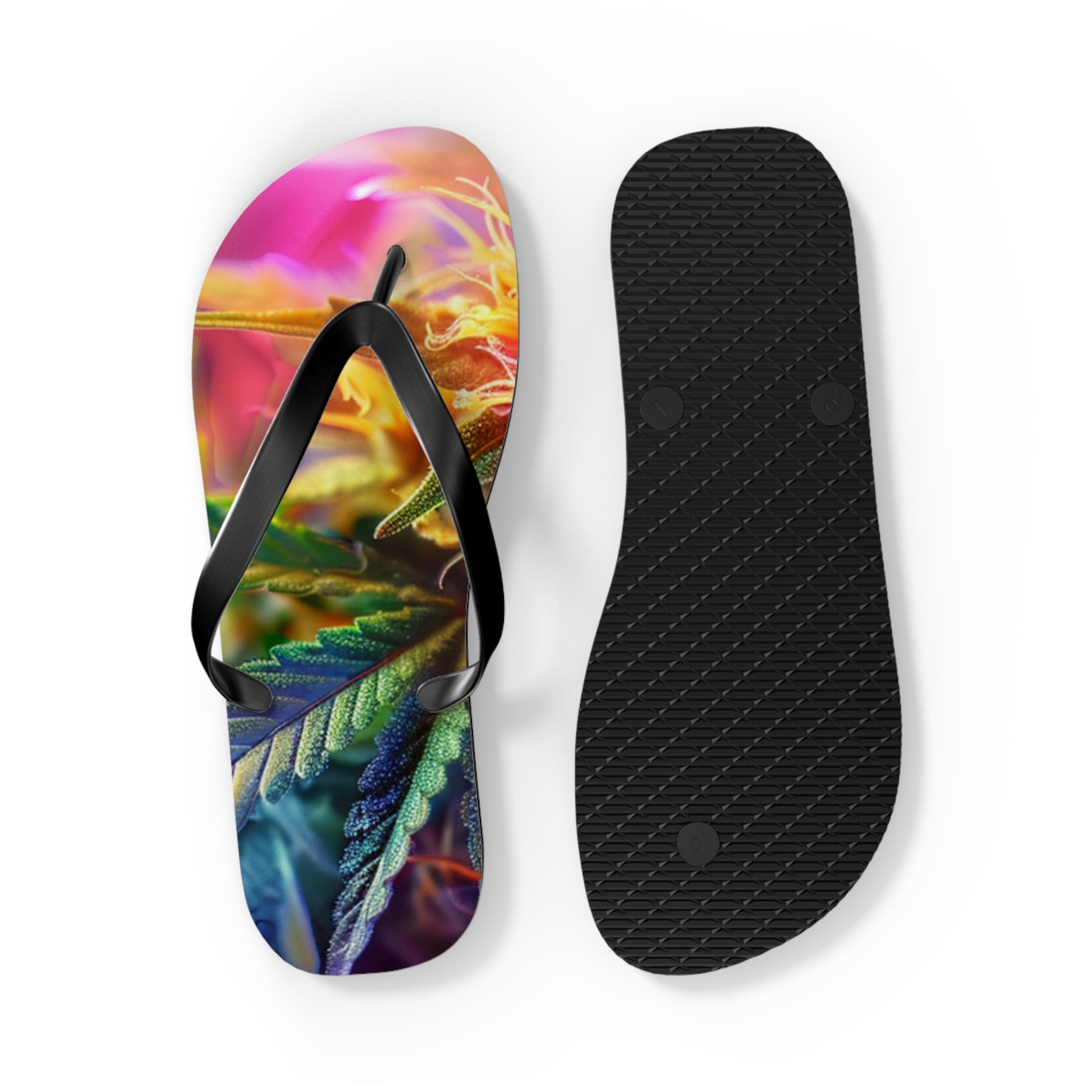Where color meets comfort. These flip-flops feature a striking macro-art design inspired by nature’s intricate textures and vibrant gradients. The imagery plays with abstraction—blending leaflike forms and trichome-inspired details into a dreamy, prismatic landscape.