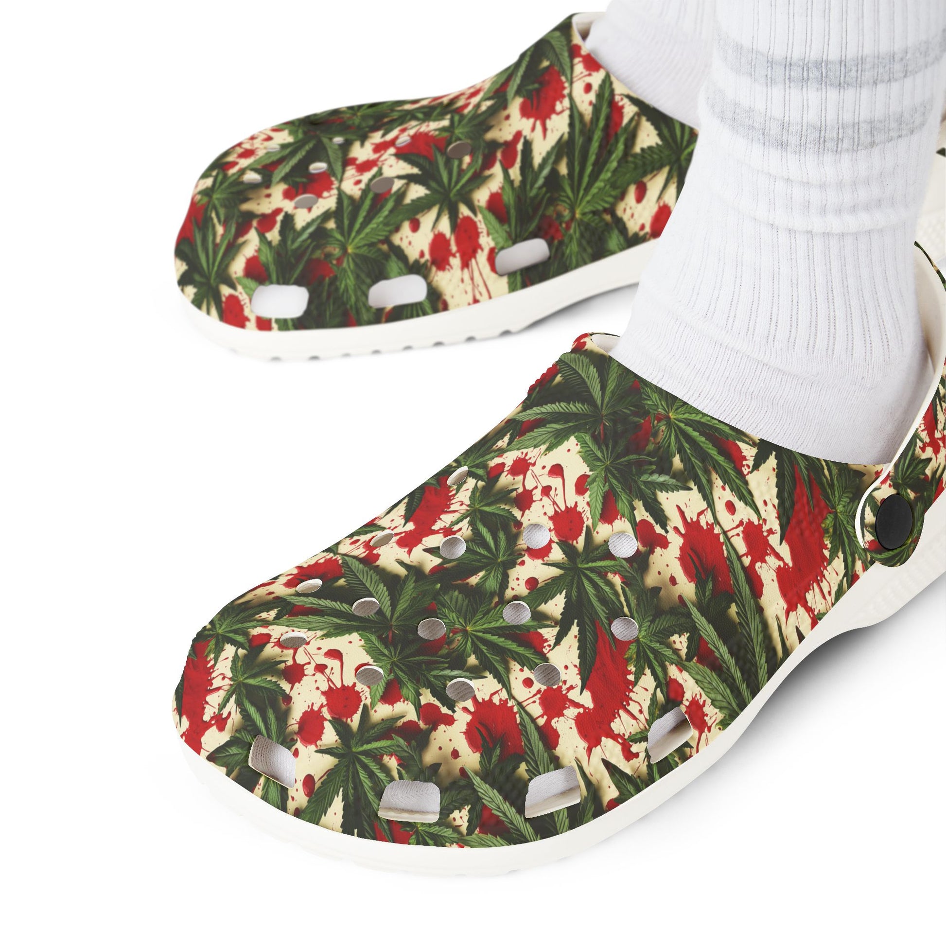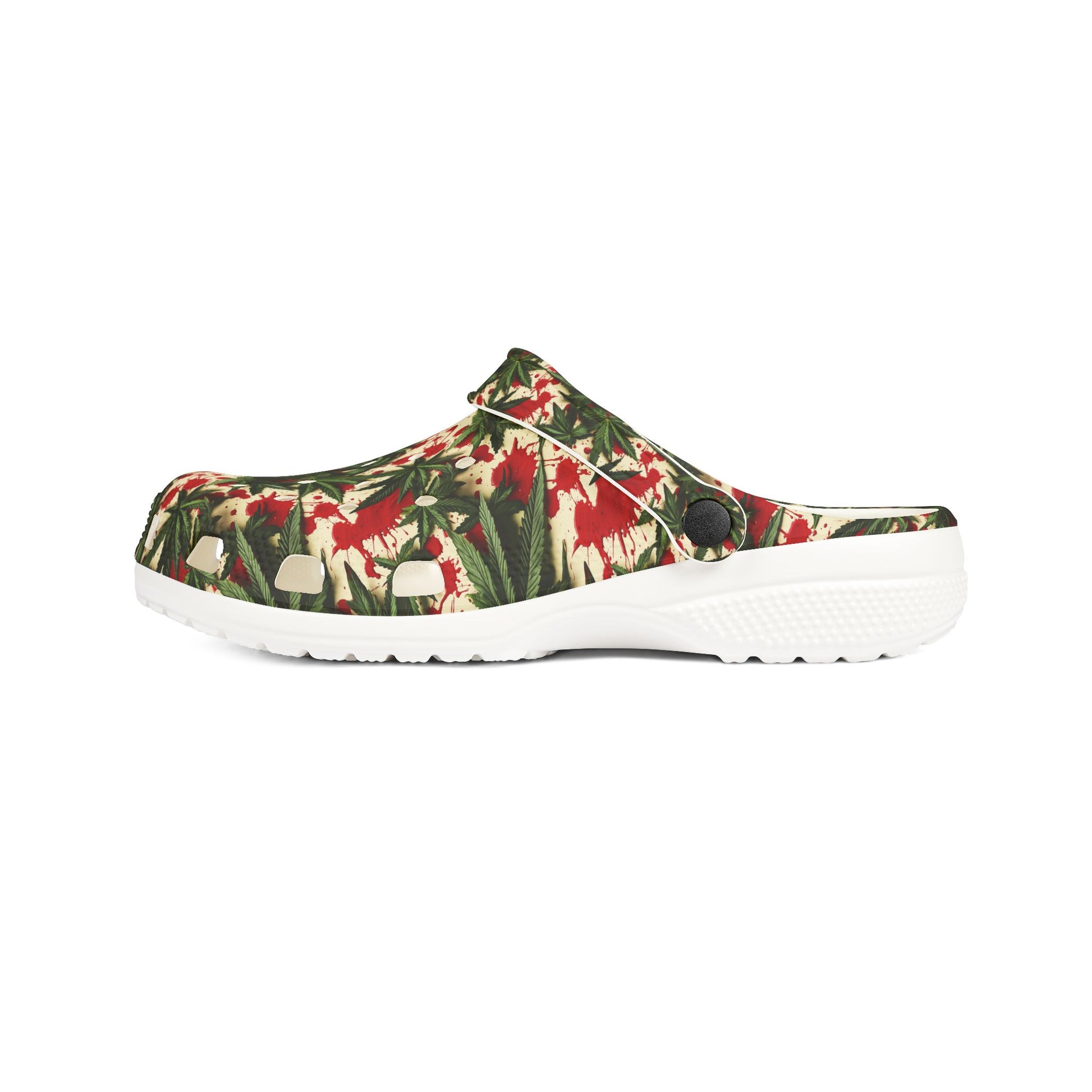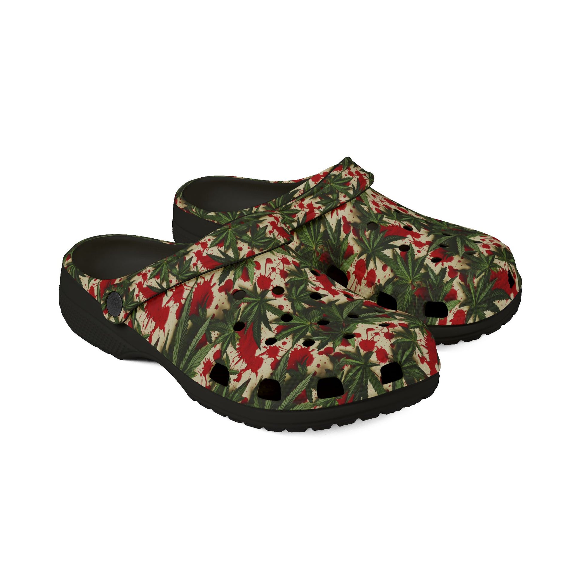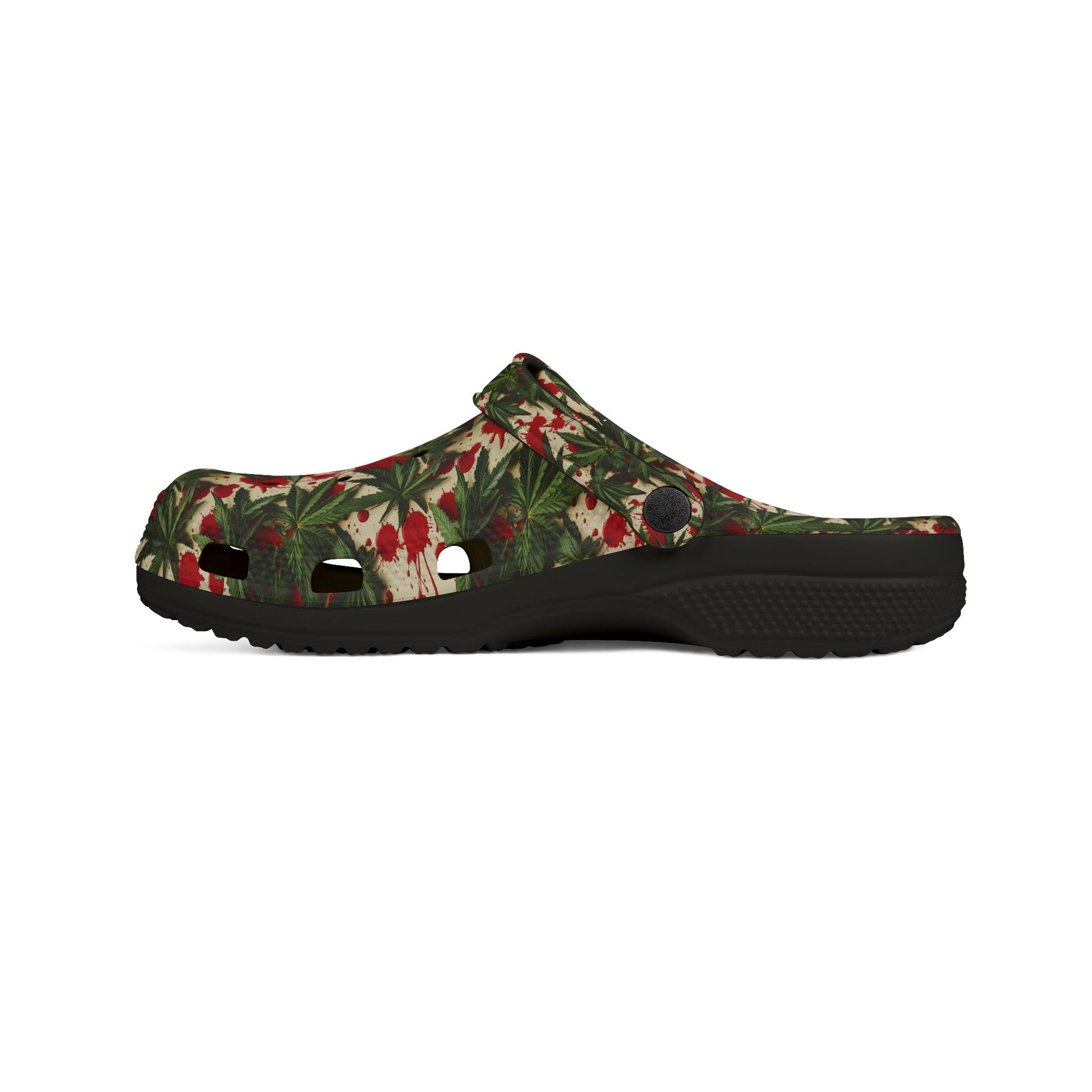 Not for the faint of heart—or the faint of haze. These crocs go full throttle with a wild collision of blood-red splatter and lush green cannabis leaves, creating a print that’s part 4/20, part horrorcore, and 100% unbothered. Whether you're stomping through a music fest, lighting up in the backyard, or just letting people know you don't play subtle, these are the kicks that make noise without saying a word.