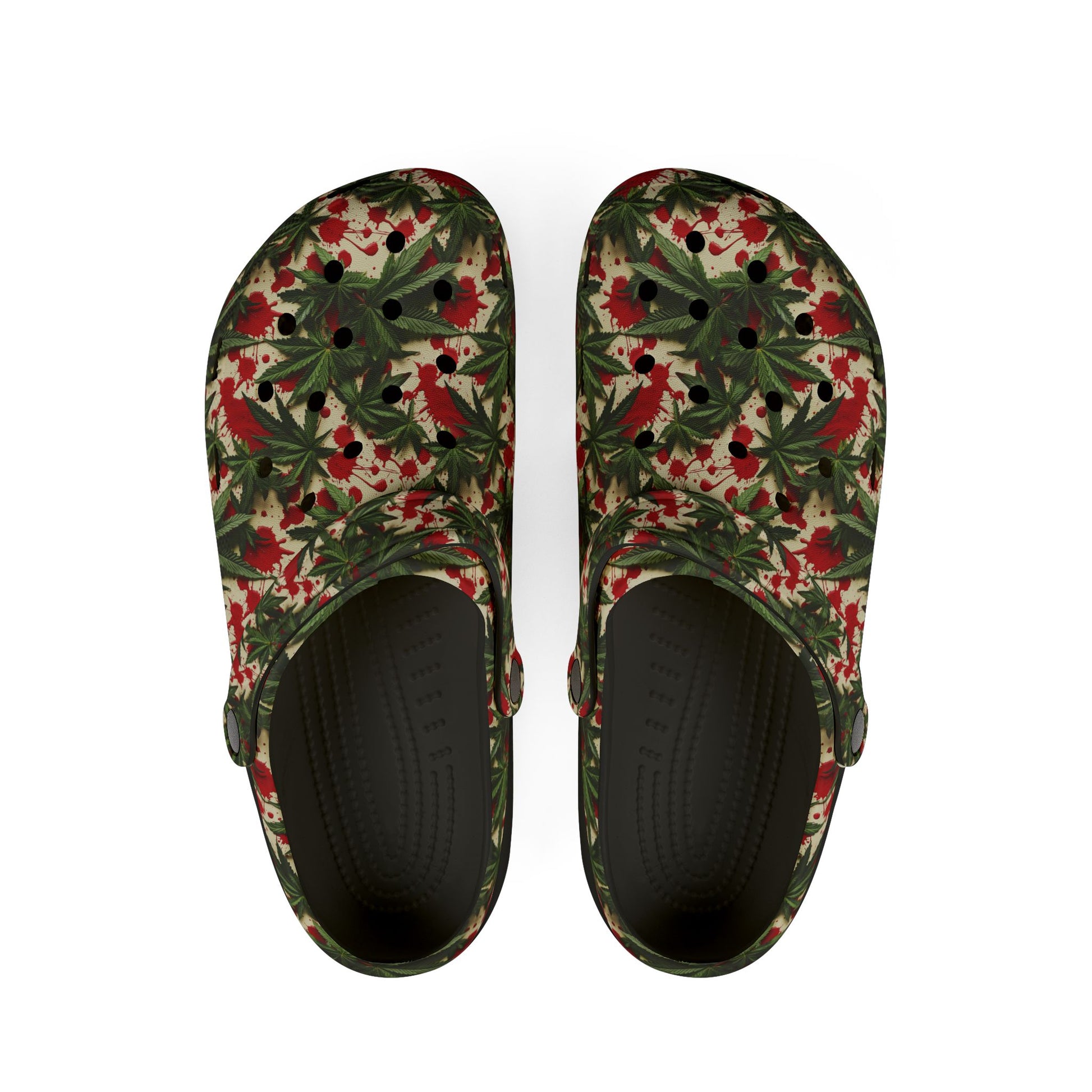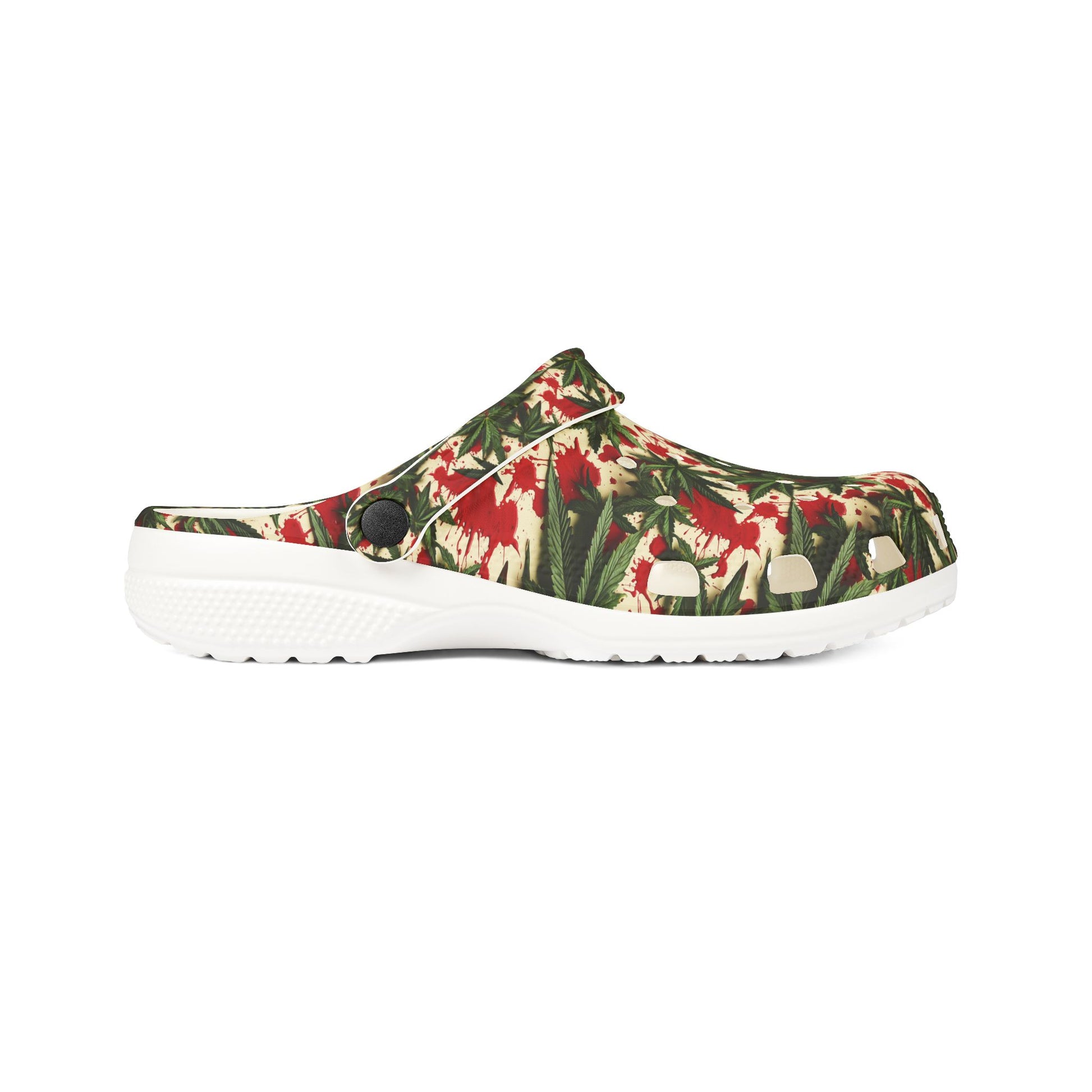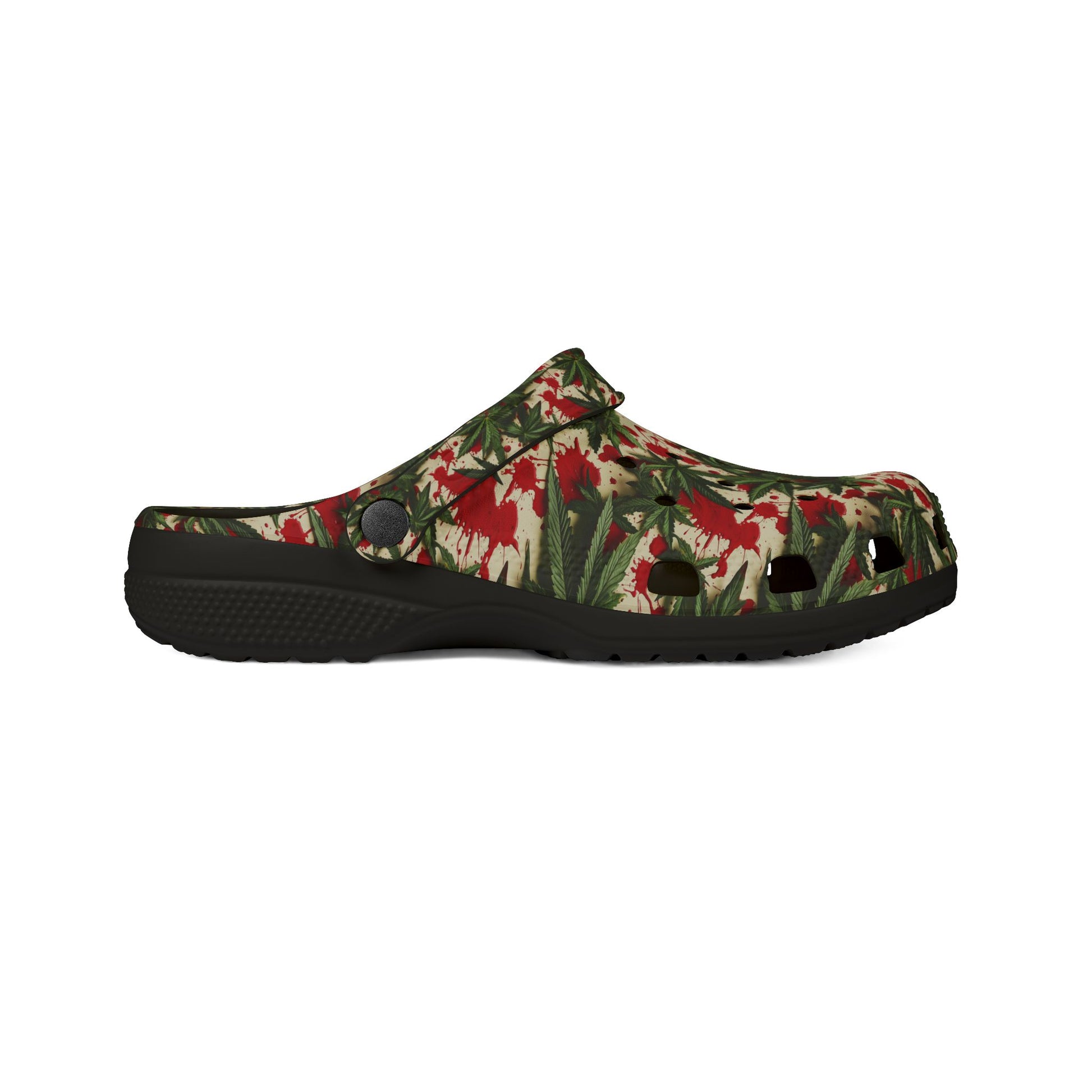 Not for the faint of heart—or the faint of haze. These crocs go full throttle with a wild collision of blood-red splatter and lush green cannabis leaves, creating a print that’s part 4/20, part horrorcore, and 100% unbothered. Whether you're stomping through a music fest, lighting up in the backyard, or just letting people know you don't play subtle, these are the kicks that make noise without saying a word.