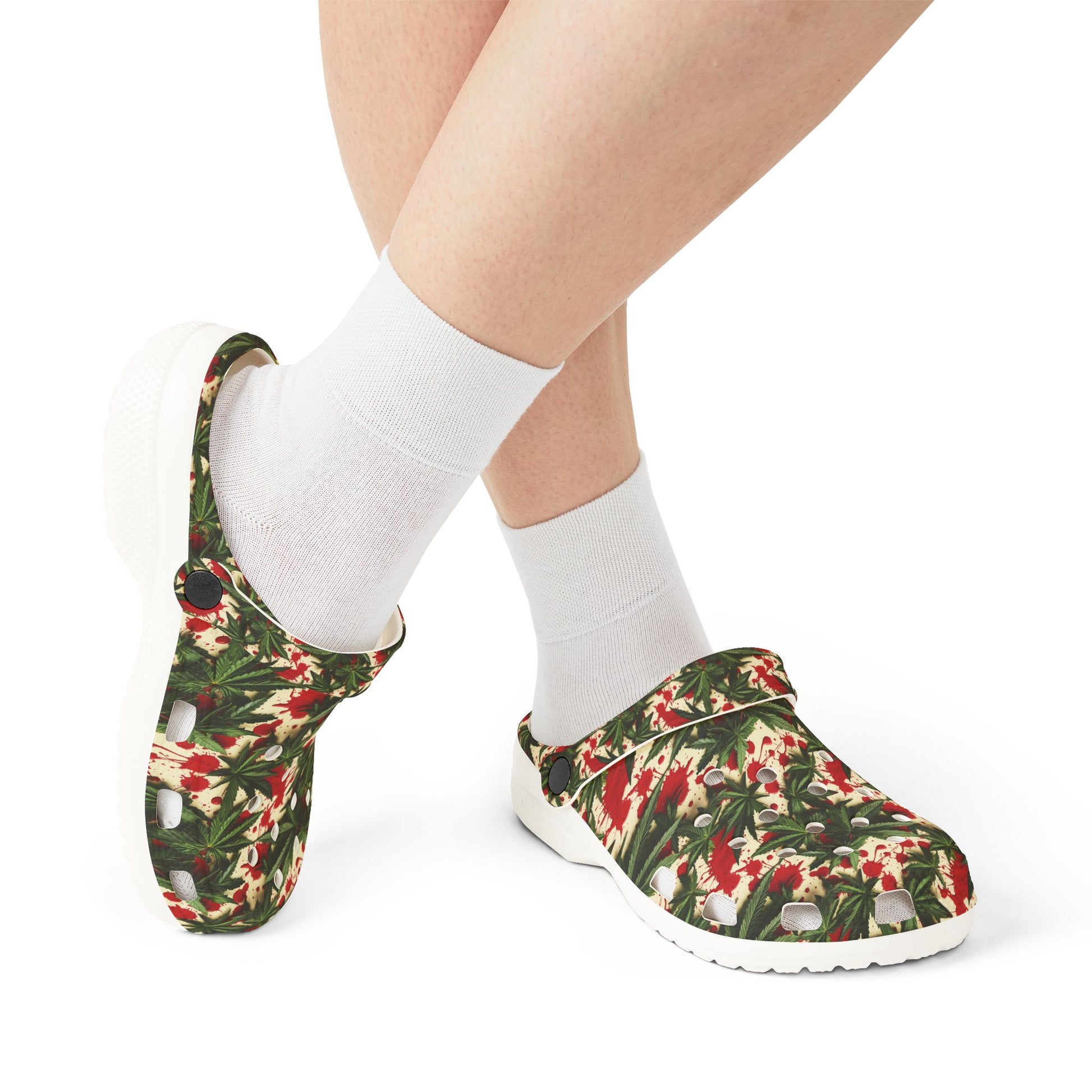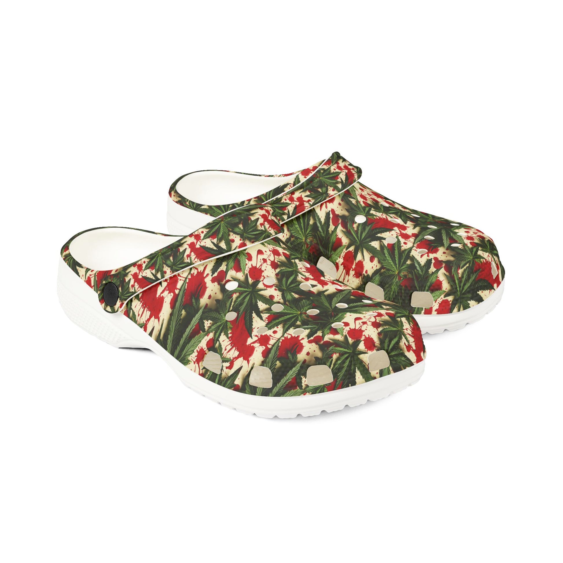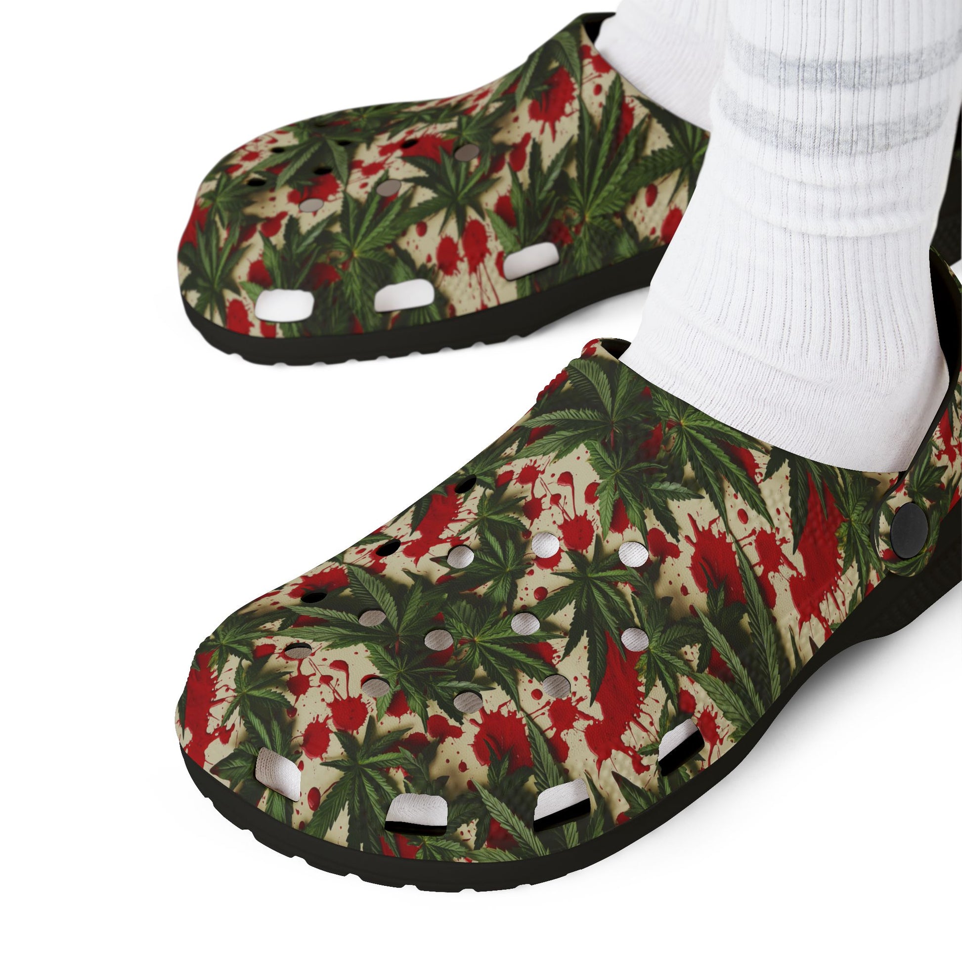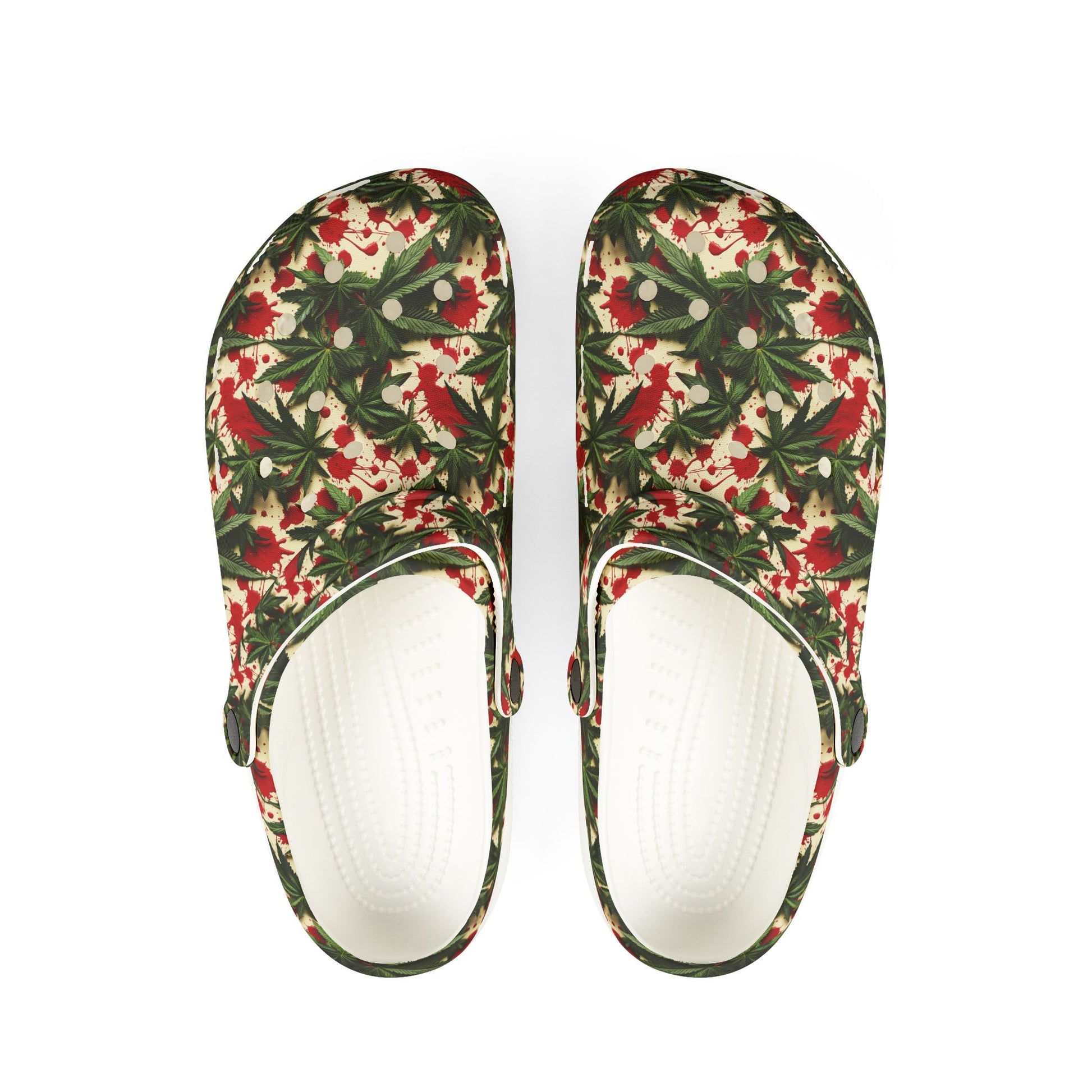 Not for the faint of heart—or the faint of haze. These crocs go full throttle with a wild collision of blood-red splatter and lush green cannabis leaves, creating a print that’s part 4/20, part horrorcore, and 100% unbothered. Whether you're stomping through a music fest, lighting up in the backyard, or just letting people know you don't play subtle, these are the kicks that make noise without saying a word.