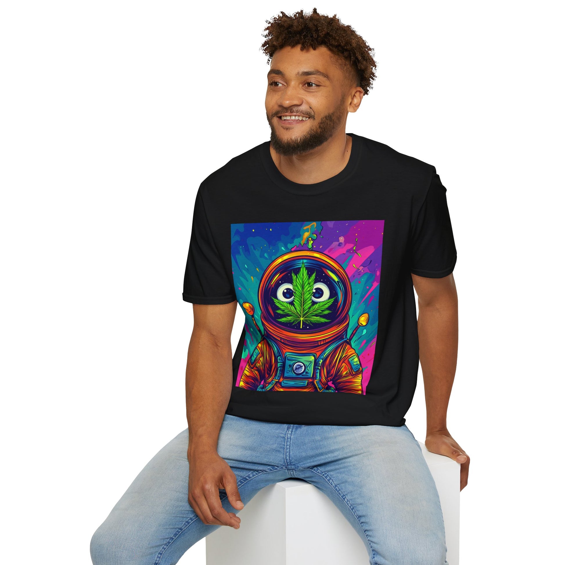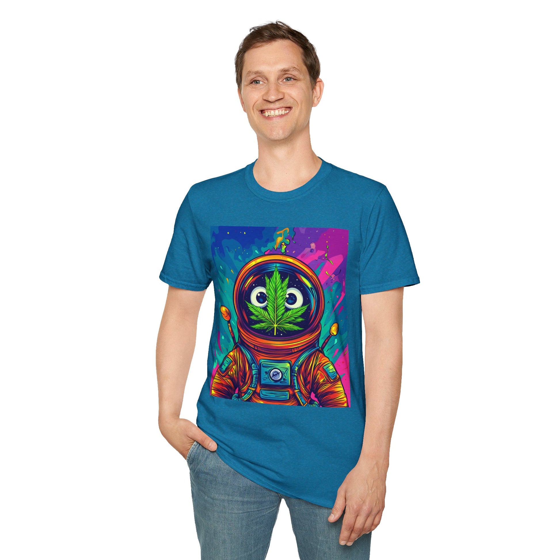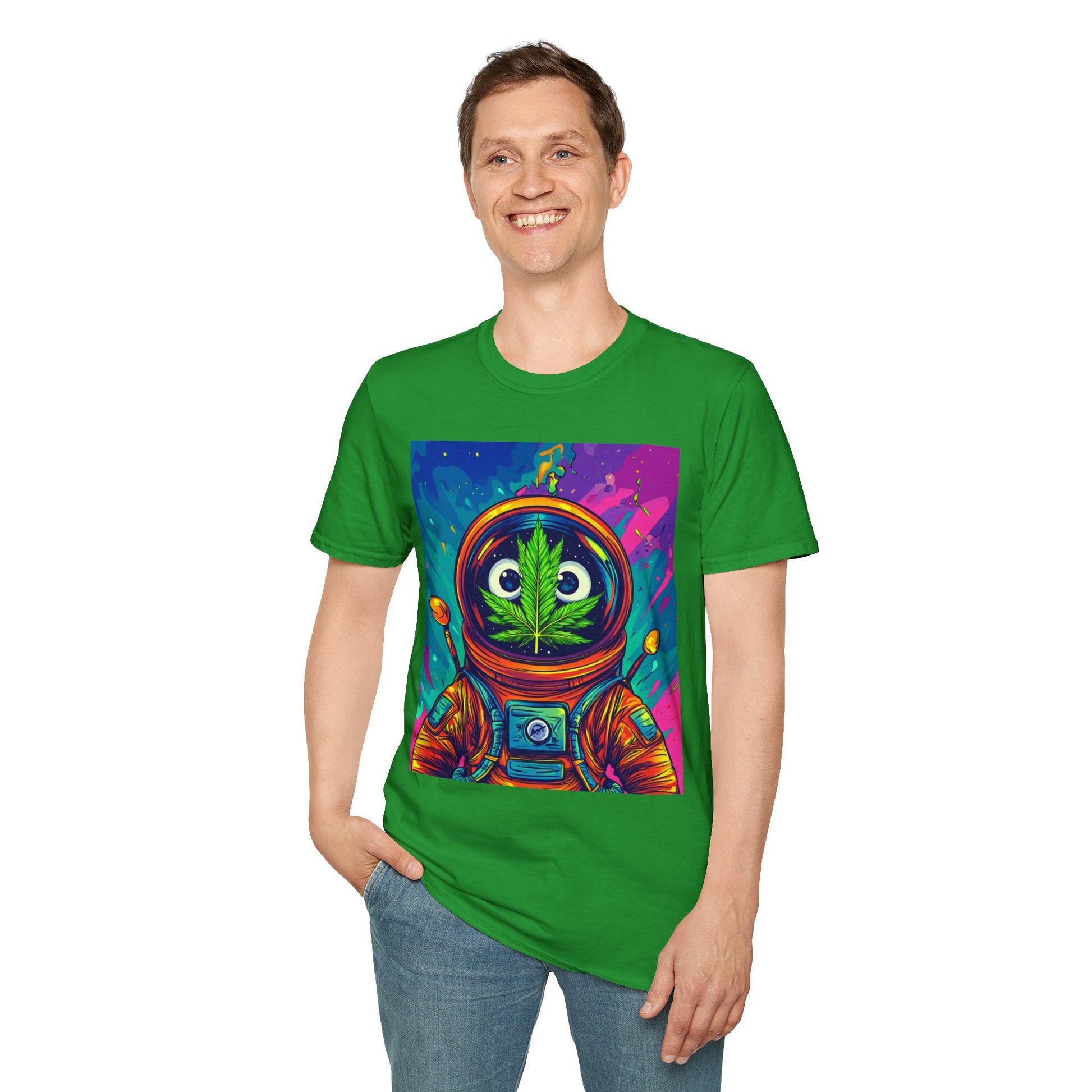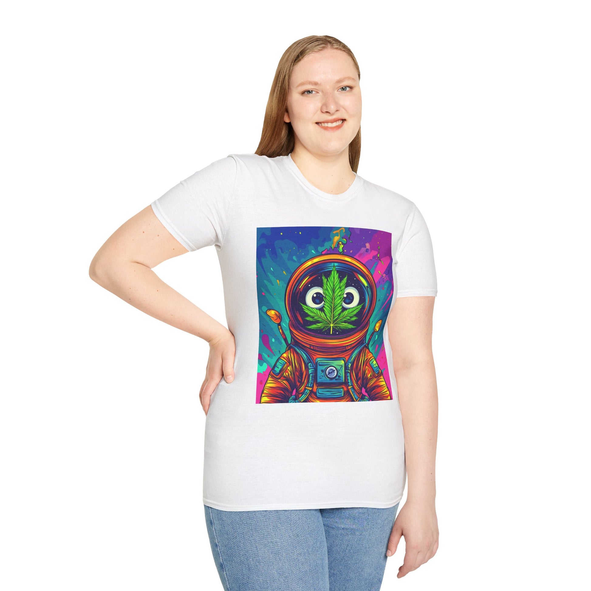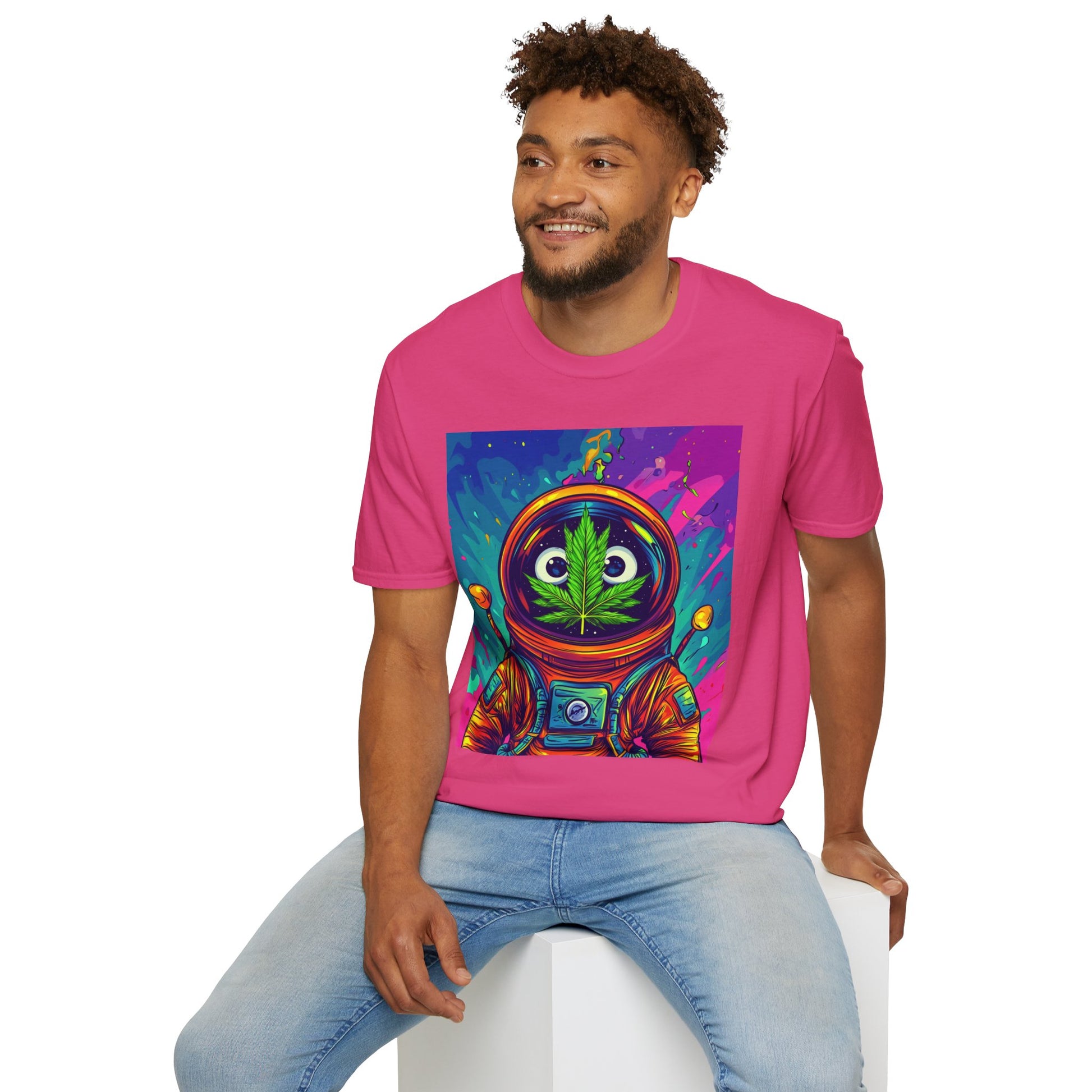Suit up for a cosmic cruise in this out-of-this-world crewneck featuring a wide-eyed space traveler with a leafy secret. Drenched in vibrant neon and intergalactic drips, this sweatshirt is for the dreamers, explorers, and stoners who know that sometimes the best trips happen in zero gravity.