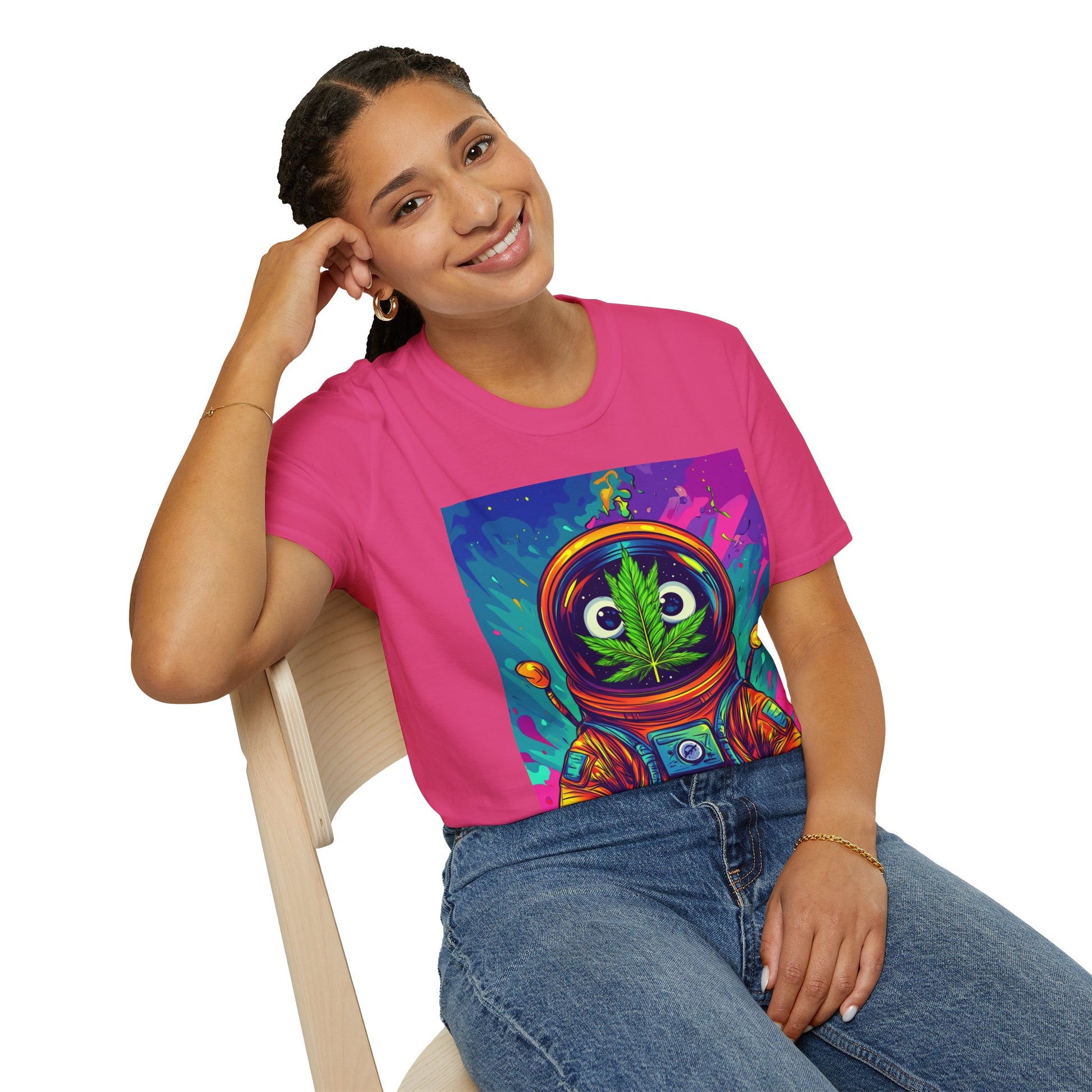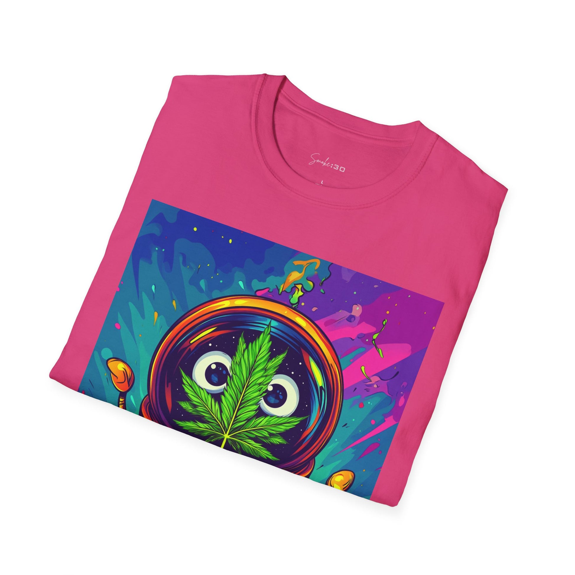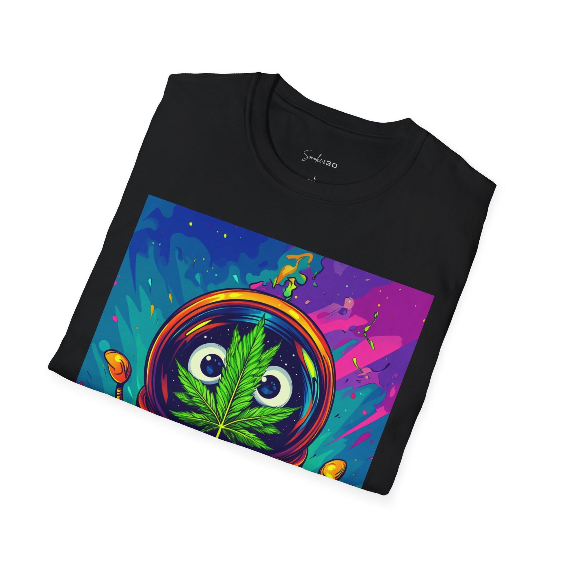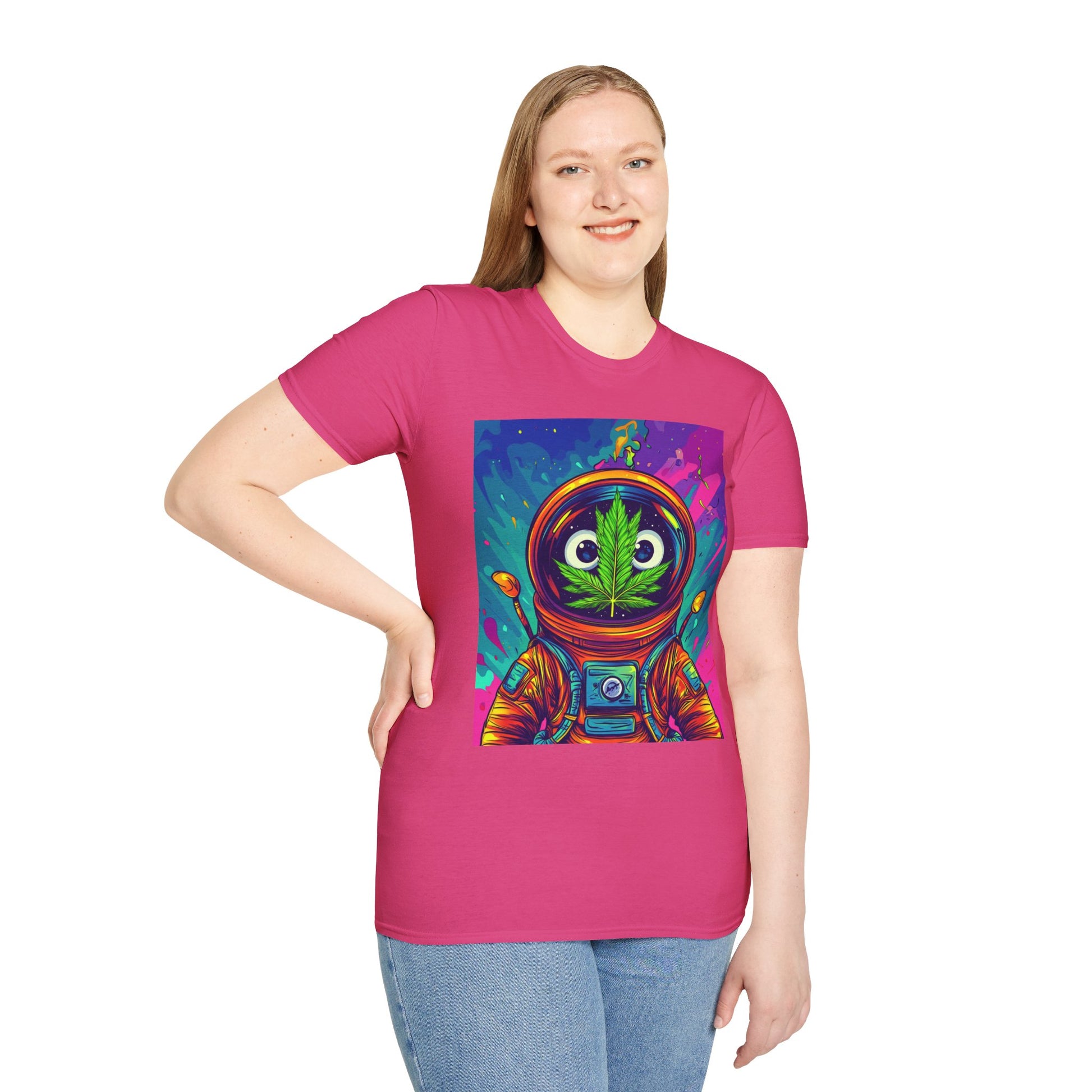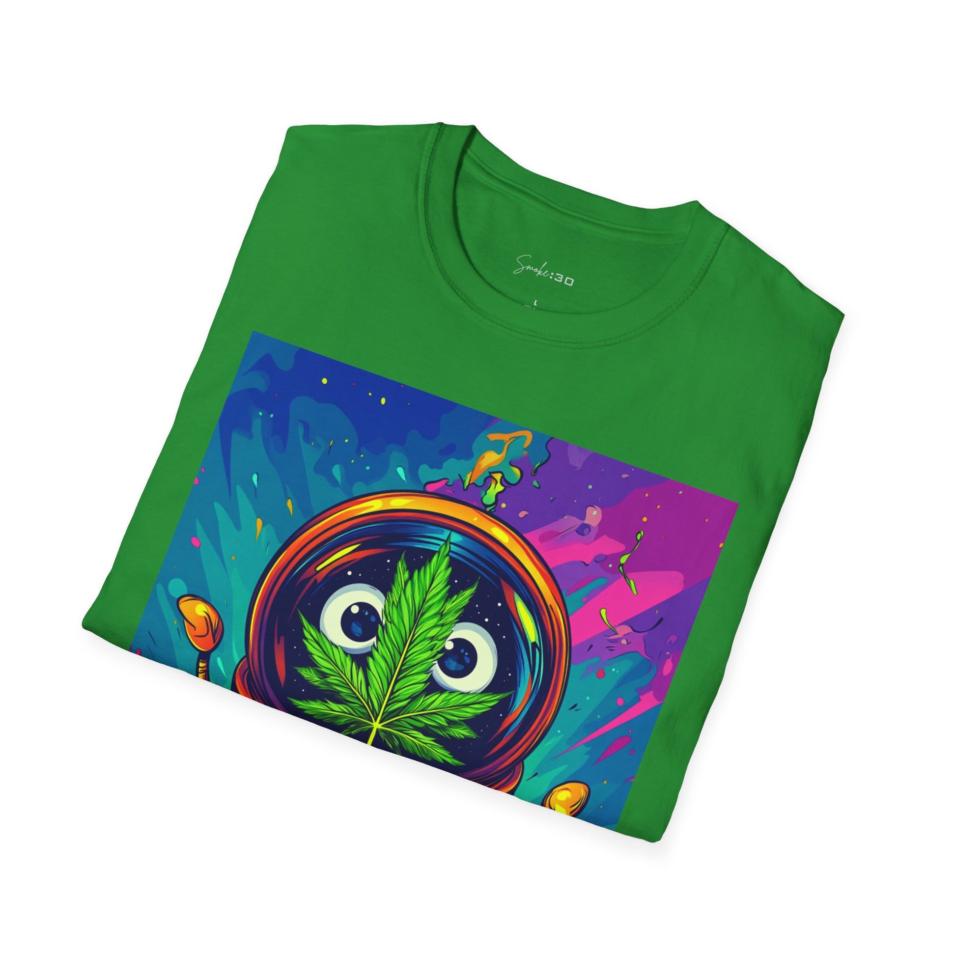 Suit up for a cosmic cruise in this out-of-this-world crewneck featuring a wide-eyed space traveler with a leafy secret. Drenched in vibrant neon and intergalactic drips, this sweatshirt is for the dreamers, explorers, and stoners who know that sometimes the best trips happen in zero gravity.
