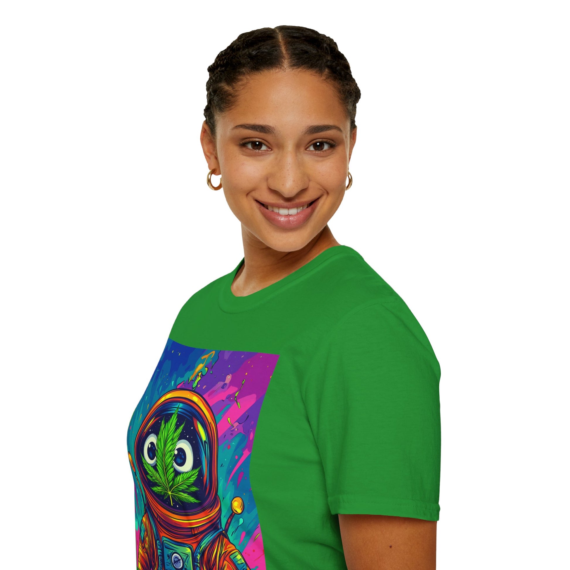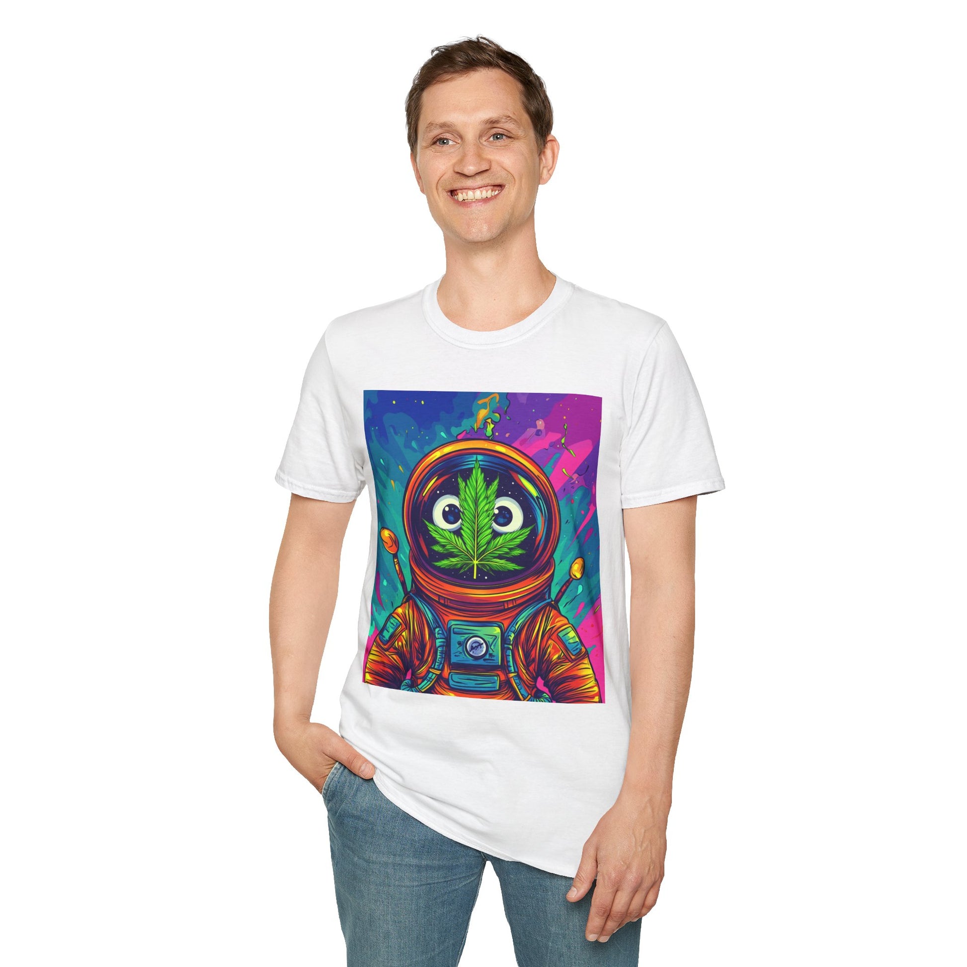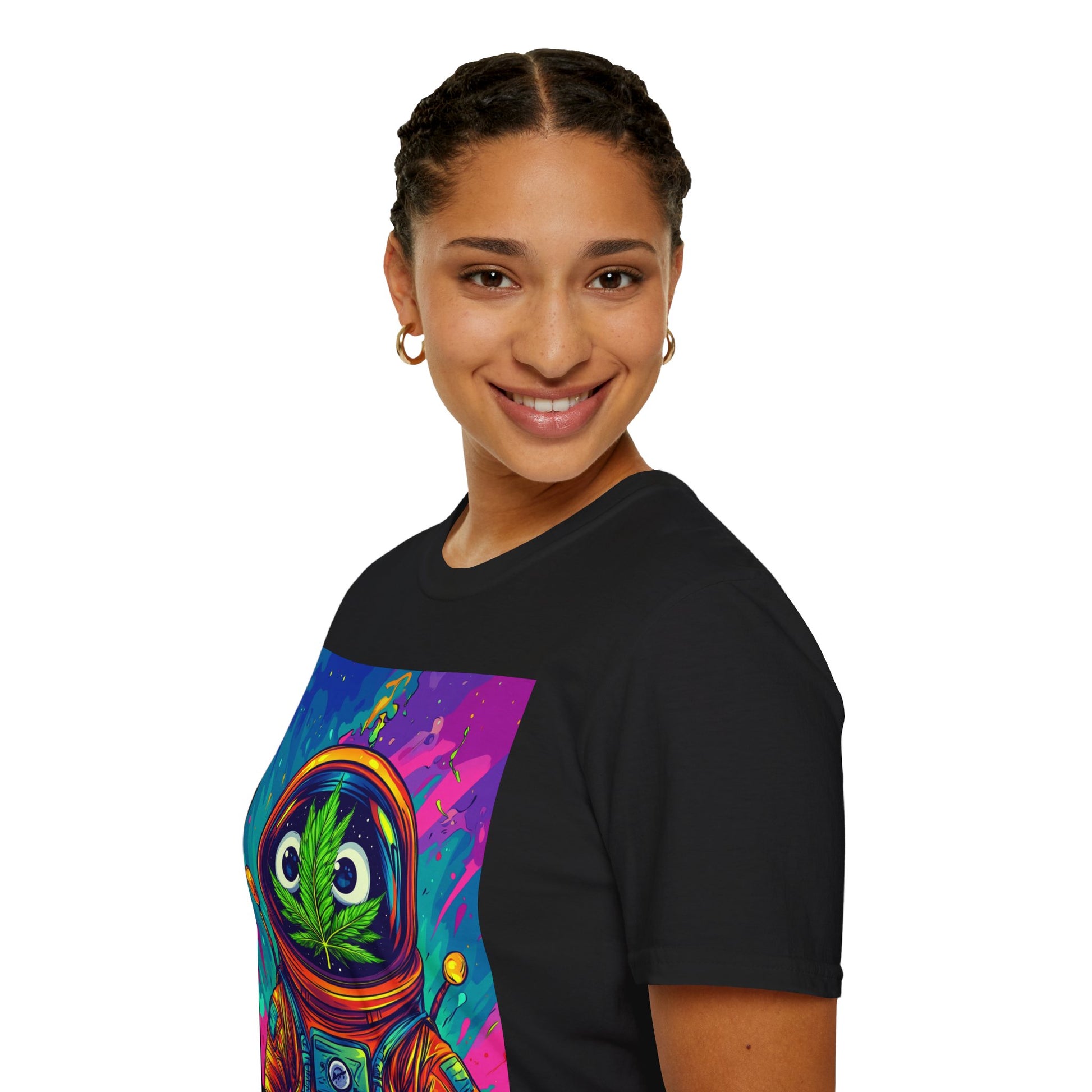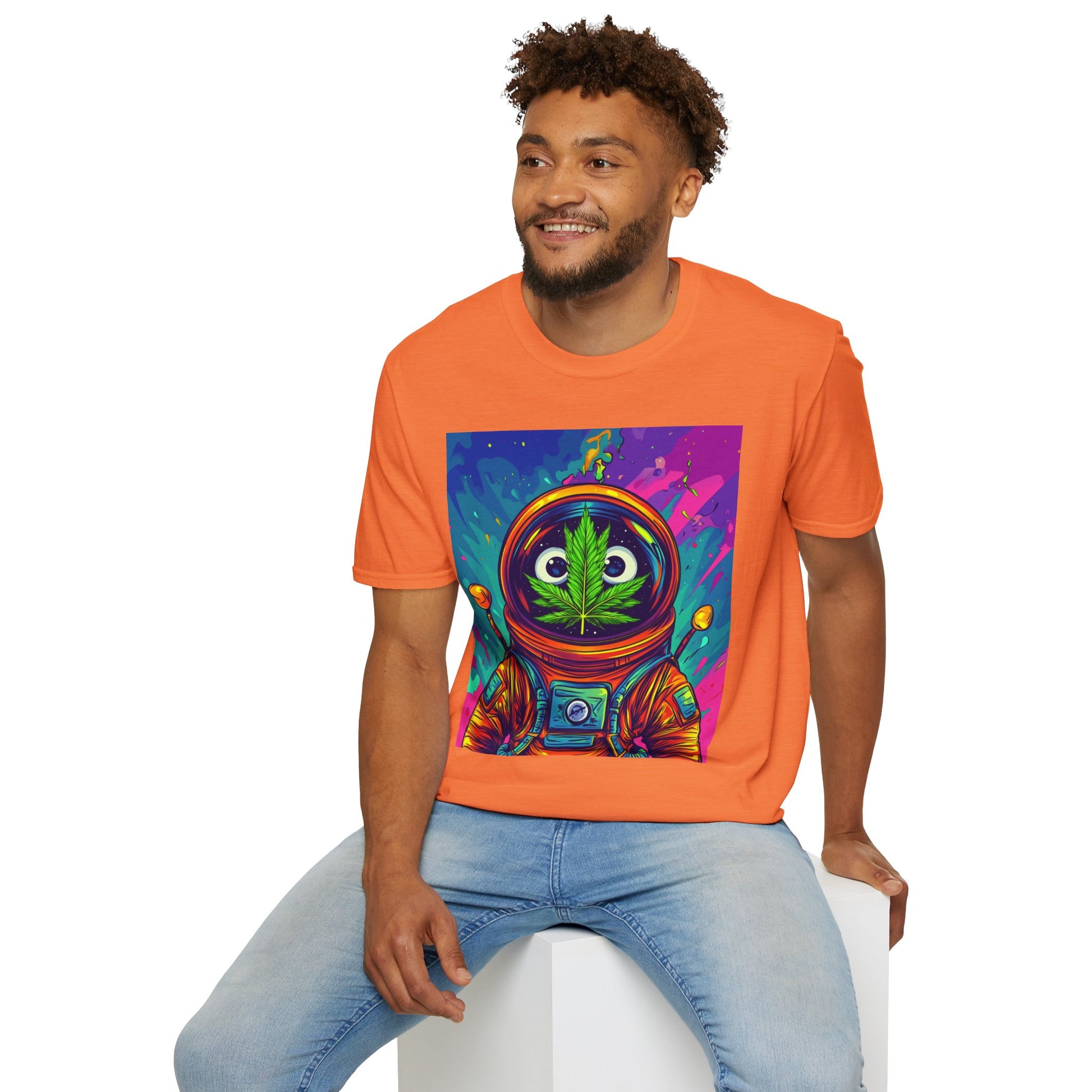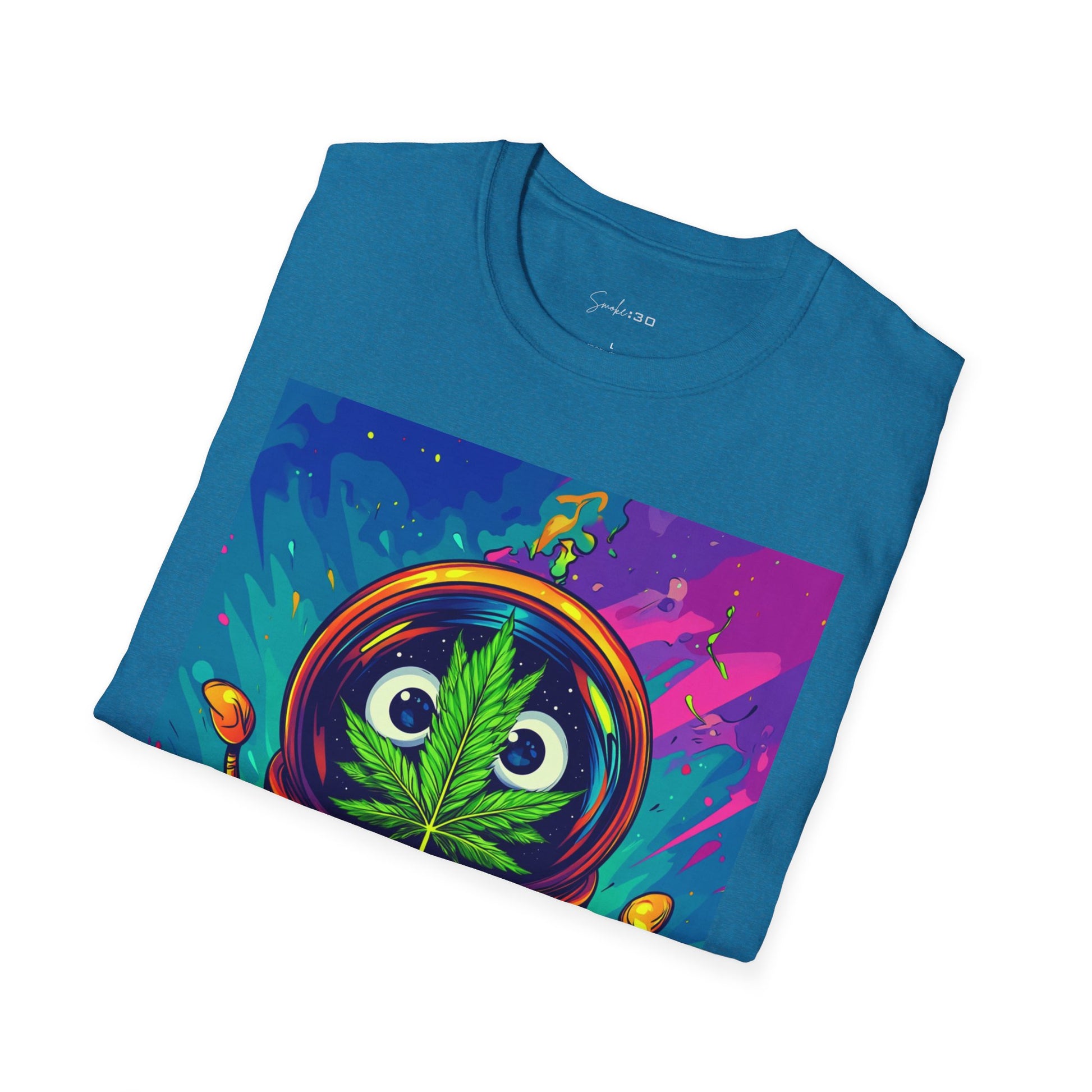 Suit up for a cosmic cruise in this out-of-this-world crewneck featuring a wide-eyed space traveler with a leafy secret. Drenched in vibrant neon and intergalactic drips, this sweatshirt is for the dreamers, explorers, and stoners who know that sometimes the best trips happen in zero gravity.