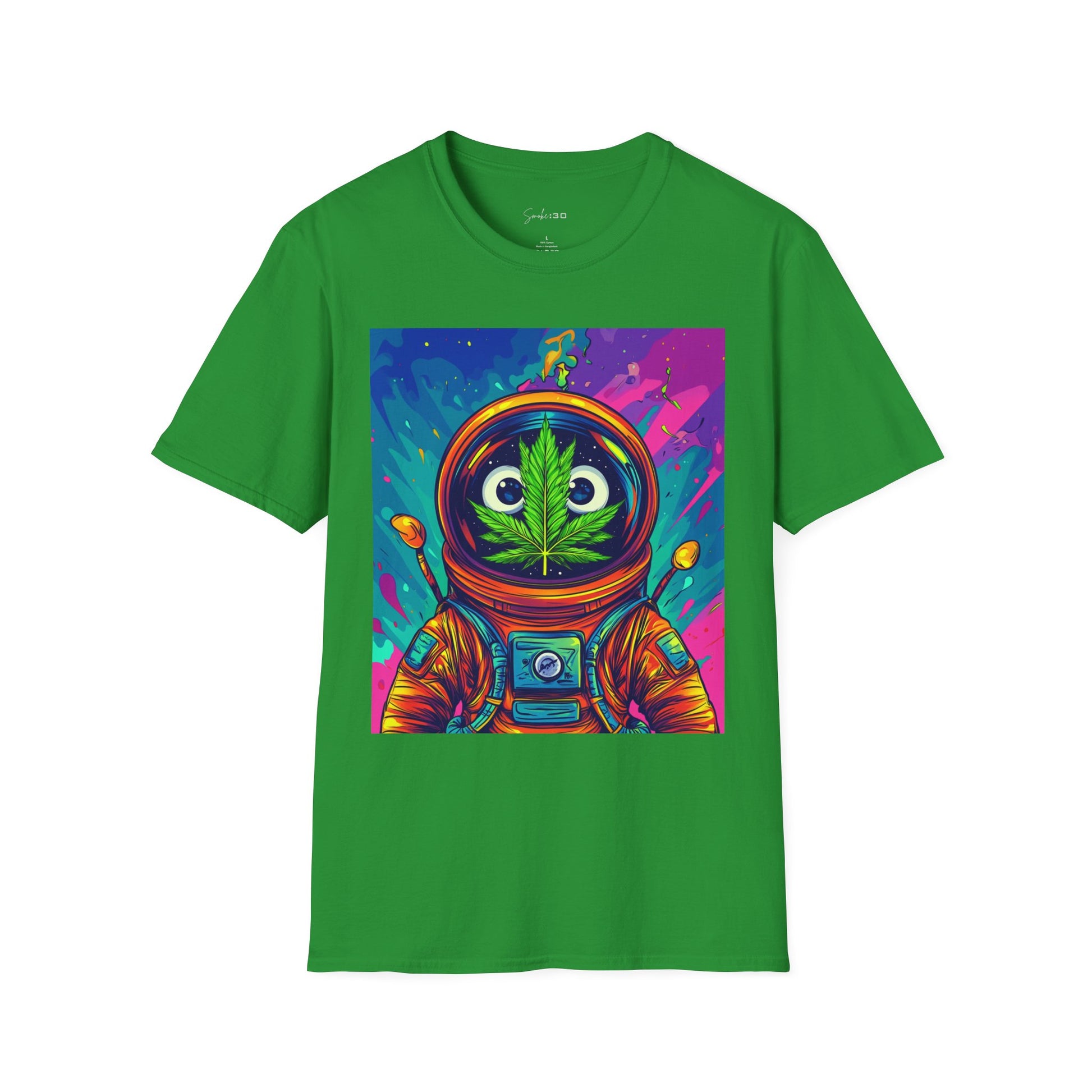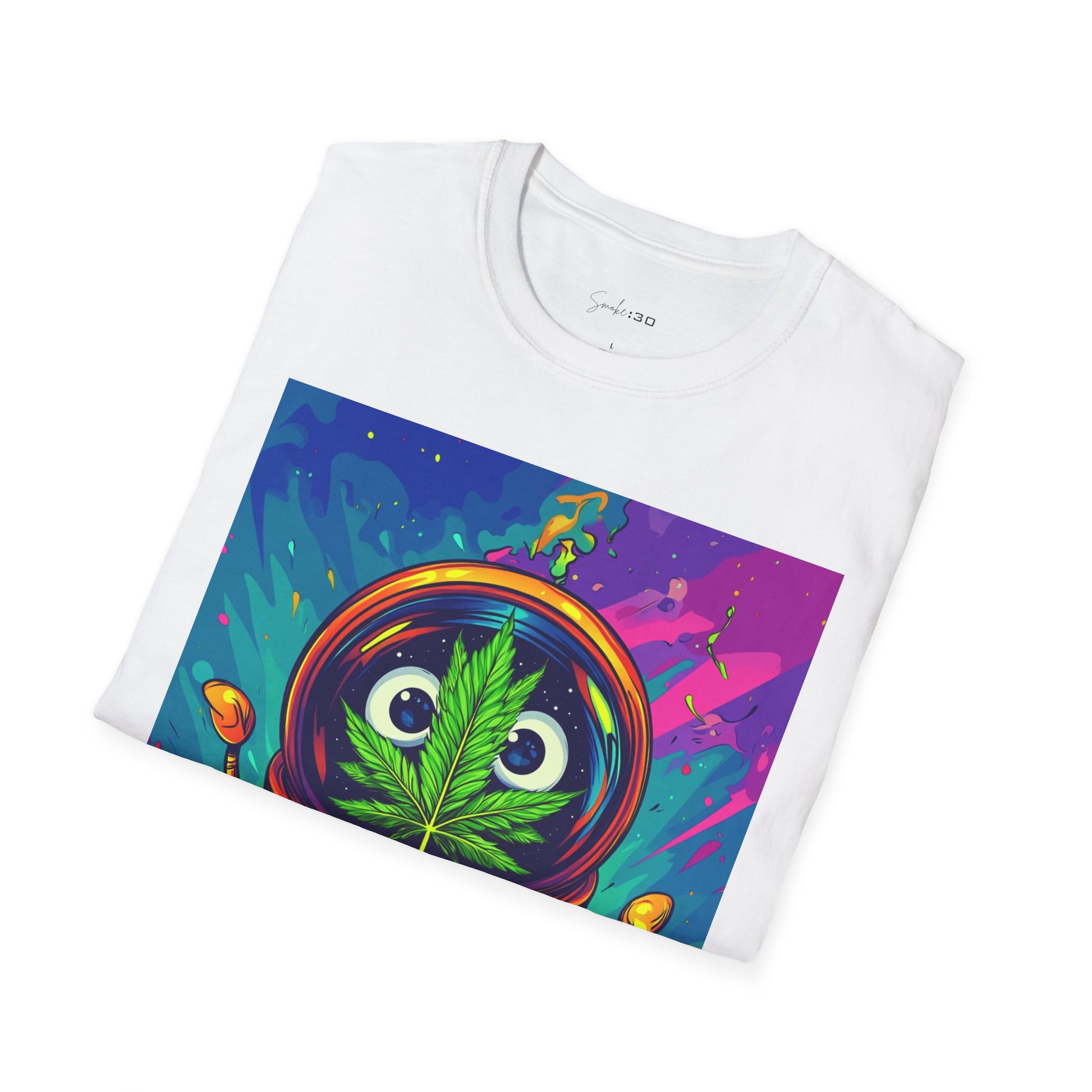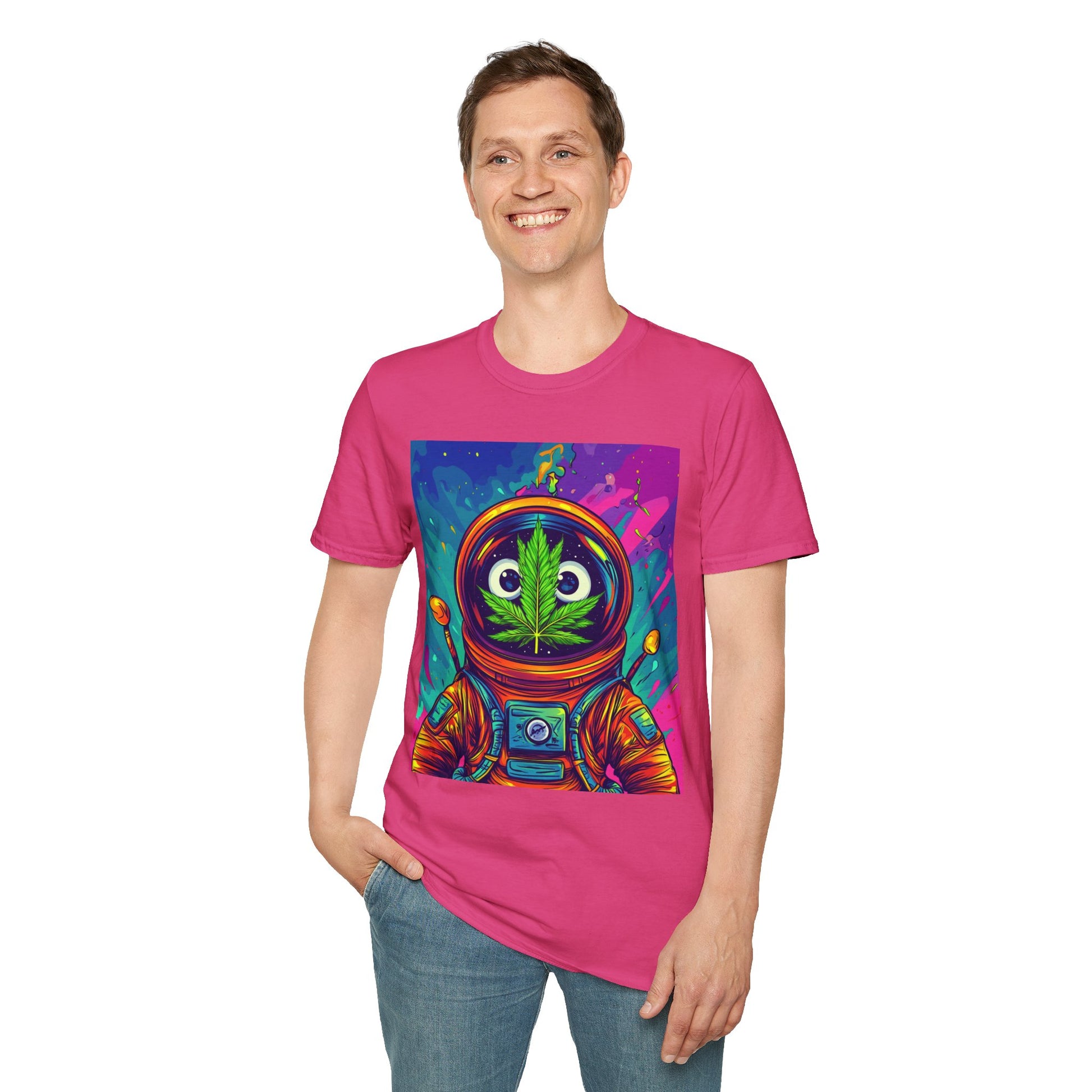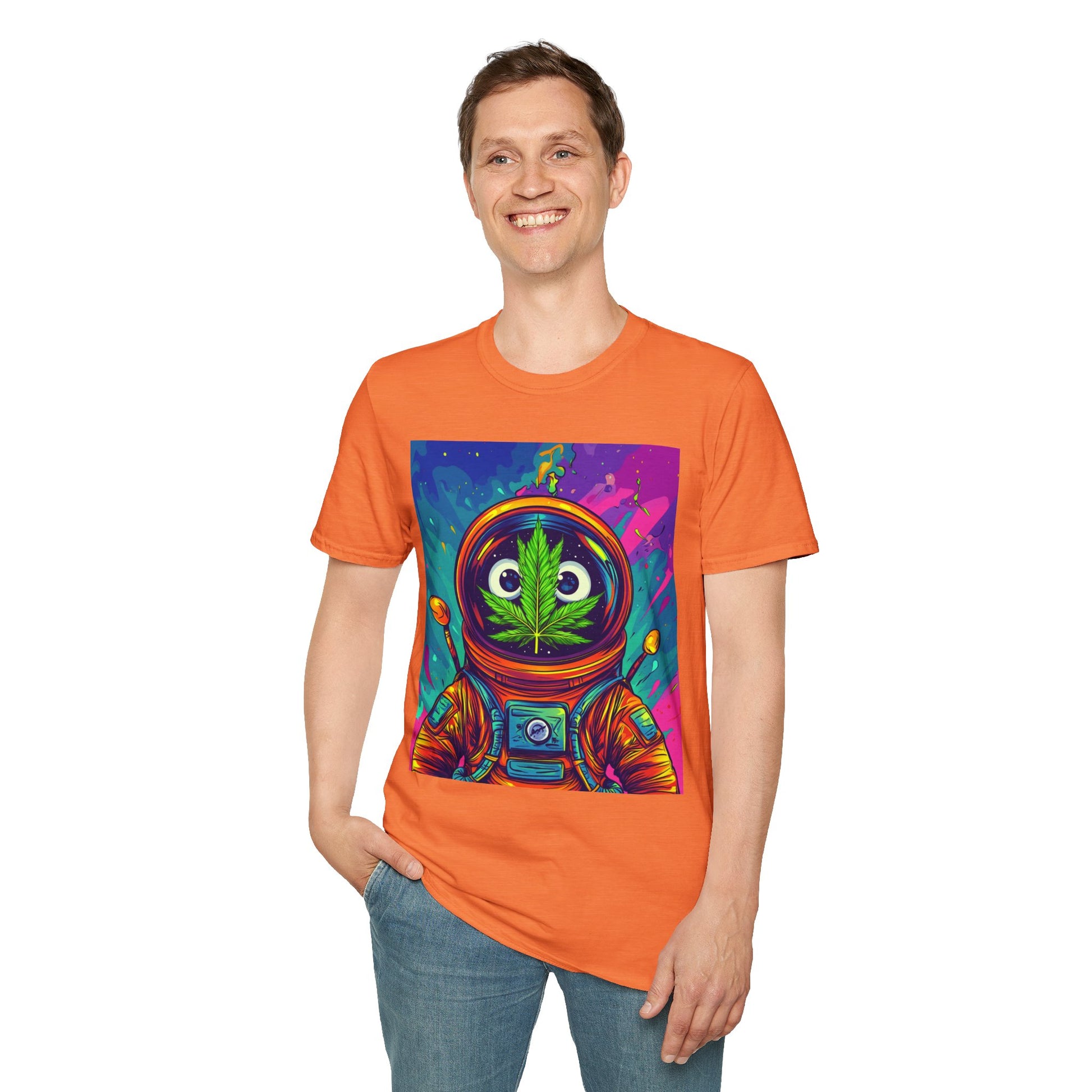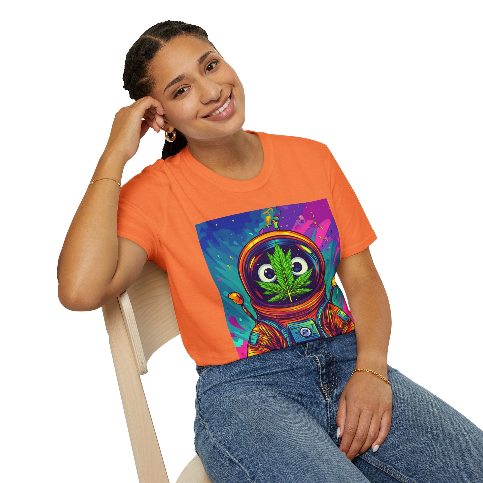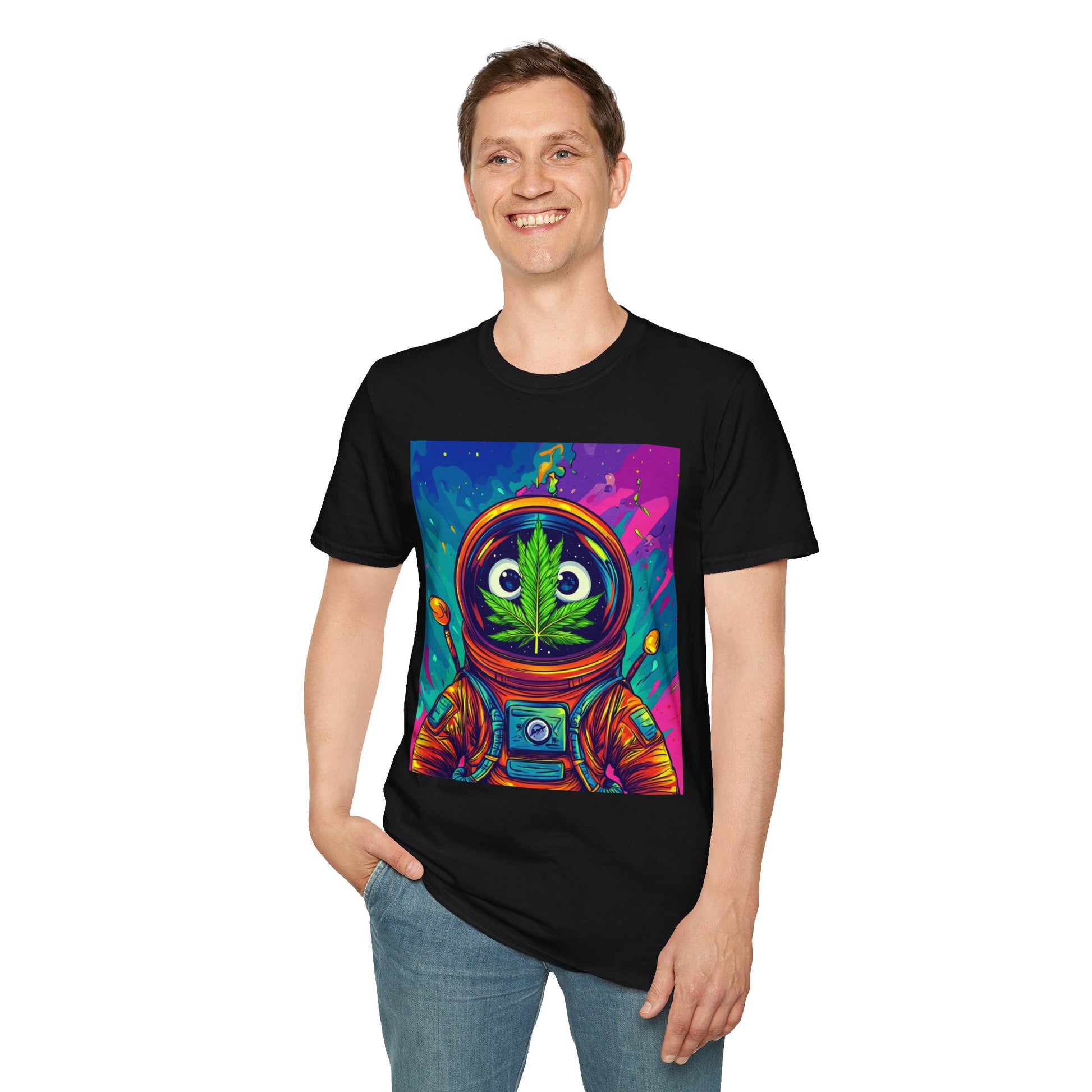 Suit up for a cosmic cruise in this out-of-this-world crewneck featuring a wide-eyed space traveler with a leafy secret. Drenched in vibrant neon and intergalactic drips, this sweatshirt is for the dreamers, explorers, and stoners who know that sometimes the best trips happen in zero gravity.