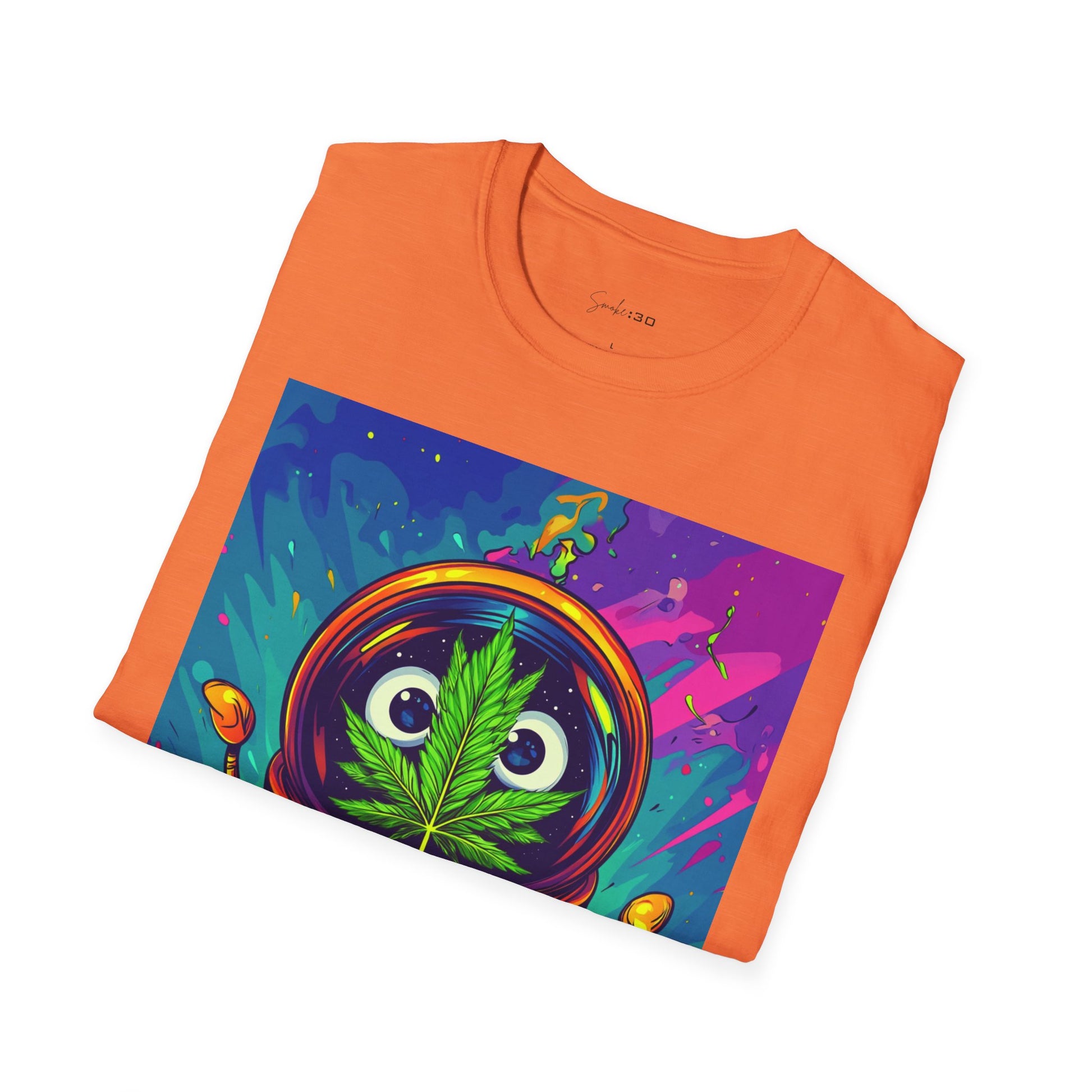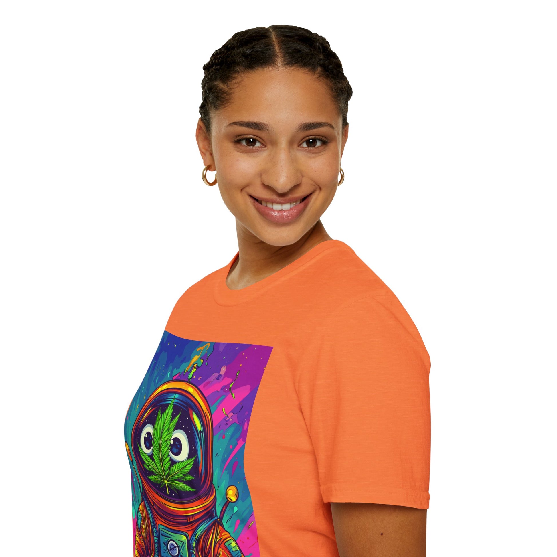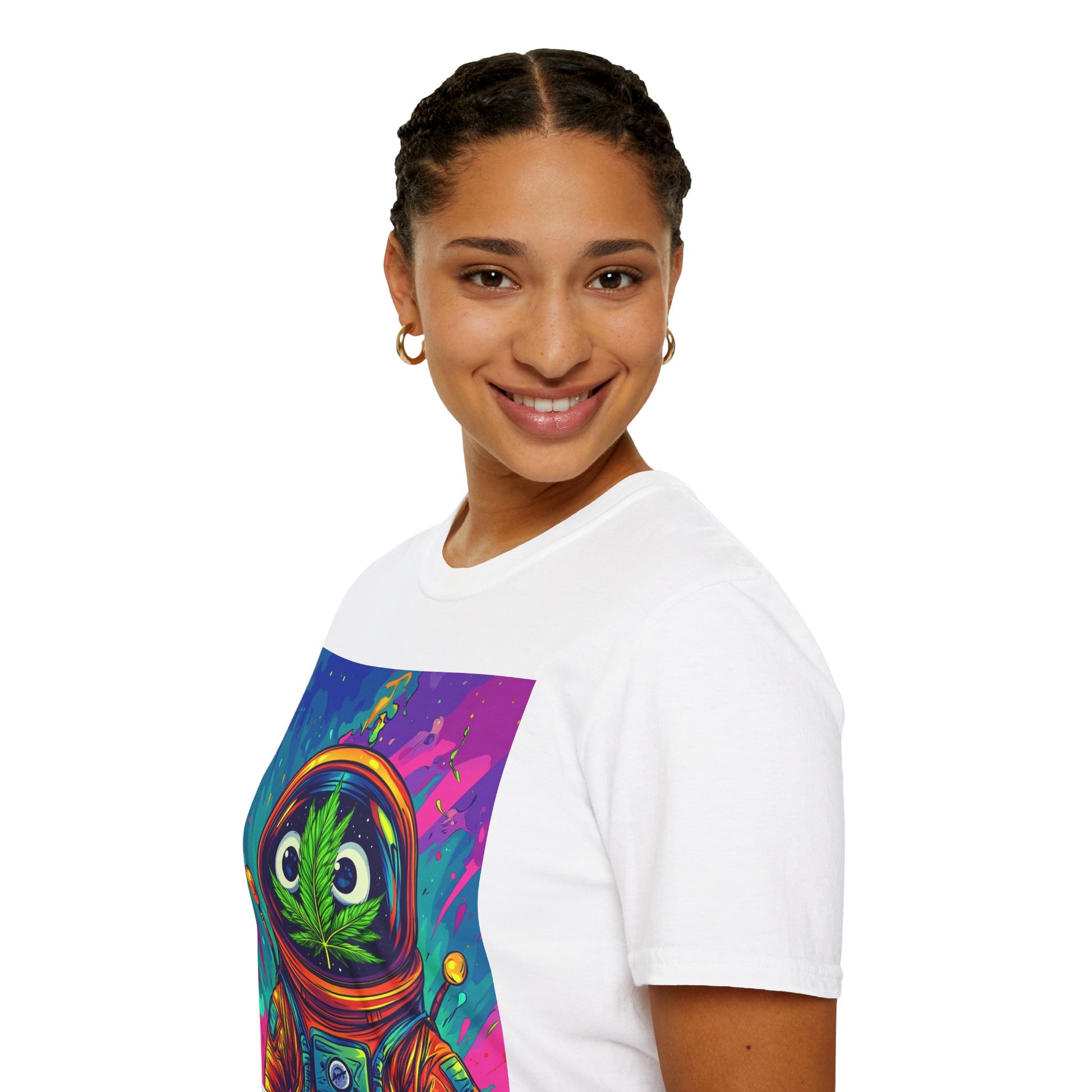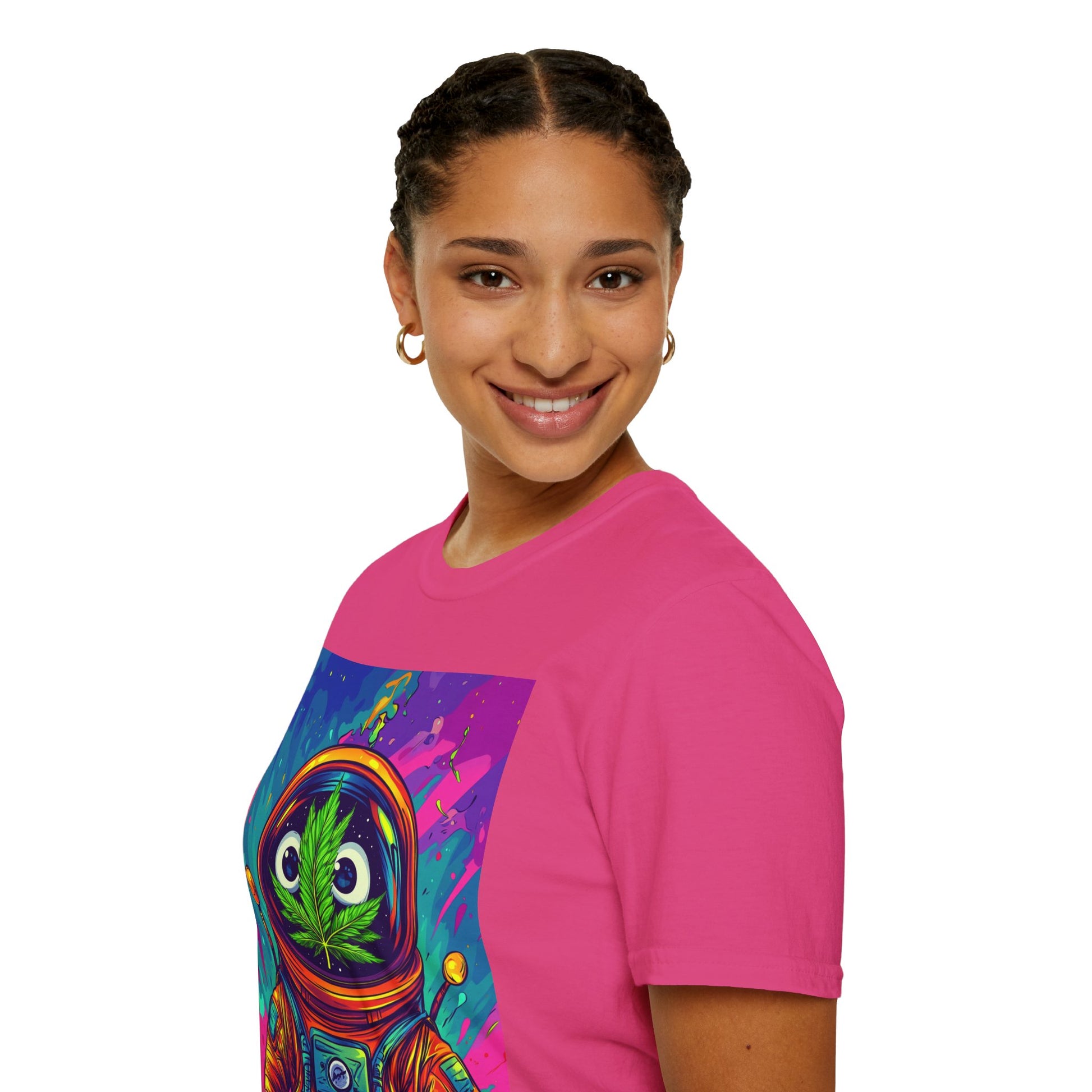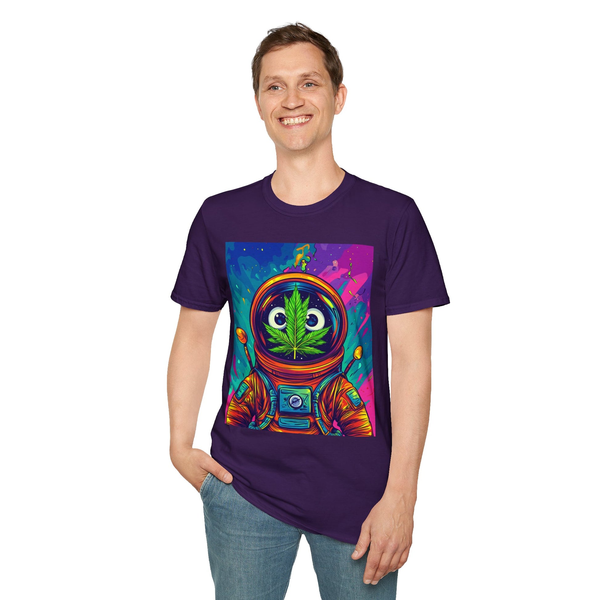 Suit up for a cosmic cruise in this out-of-this-world crewneck featuring a wide-eyed space traveler with a leafy secret. Drenched in vibrant neon and intergalactic drips, this sweatshirt is for the dreamers, explorers, and stoners who know that sometimes the best trips happen in zero gravity.