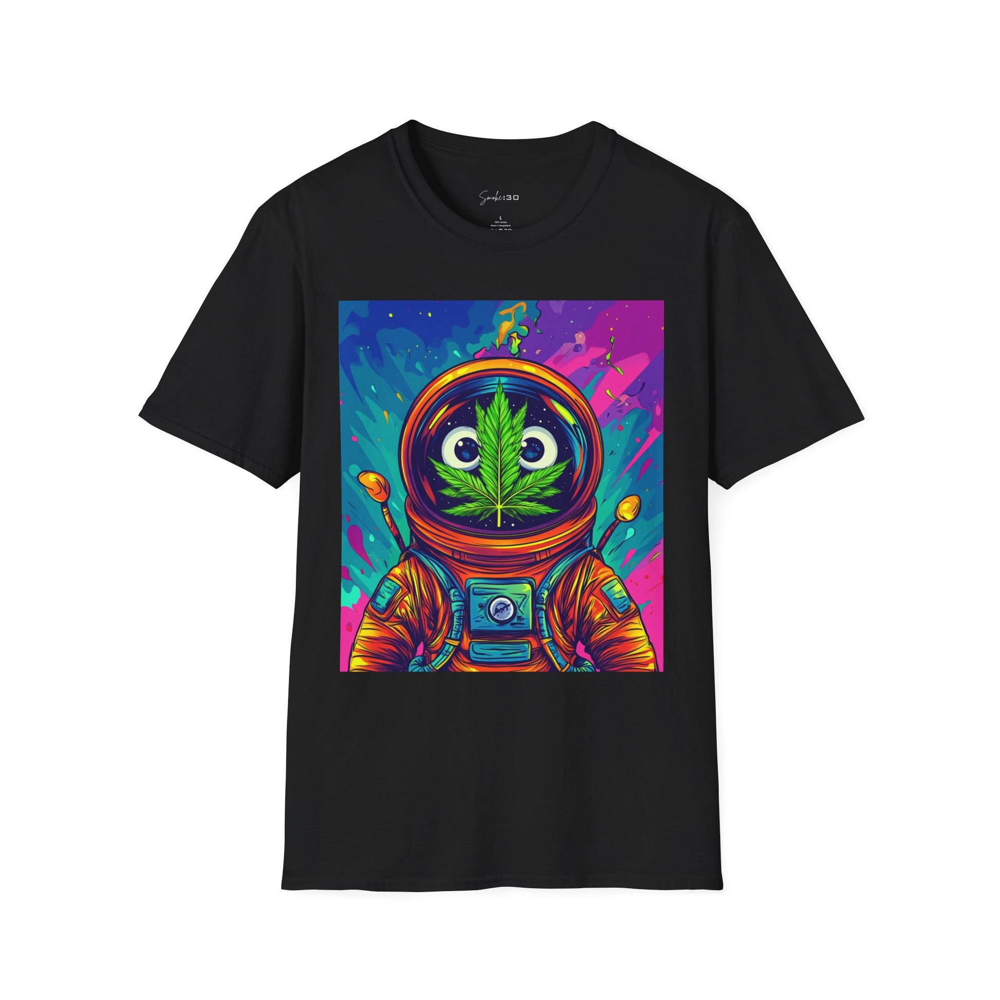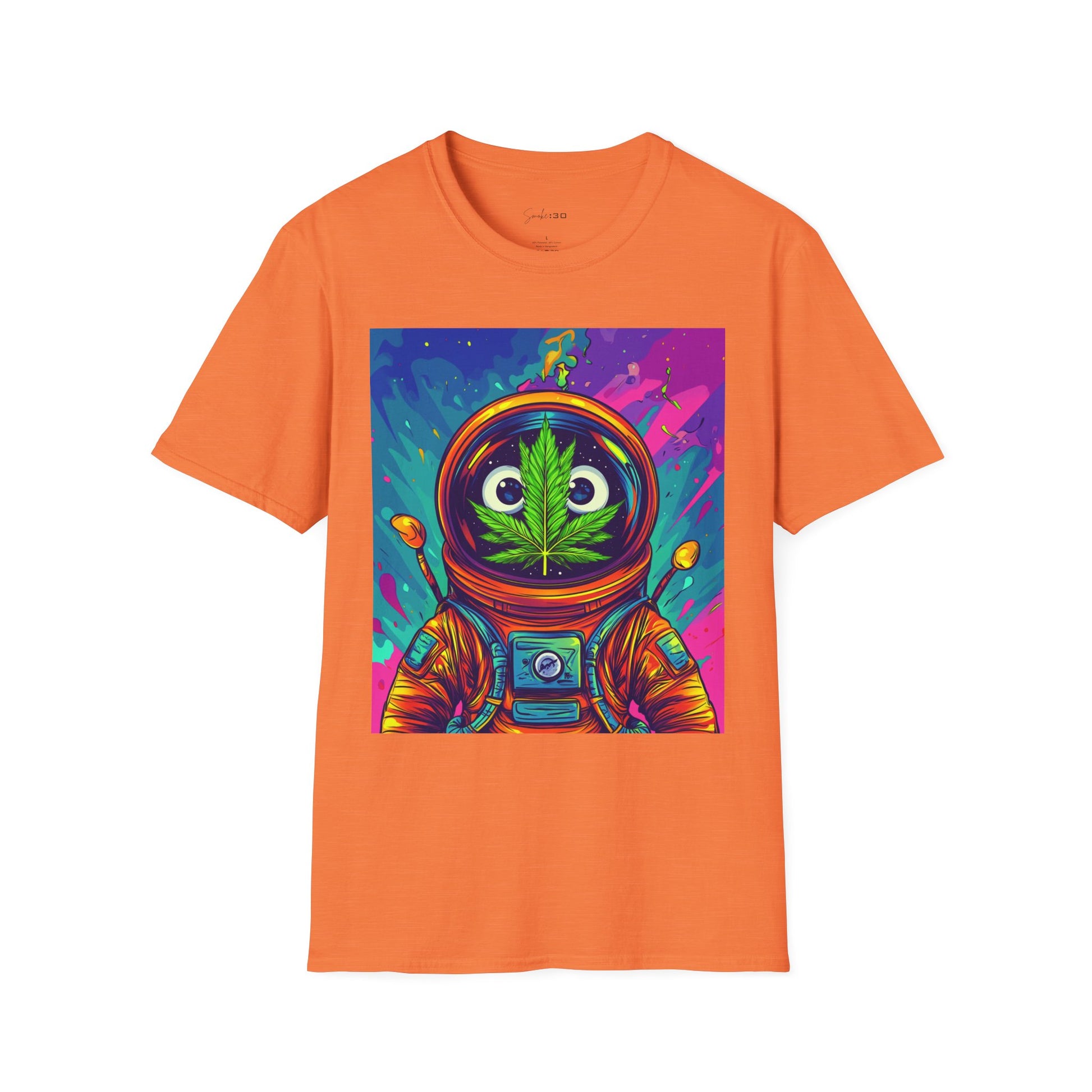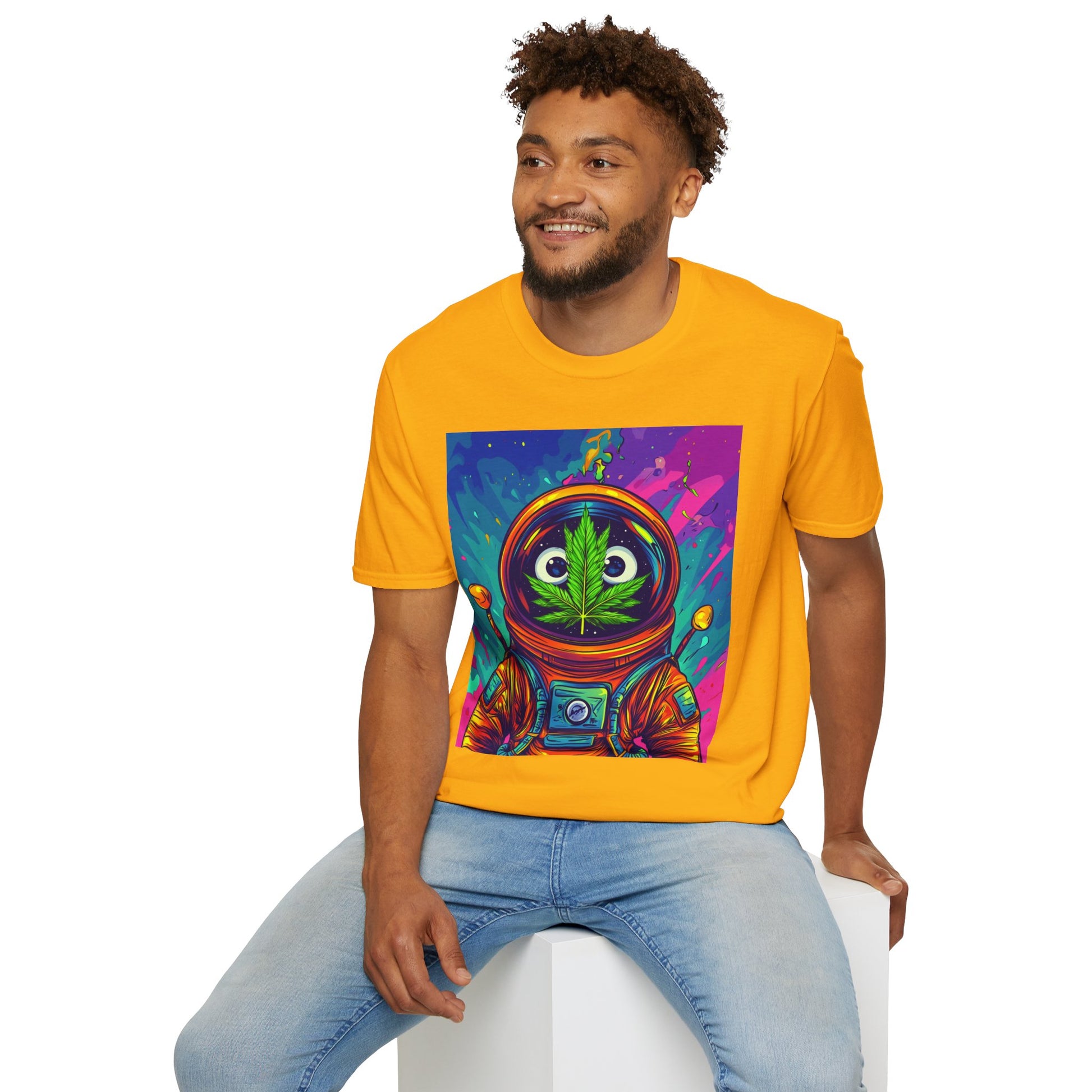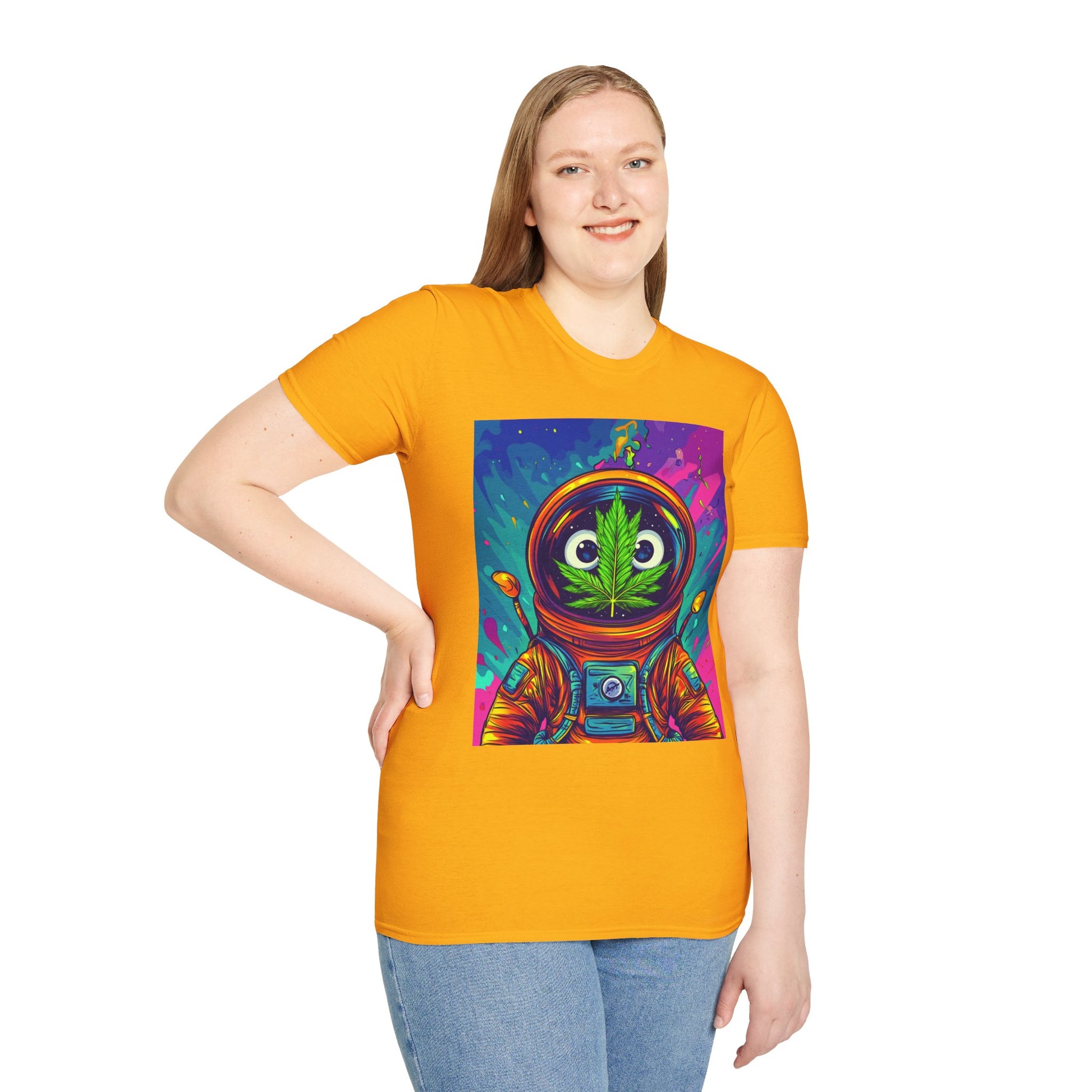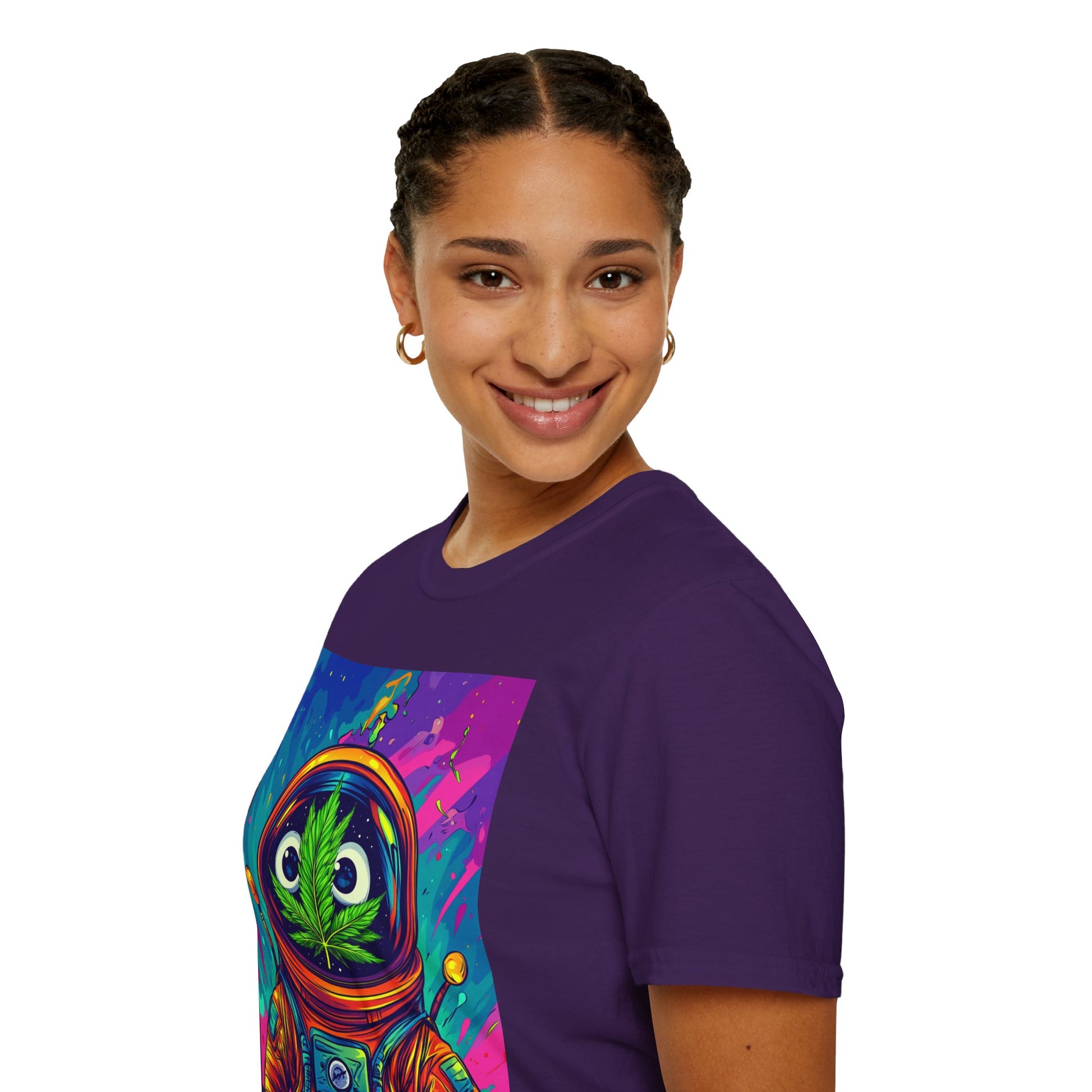 Suit up for a cosmic cruise in this out-of-this-world crewneck featuring a wide-eyed space traveler with a leafy secret. Drenched in vibrant neon and intergalactic drips, this sweatshirt is for the dreamers, explorers, and stoners who know that sometimes the best trips happen in zero gravity.