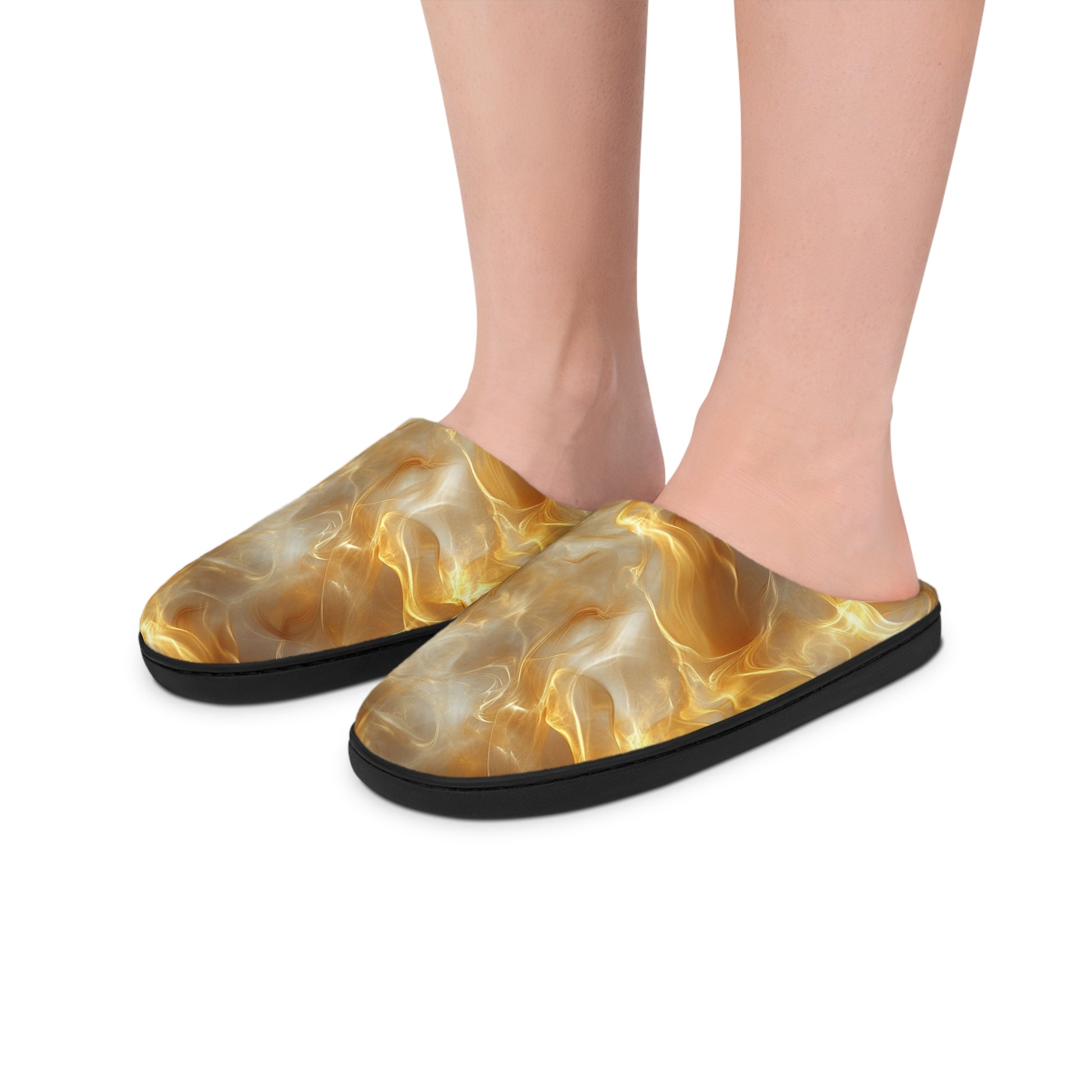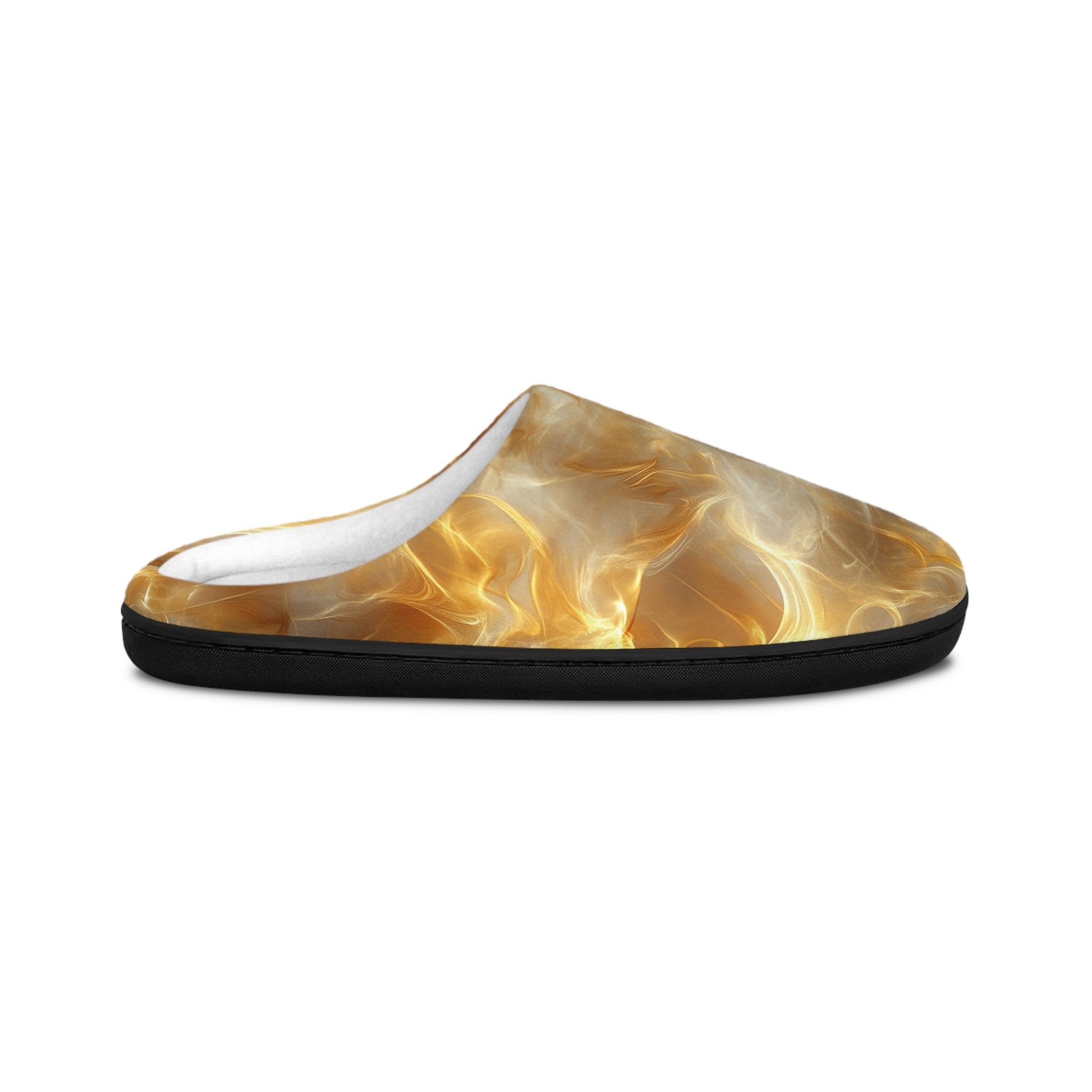 Step into your element — where comfort meets pure indulgence. The Golden Haze slippers shimmer with hypnotic swirls of molten gold and smoke, like liquid light caught mid-drift. The marbled golden pattern adds an understated brilliance — relaxed, yet elevated.