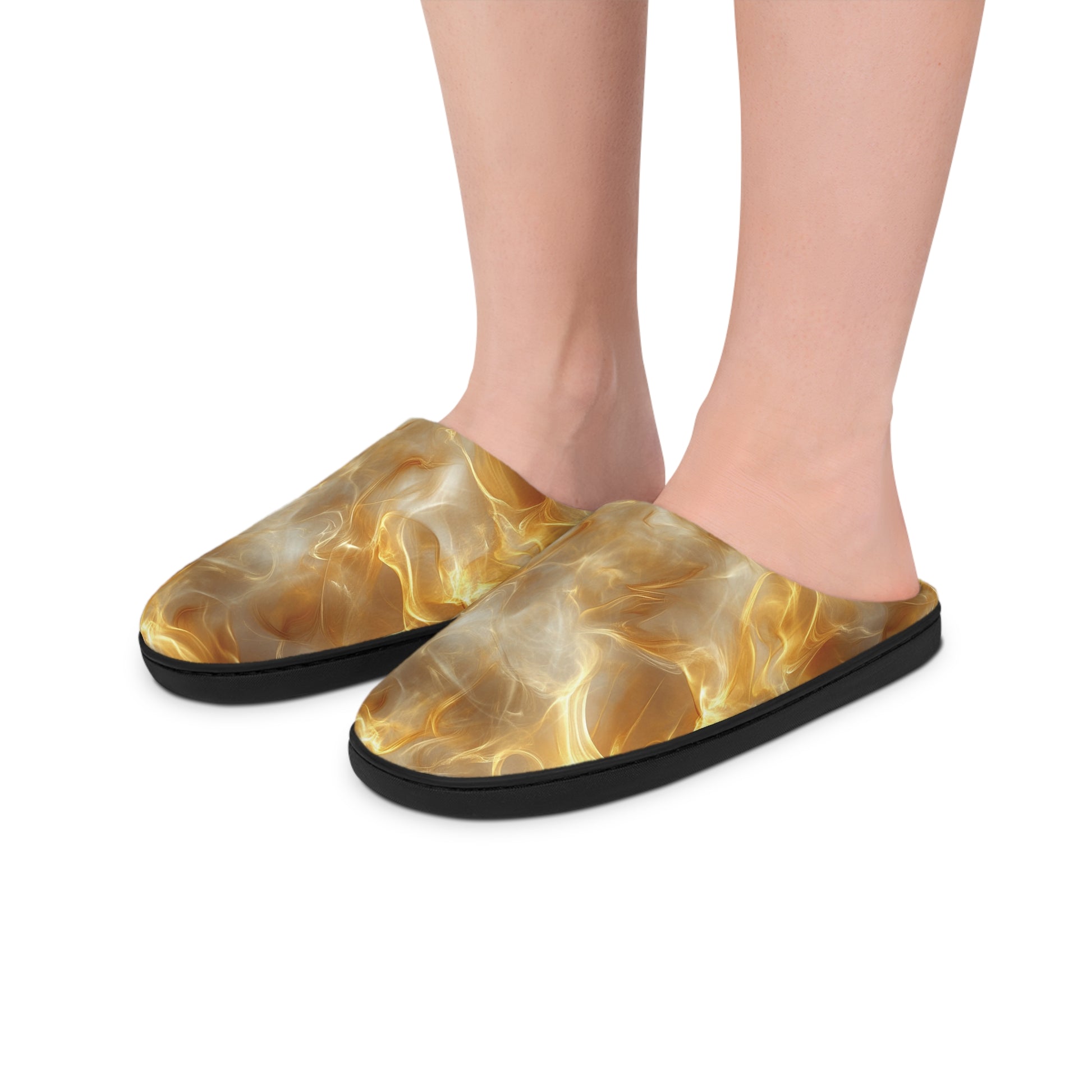 Step into your element — where comfort meets pure indulgence. The Golden Haze slippers shimmer with hypnotic swirls of molten gold and smoke, like liquid light caught mid-drift. The marbled golden pattern adds an understated brilliance — relaxed, yet elevated.