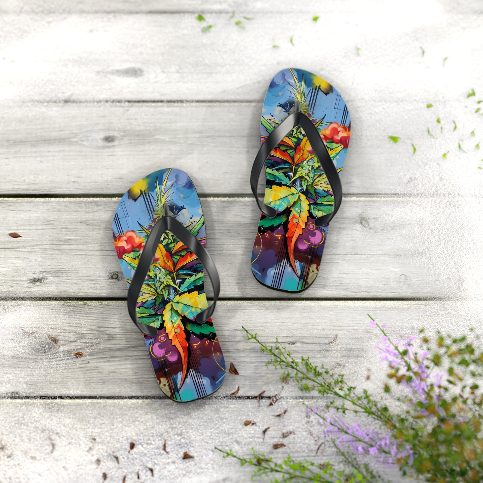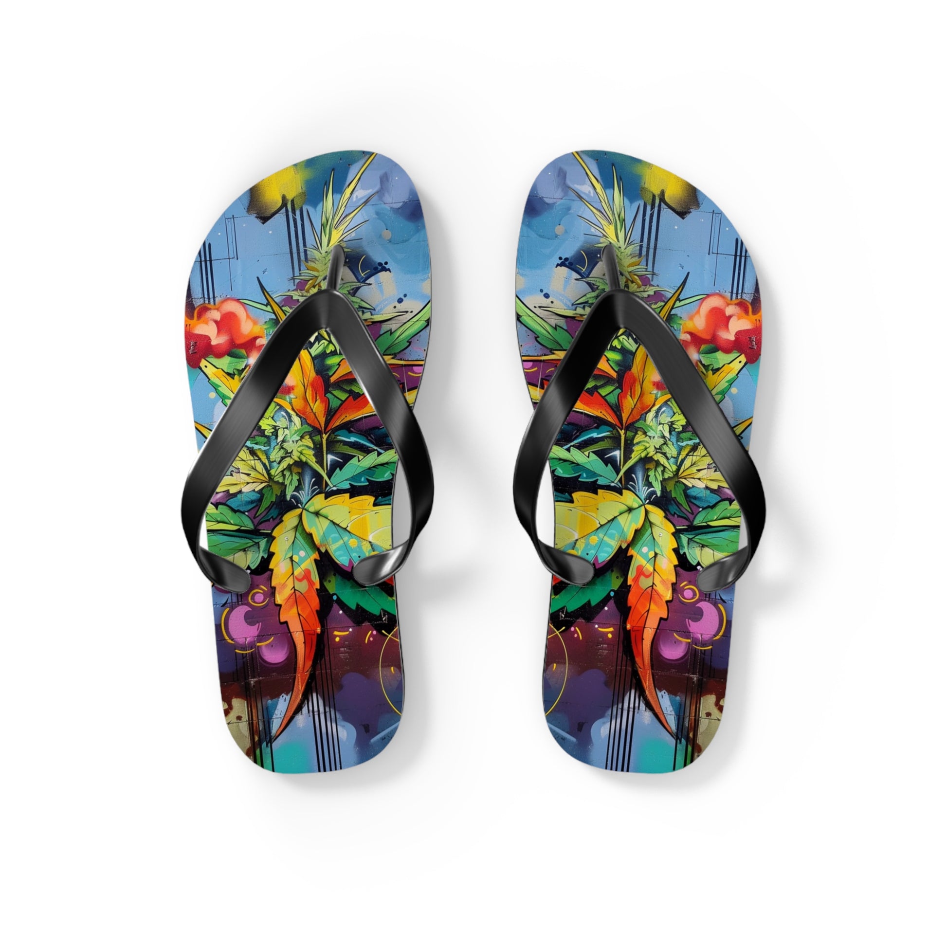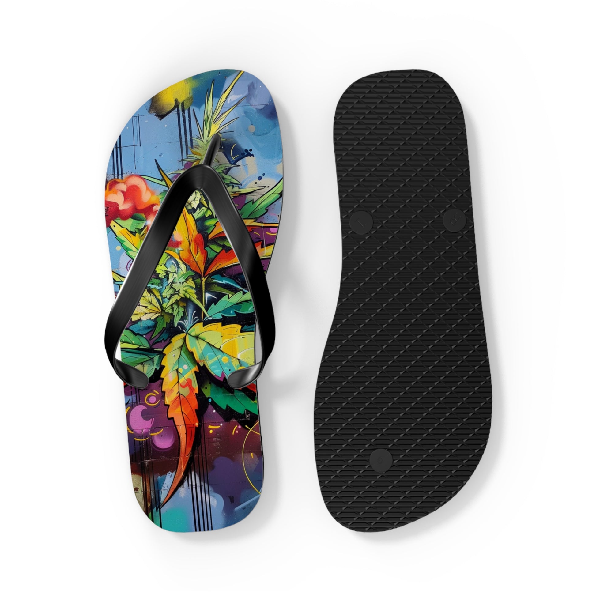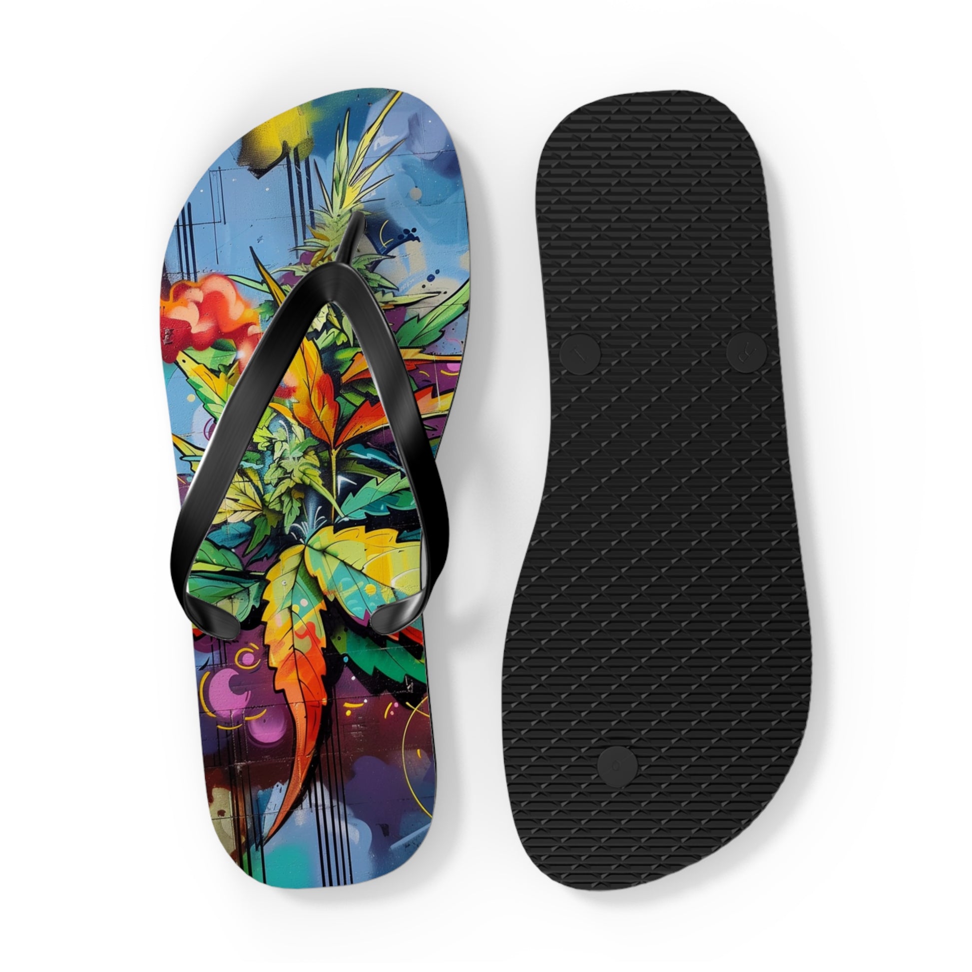 Step into a world where anime fantasy collides with urban grit. These flip-flops feature a vibrant graffiti-style cannabis design that looks like it was ripped straight from a street mural in Shibuya or Brooklyn. Bursting with bold colors, layered textures, and stylized leaf art, they’re a loud expression of movement, rebellion, and high-minded creativity.