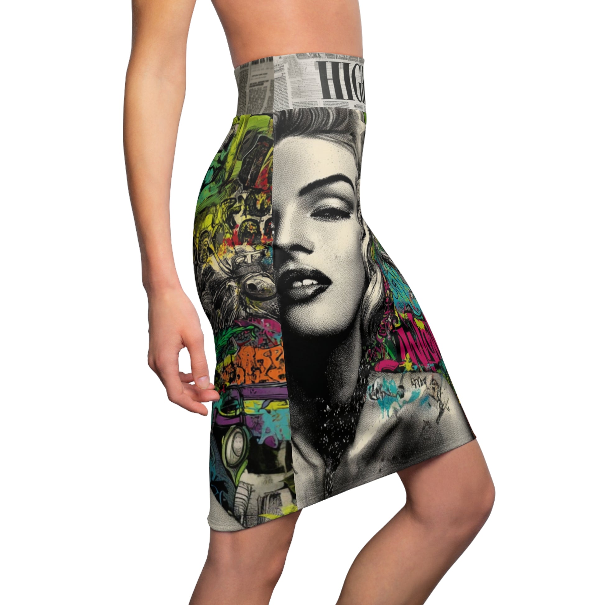 Make a statement that’s bold, rebellious, and unapologetically you. The High Society Pencil Skirt merges high-end allure with urban chaos — where vintage glam meets graffiti-covered back alleys. Featuring a sultry grayscale portrait framed by neon street art, cannabis leaves, and bold “HIGH FASHION” headlines, this skirt doesn’t just turn heads — it stops traffic.