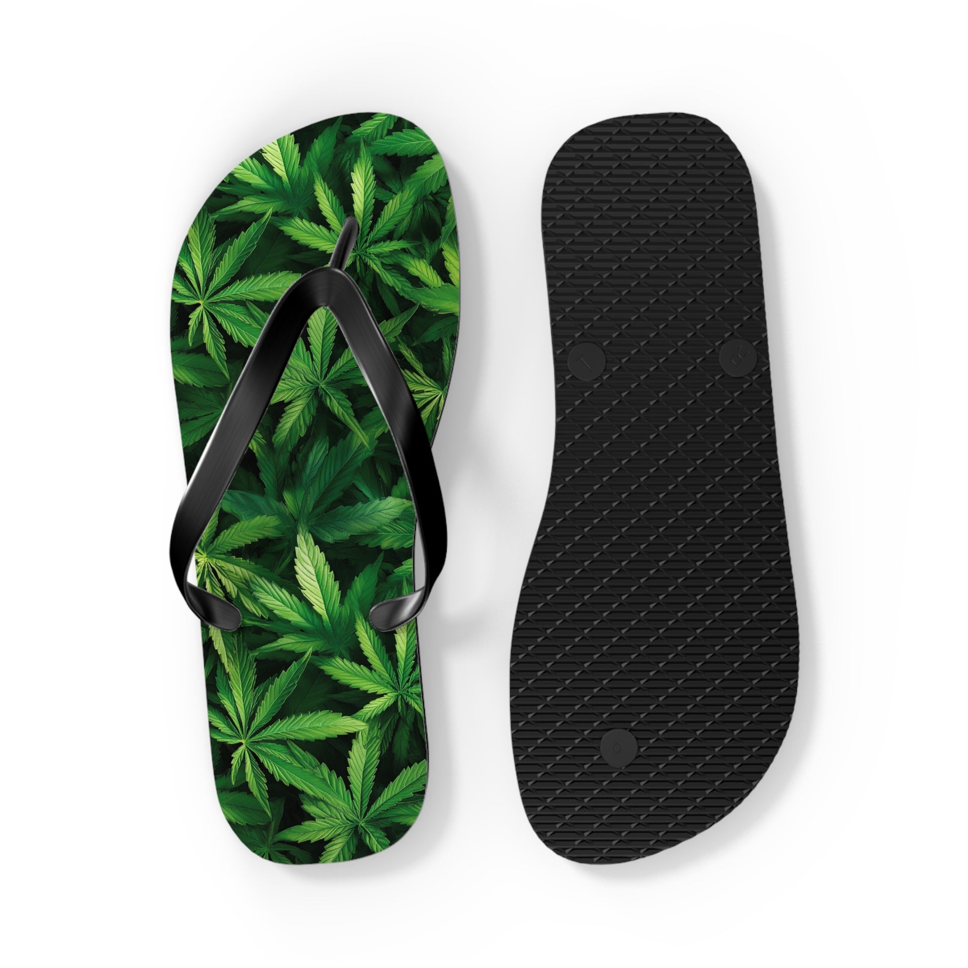 Why tiptoe through the tulips when you can stride through the sativa? Drenched in a bold cannabis leaf print, these flip-flops are a leafy love letter to the plant that keeps us grounded, lifted, and everything in between.