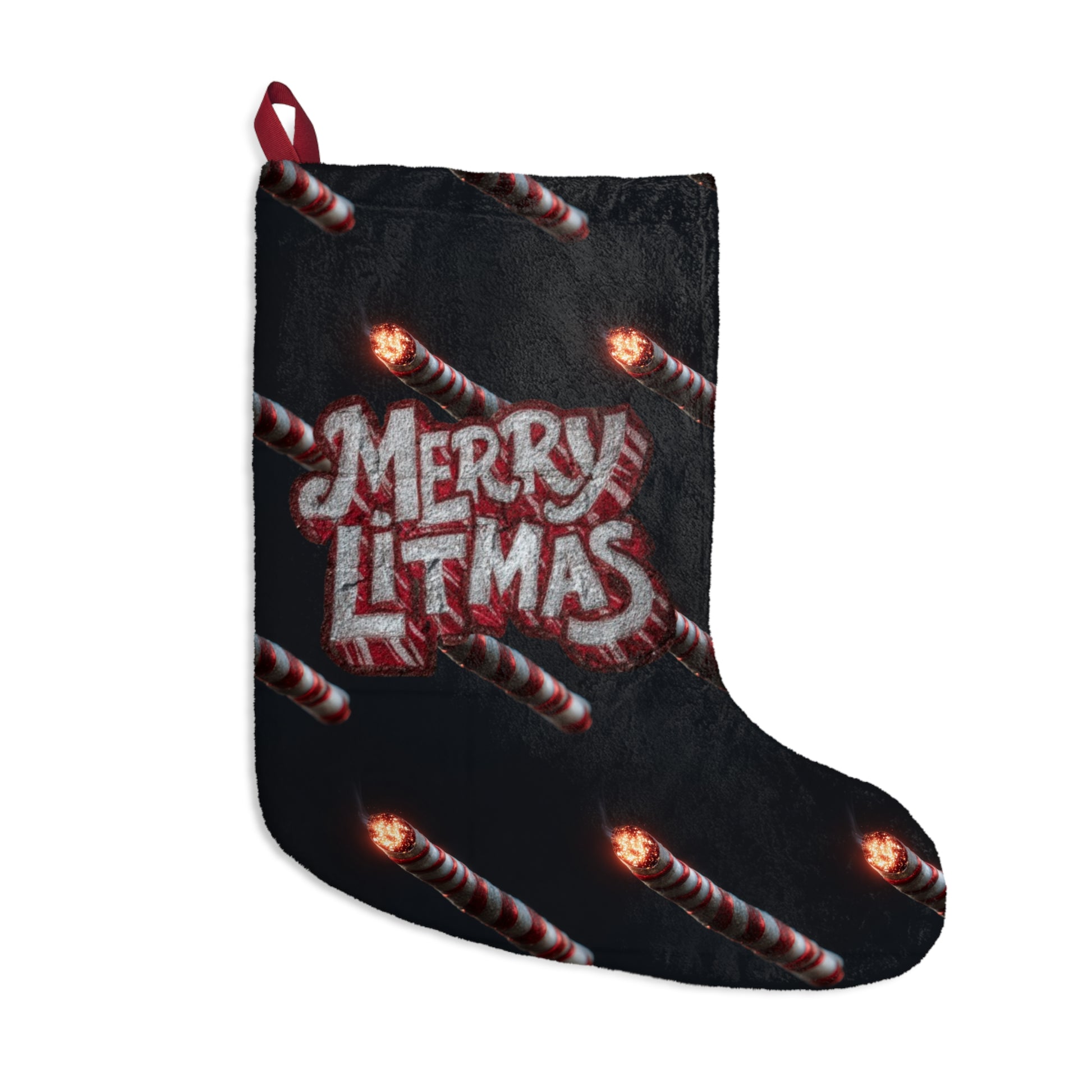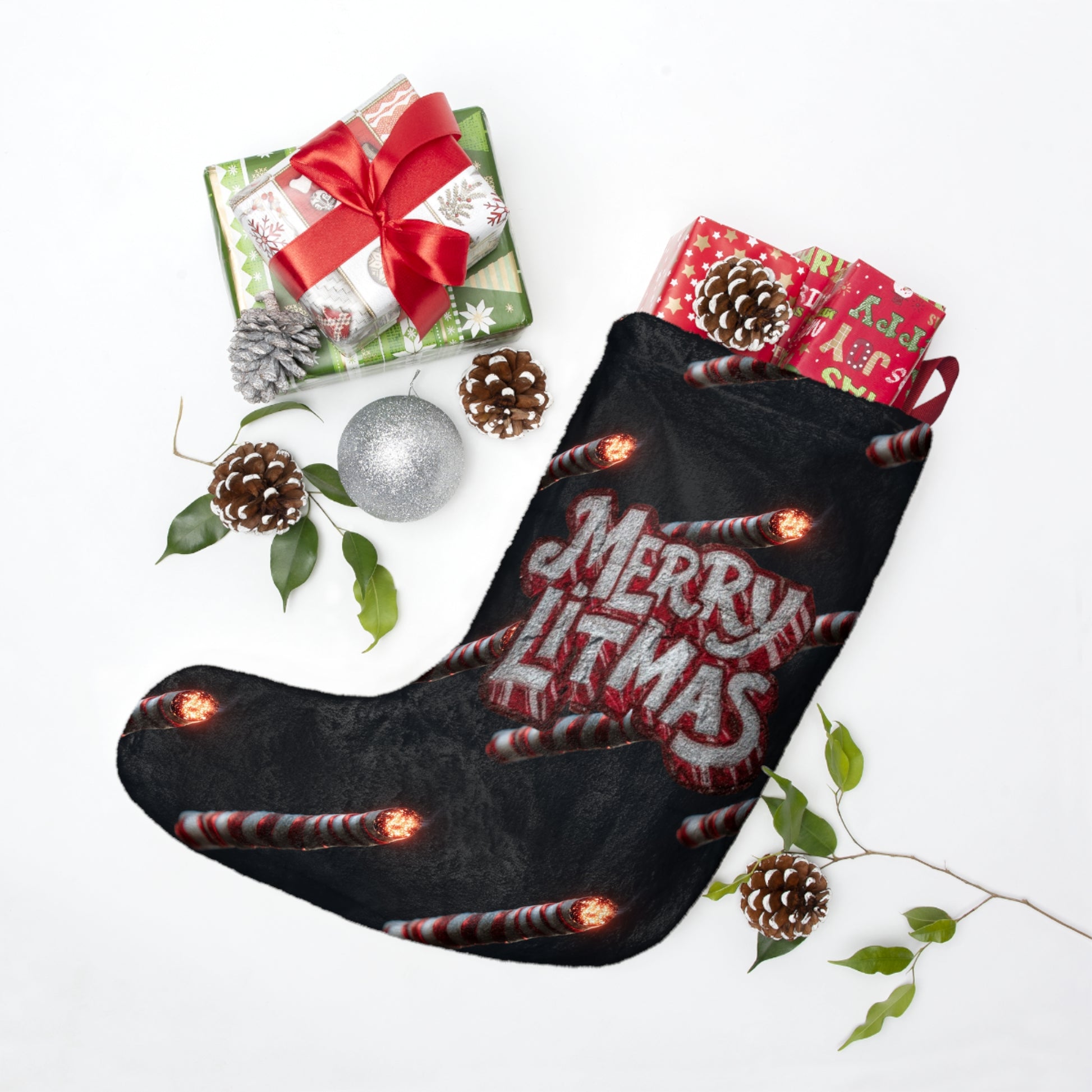 Bring a bold twist to the holidays with this Merry Litmas stocking, designed with a standout pattern of lit candy cane–striped blunts. The candy cane-patterned graffiti lettering pops with energy, making the whole piece feel modern, playful, and just the right amount of rebellious.