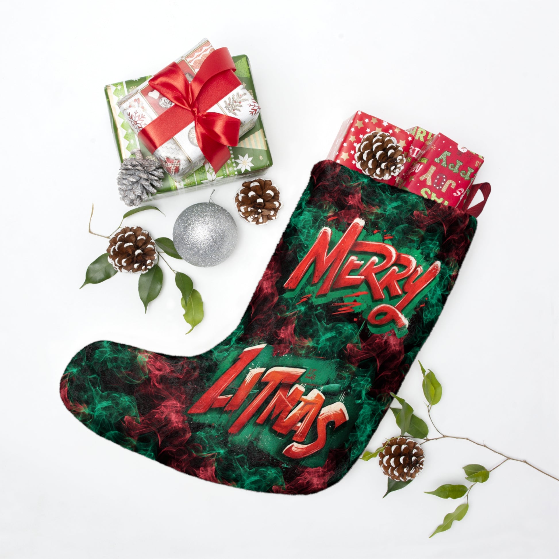 Bring a fresh kind of holiday heat to your décor with this Merry Litmas stocking, wrapped in a striking blend of red and green smoke. The swirling colors create a rich, layered backdrop that feels bold, festive, and full of motion—like the season coming to life.