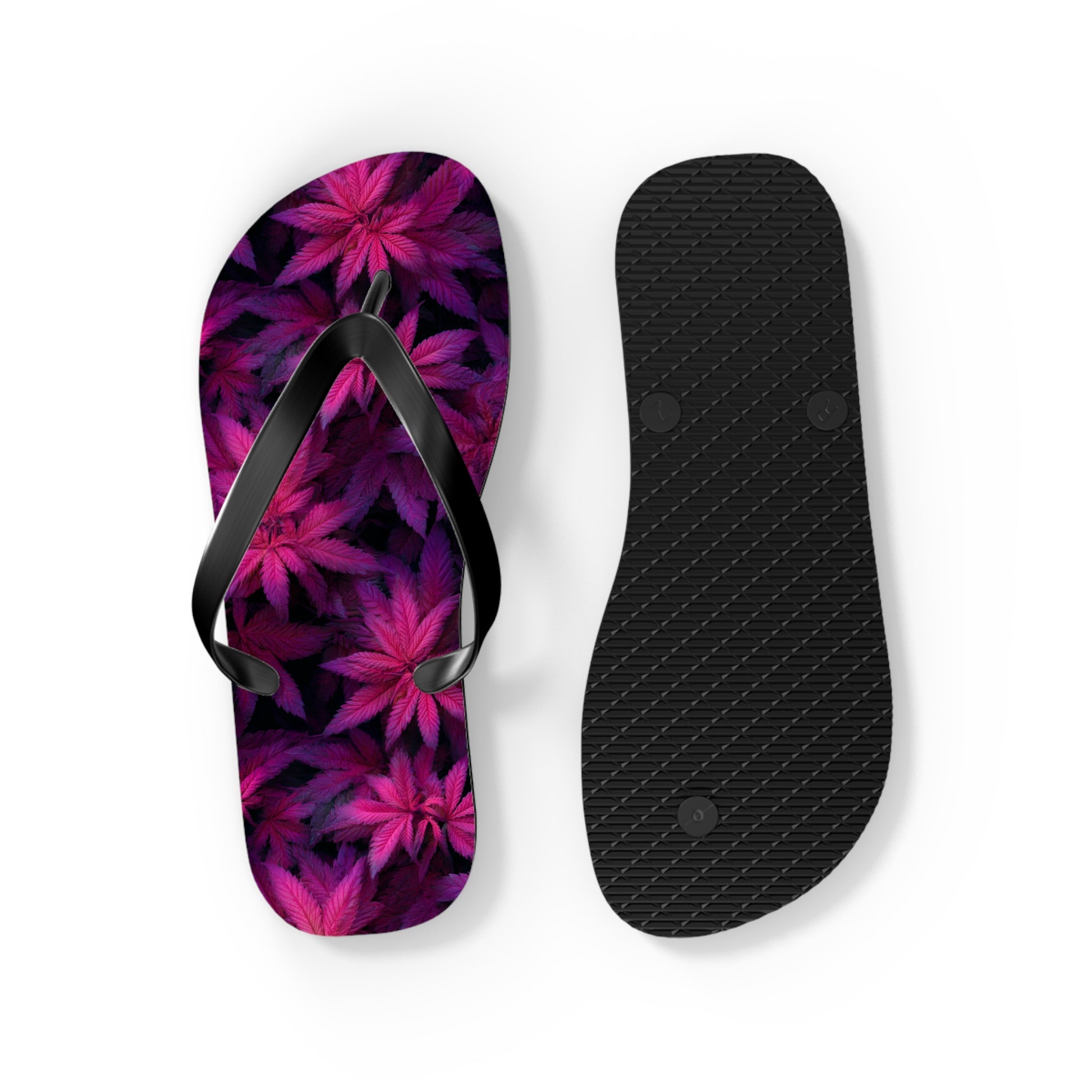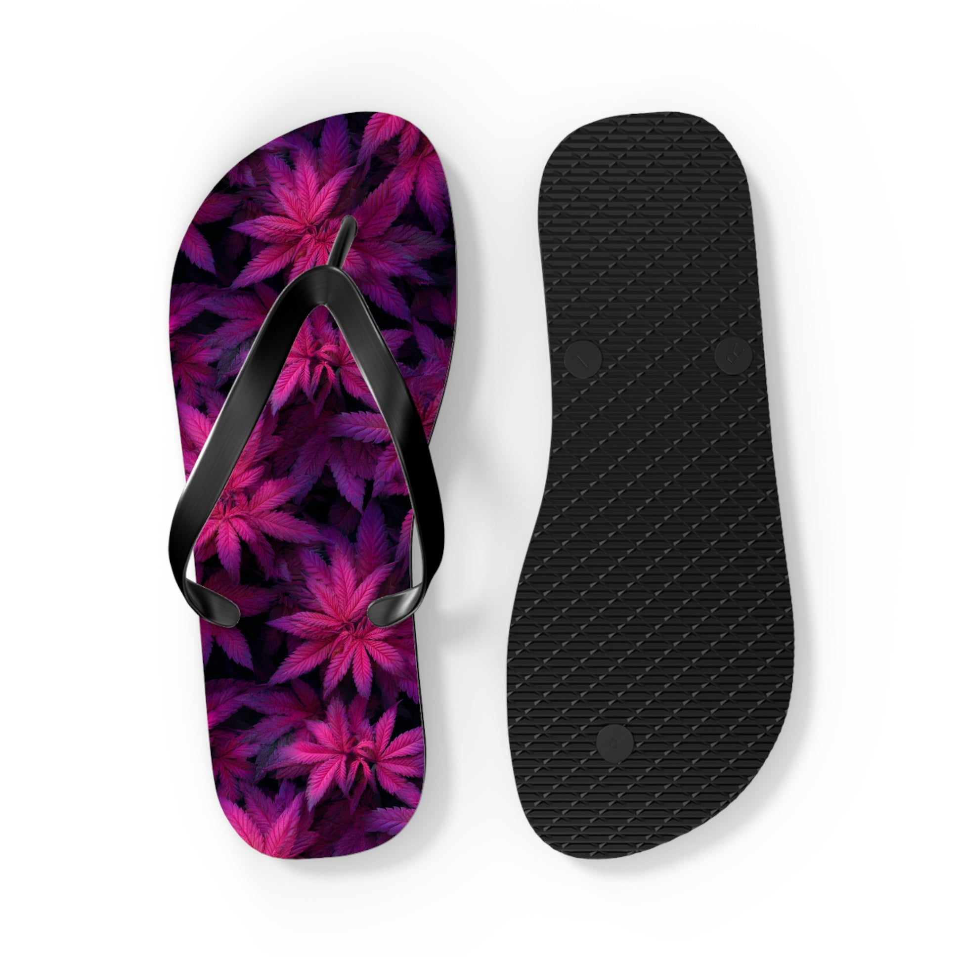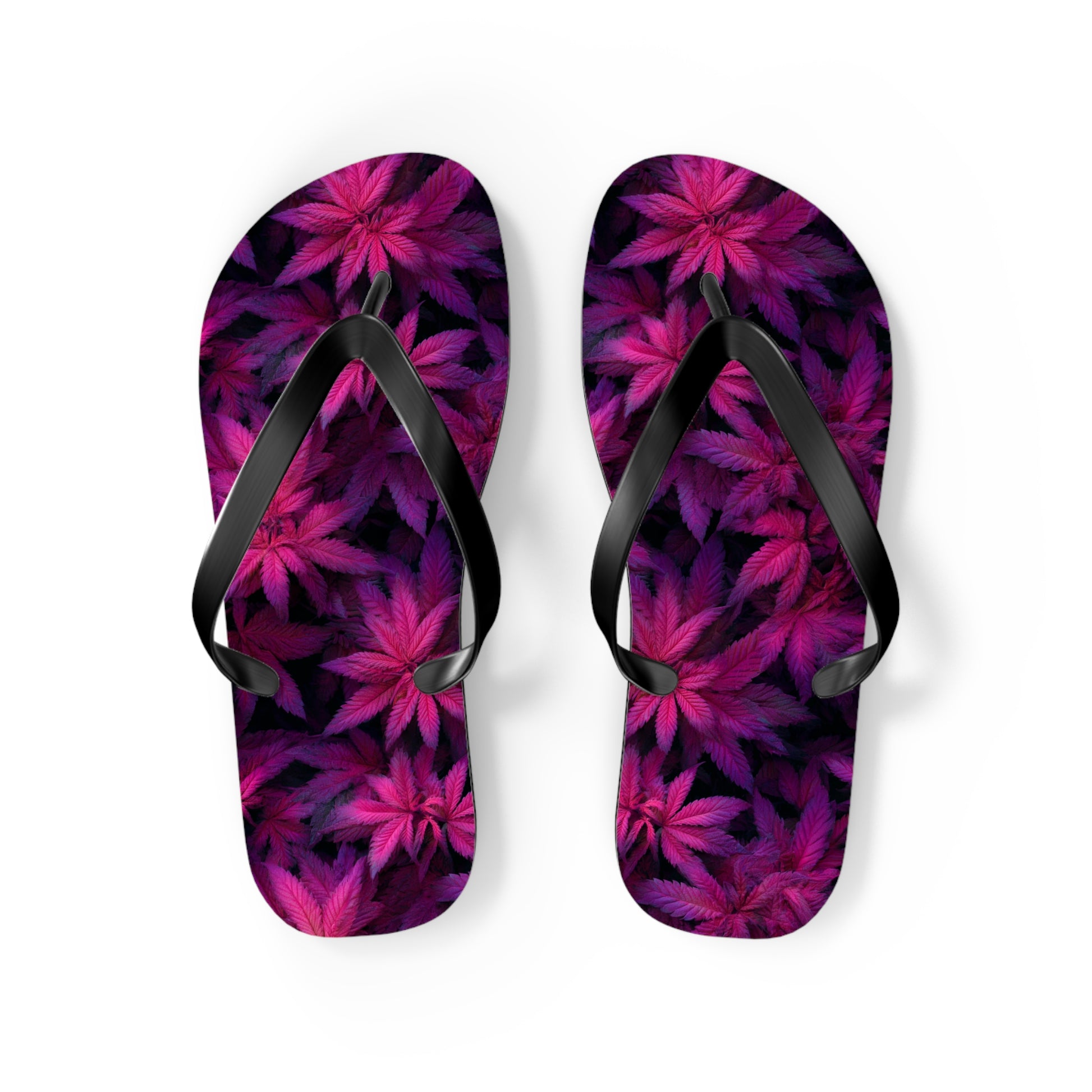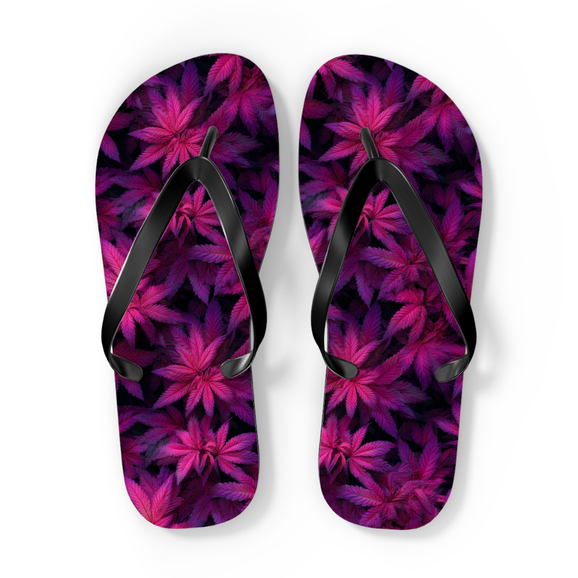 Float through your day like you're caught in a cloud of classic kush. These flip-flops are drenched in deep purples and hot pinks, inspired by legendary strains like Purple Haze and Granddaddy Purp. The bold, leafy print wraps your feet in psychedelic heat—perfect for hazy strolls, chill sessions, or turning heads wherever you land.