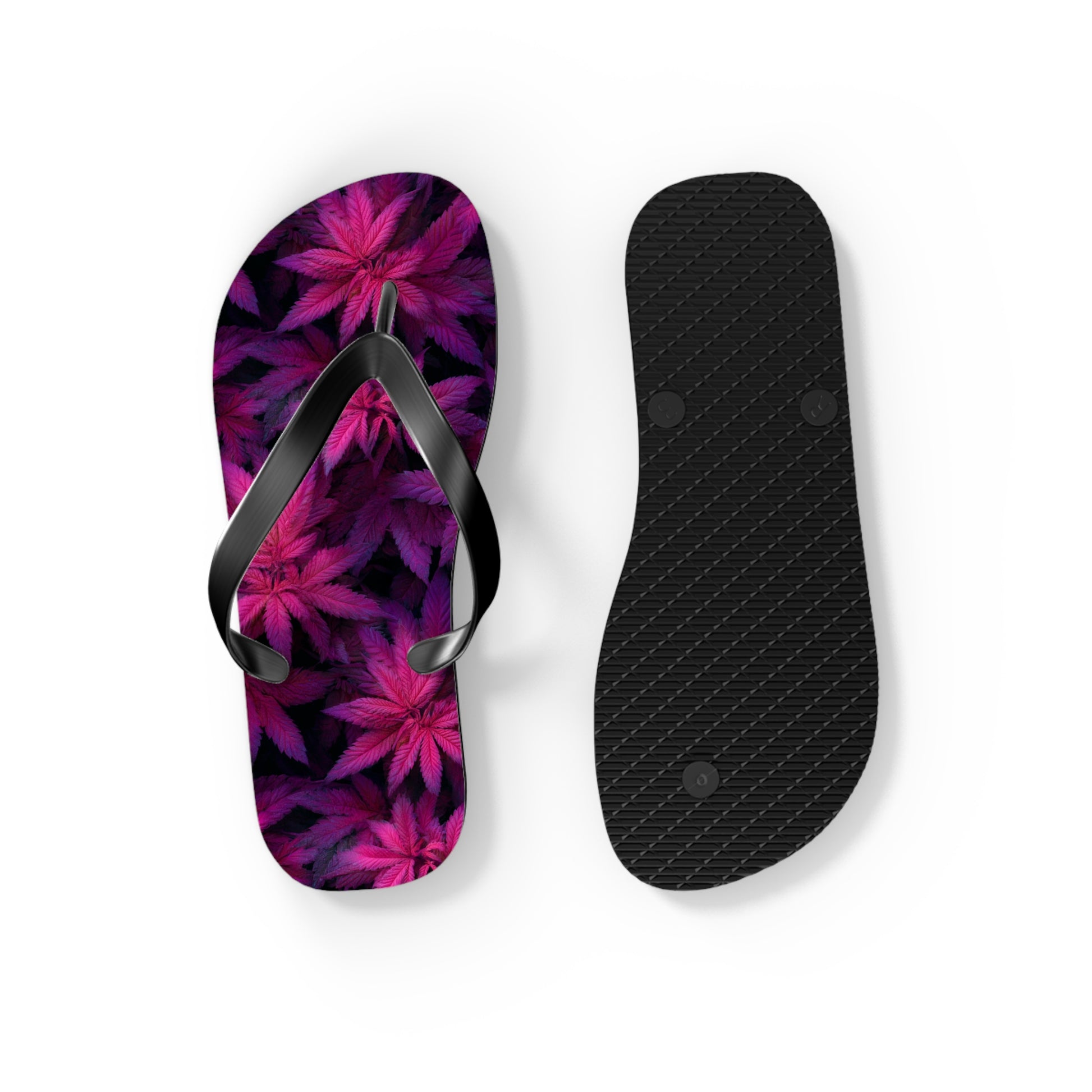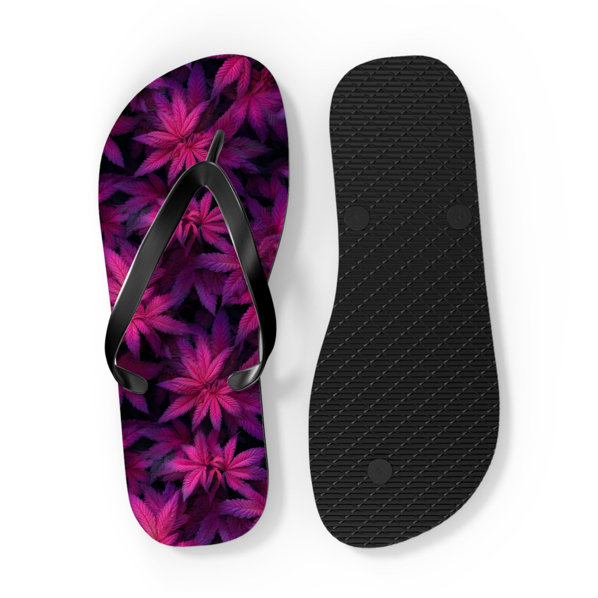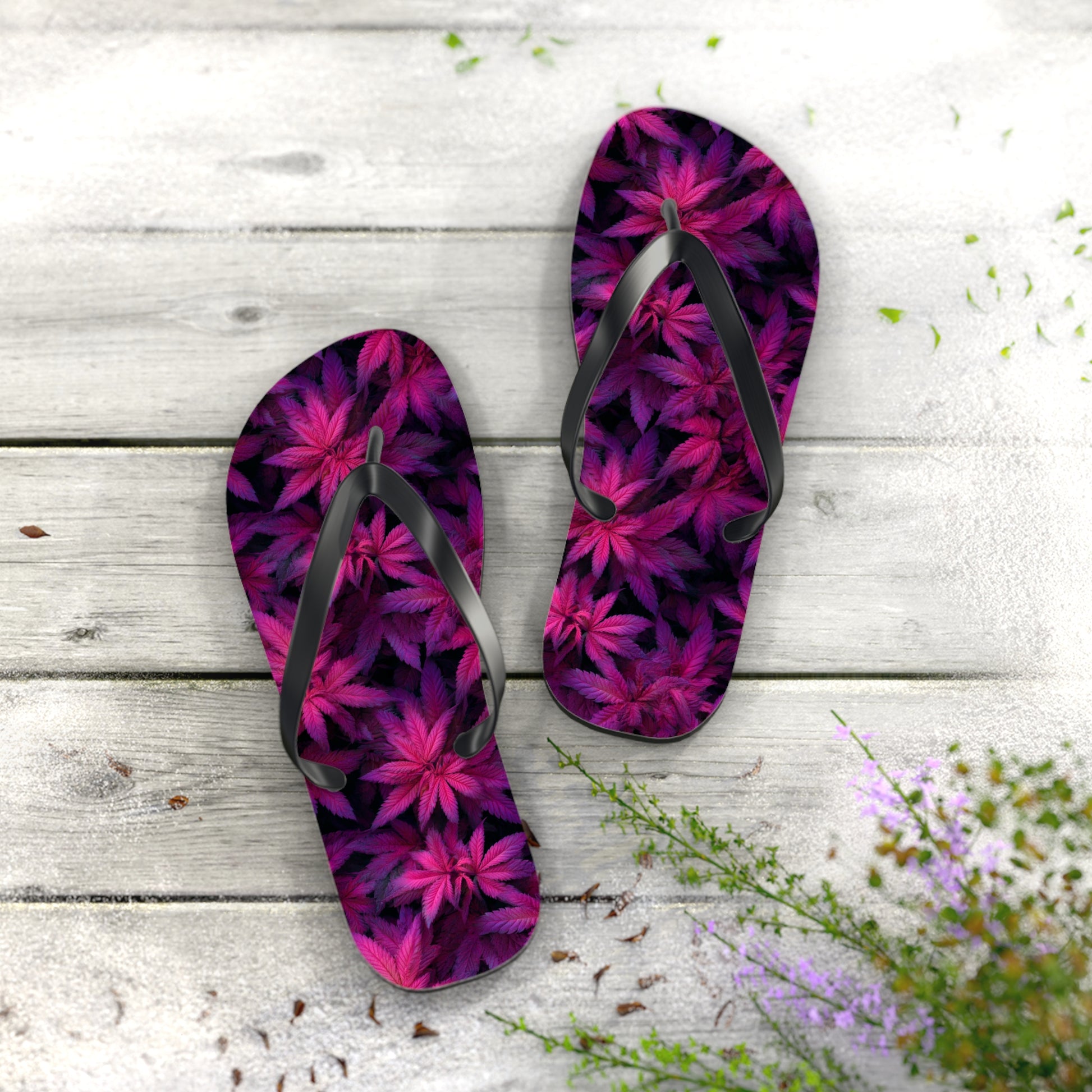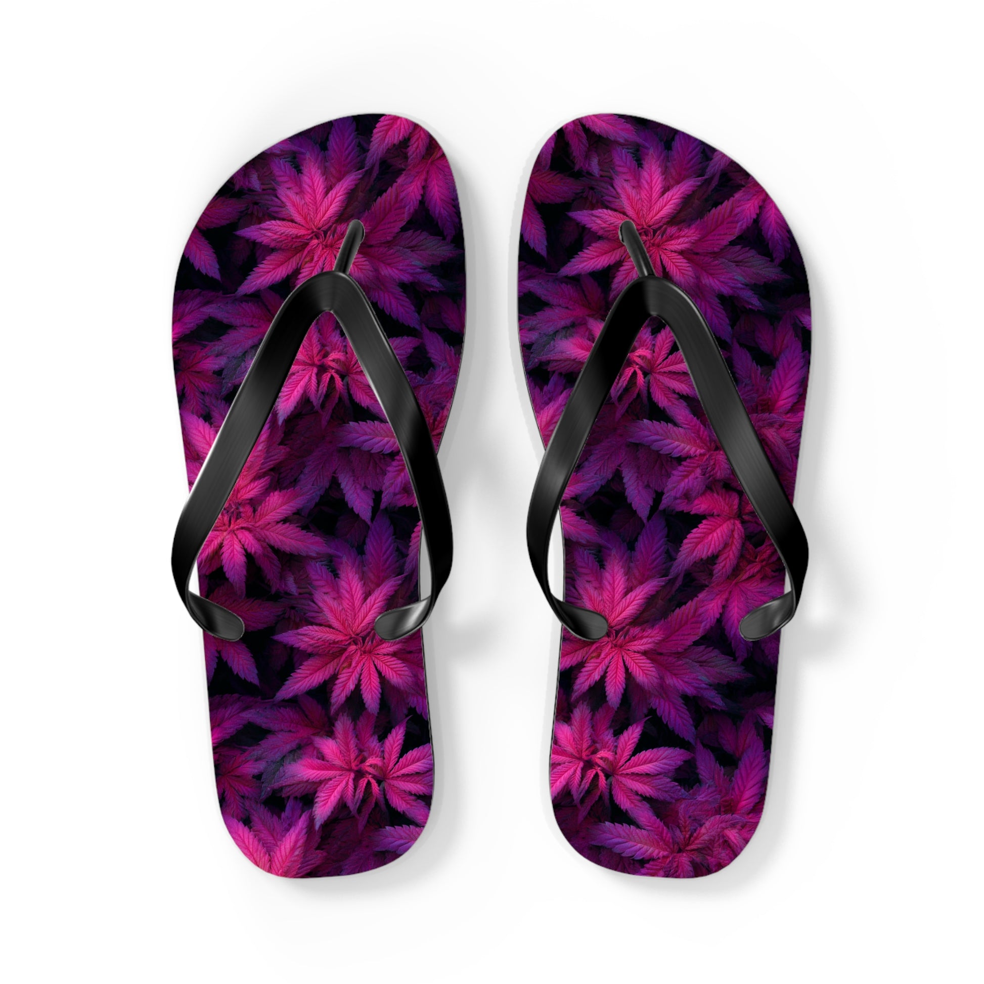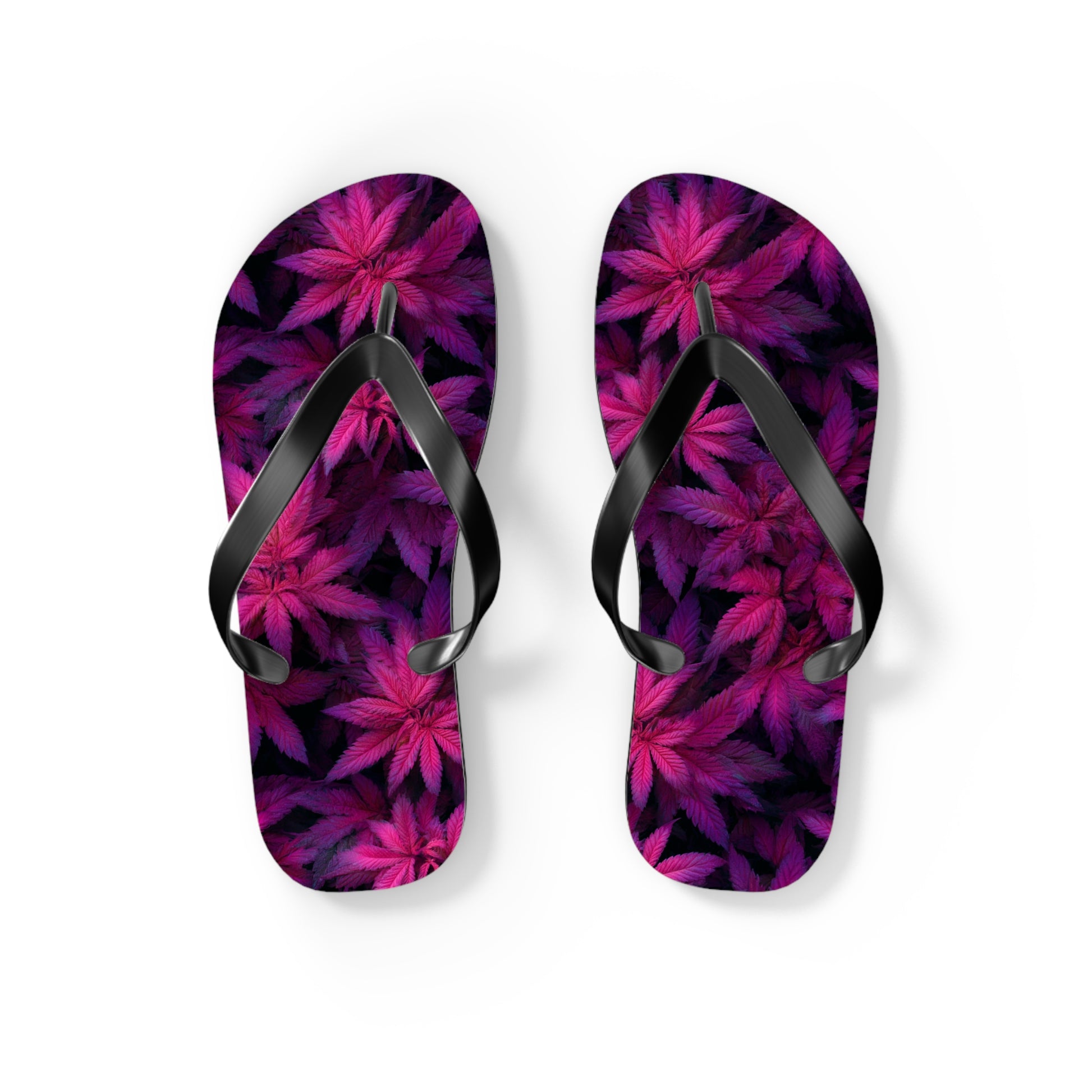 Float through your day like you're caught in a cloud of classic kush. These flip-flops are drenched in deep purples and hot pinks, inspired by legendary strains like Purple Haze and Granddaddy Purp. The bold, leafy print wraps your feet in psychedelic heat—perfect for hazy strolls, chill sessions, or turning heads wherever you land.