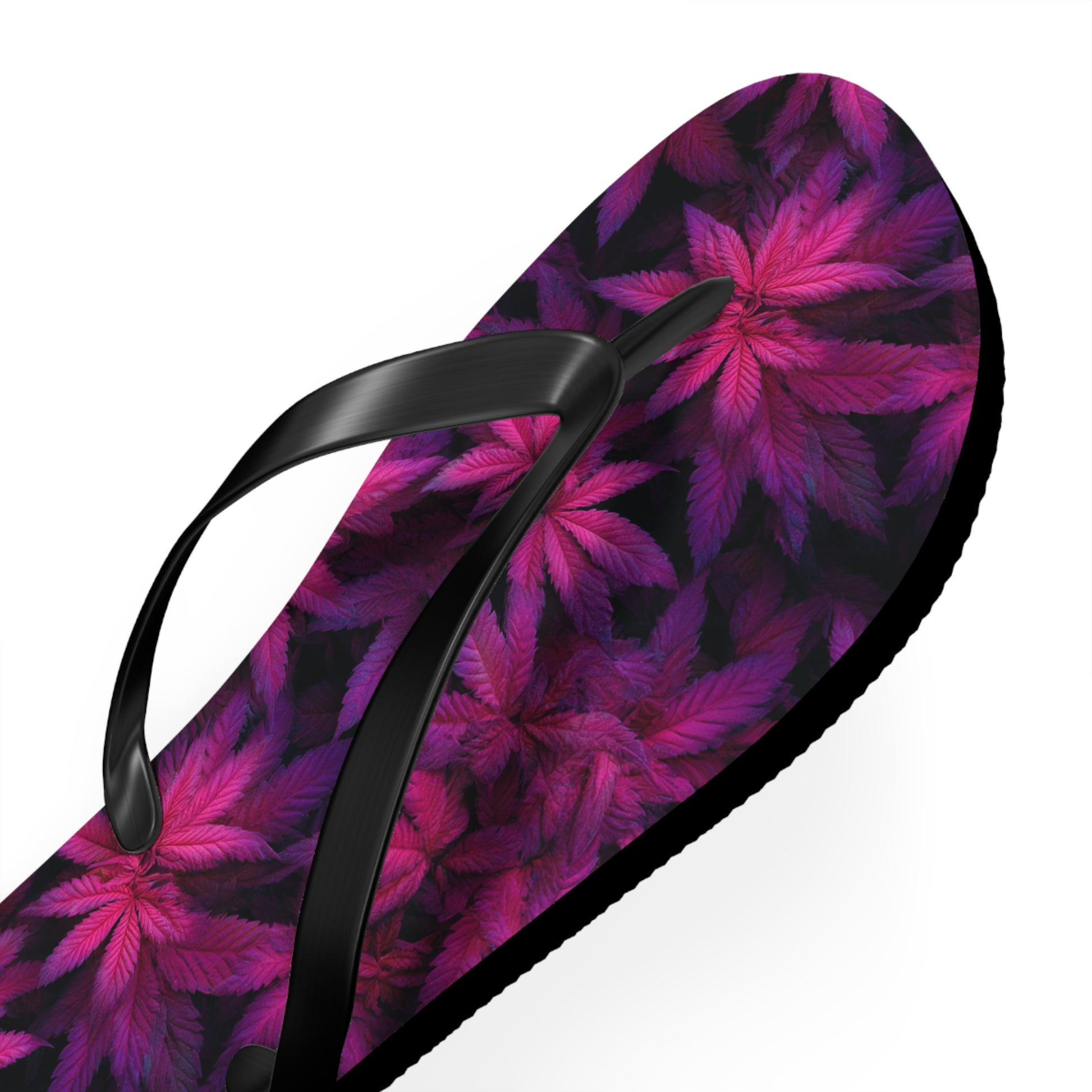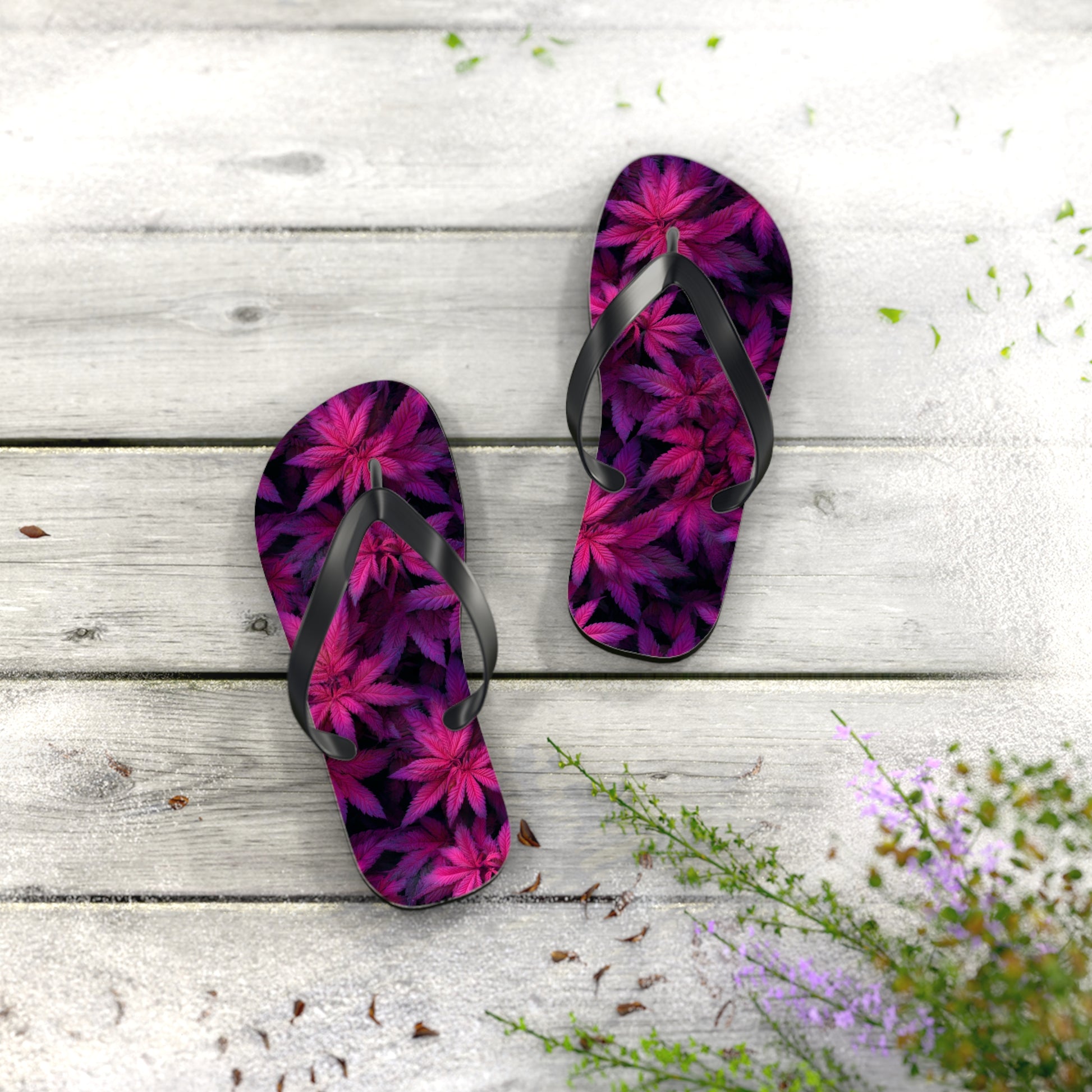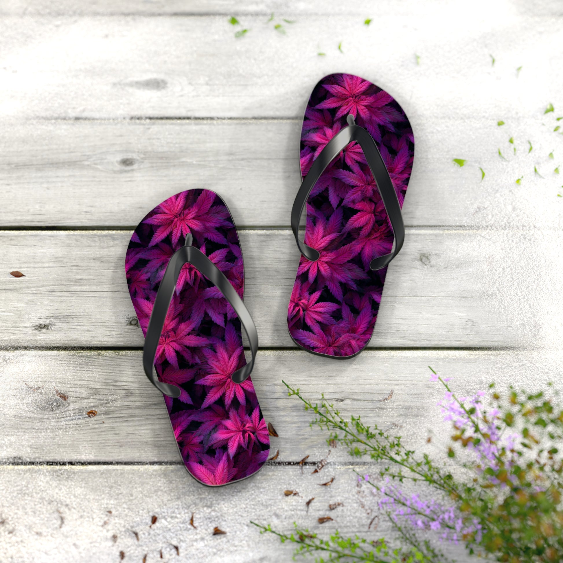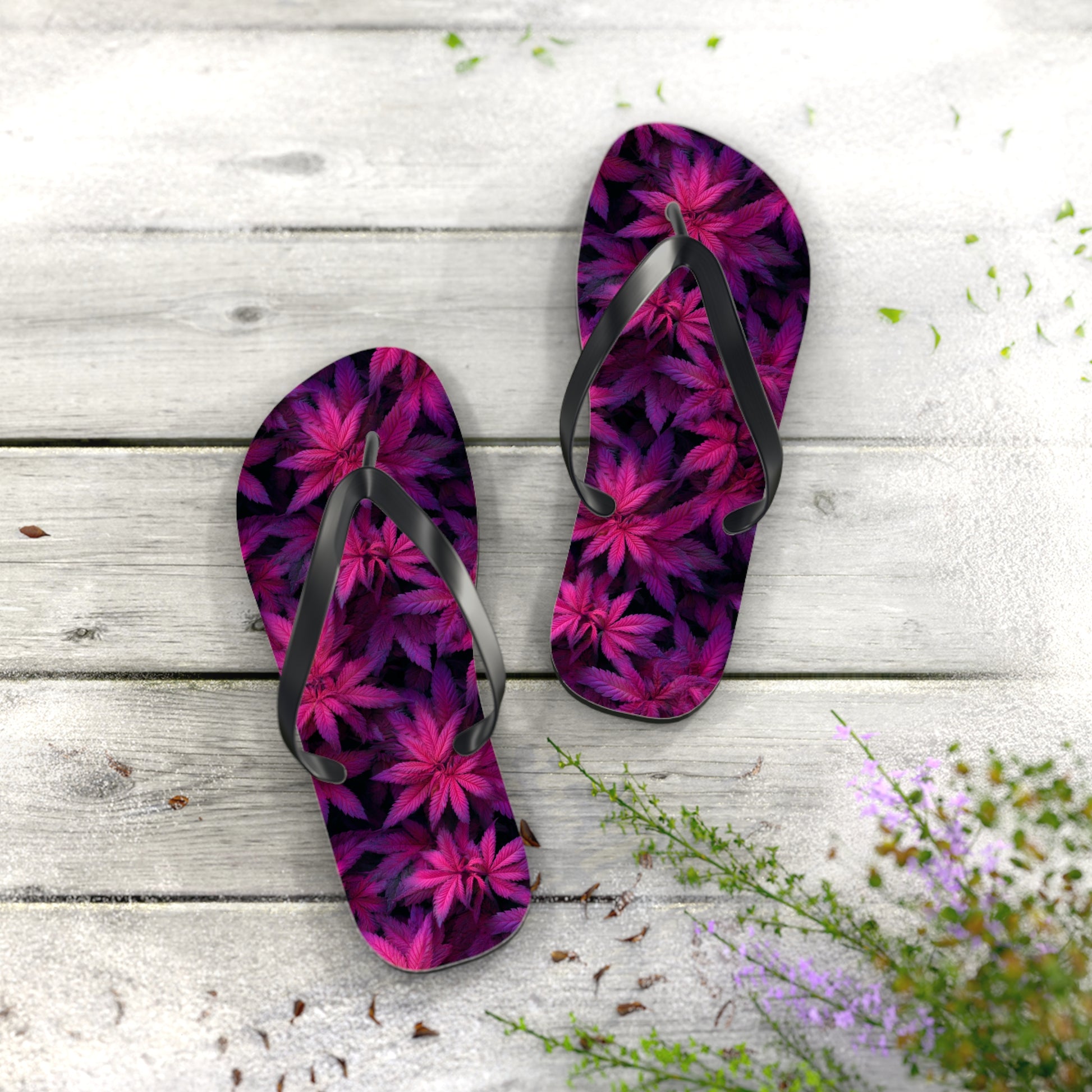 Float through your day like you're caught in a cloud of classic kush. These flip-flops are drenched in deep purples and hot pinks, inspired by legendary strains like Purple Haze and Granddaddy Purp. The bold, leafy print wraps your feet in psychedelic heat—perfect for hazy strolls, chill sessions, or turning heads wherever you land.
