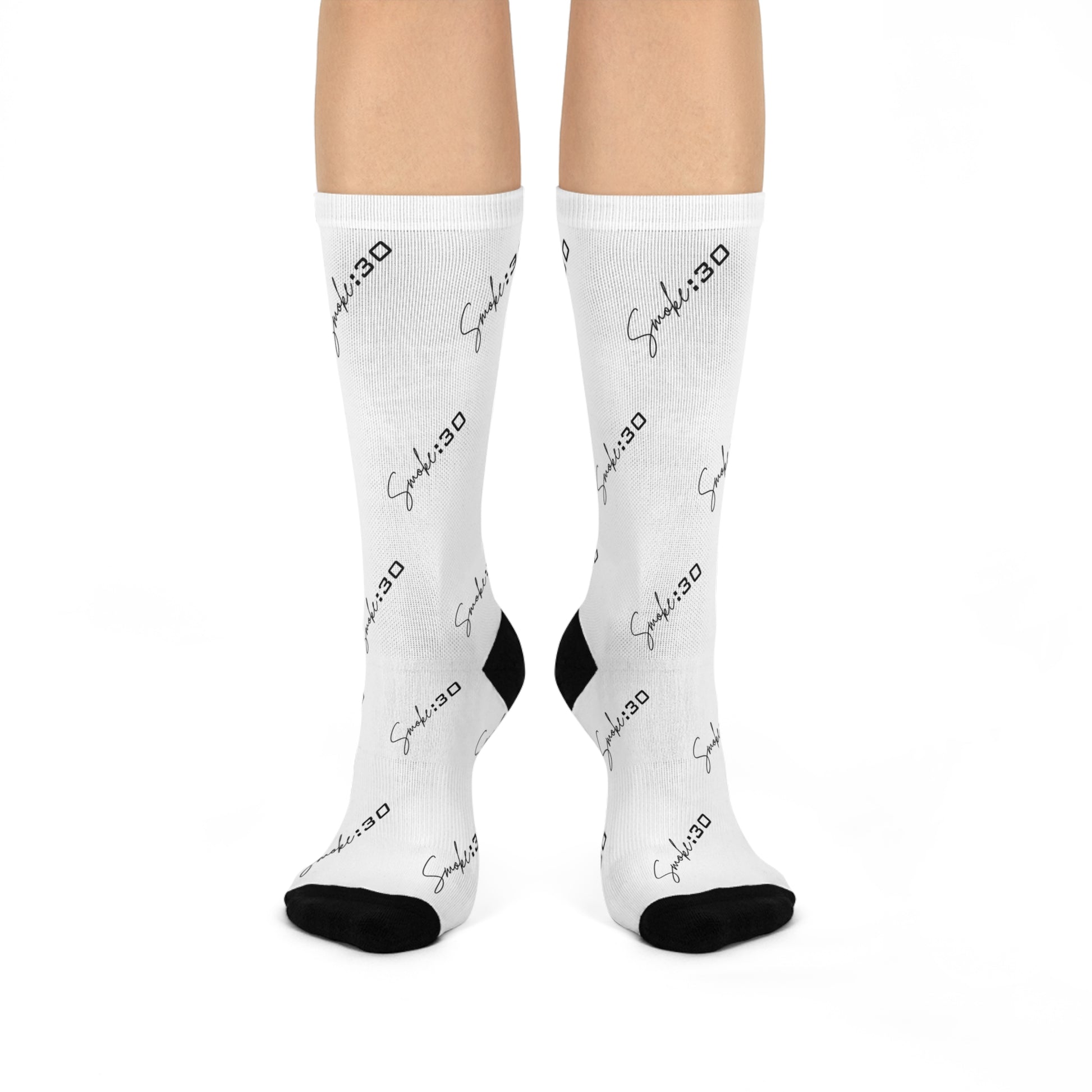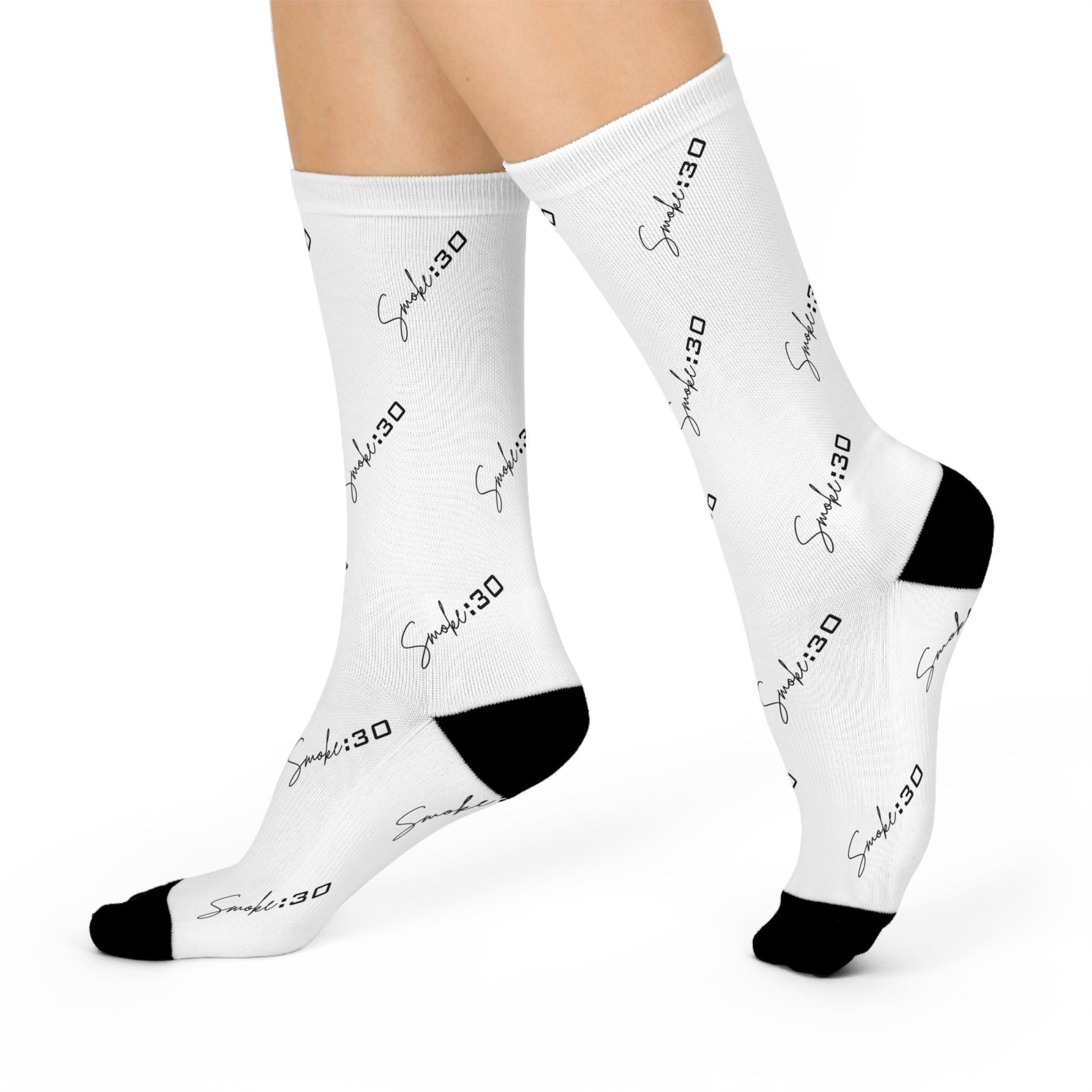 Rep the moment with every step in our Smoke:30 Logo Crew Socks. Featuring the sleek Smoke:30 logo repeated in a clean angled brick layout, these socks strike the perfect balance between luxury and laid-back. Designed for comfort and bold expression, they’re built to elevate your daily essentials game—whether you’re taking care of business or just kicking back.