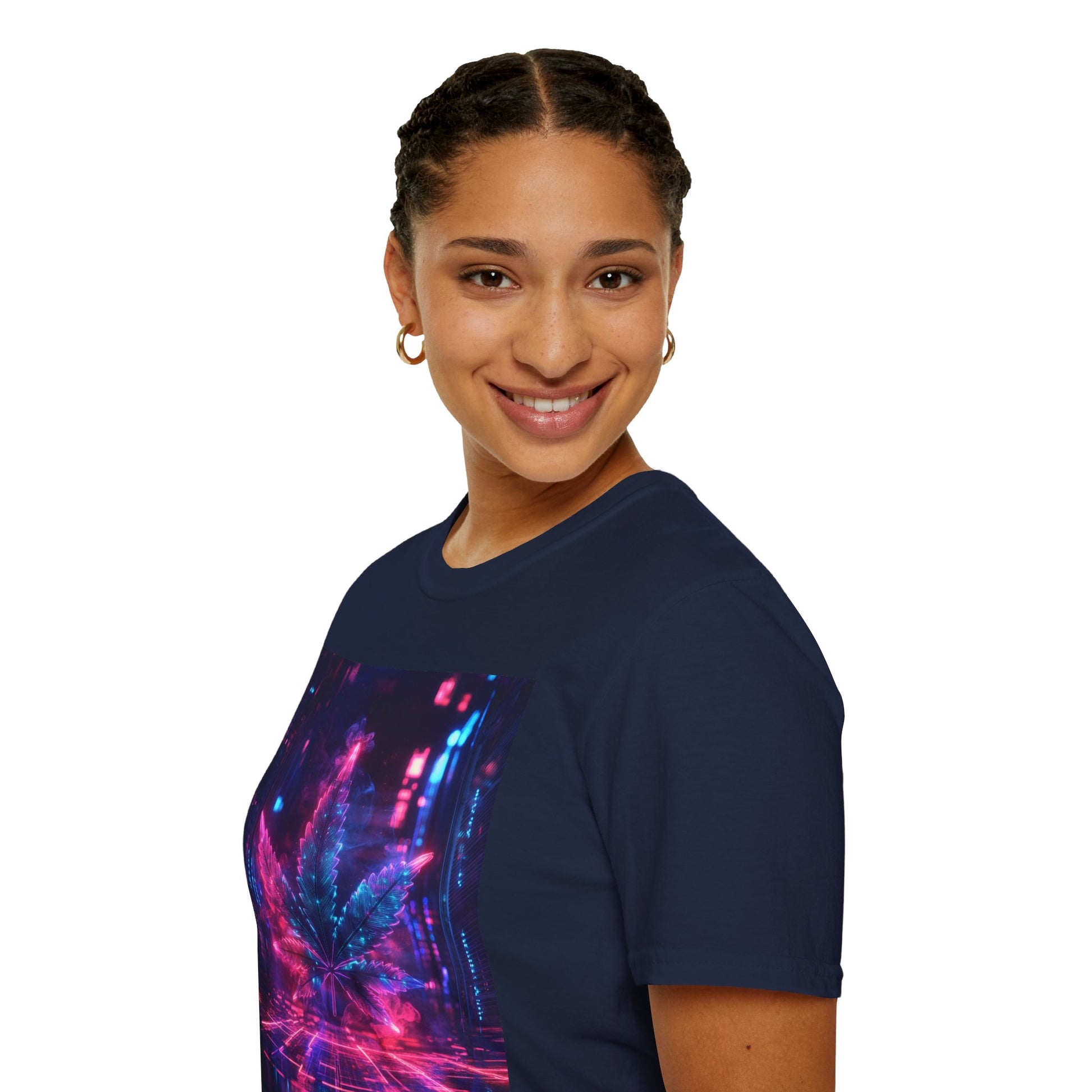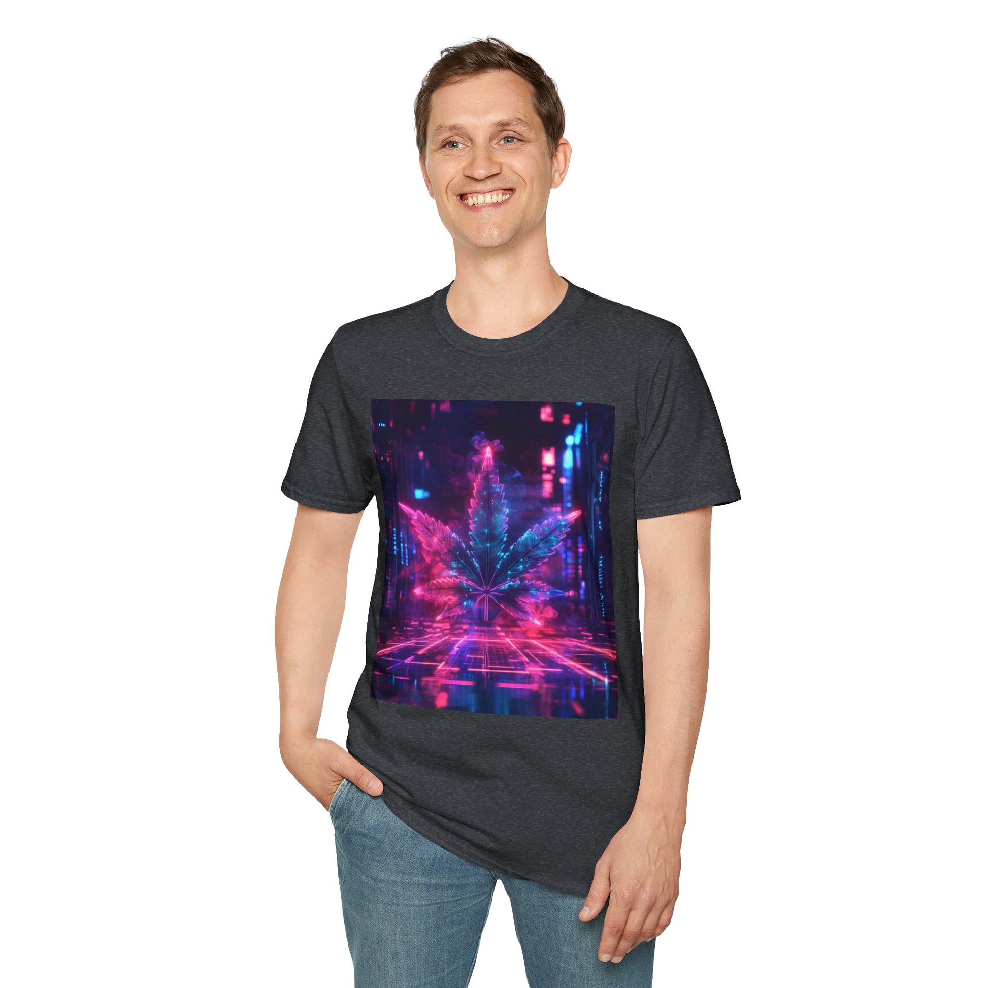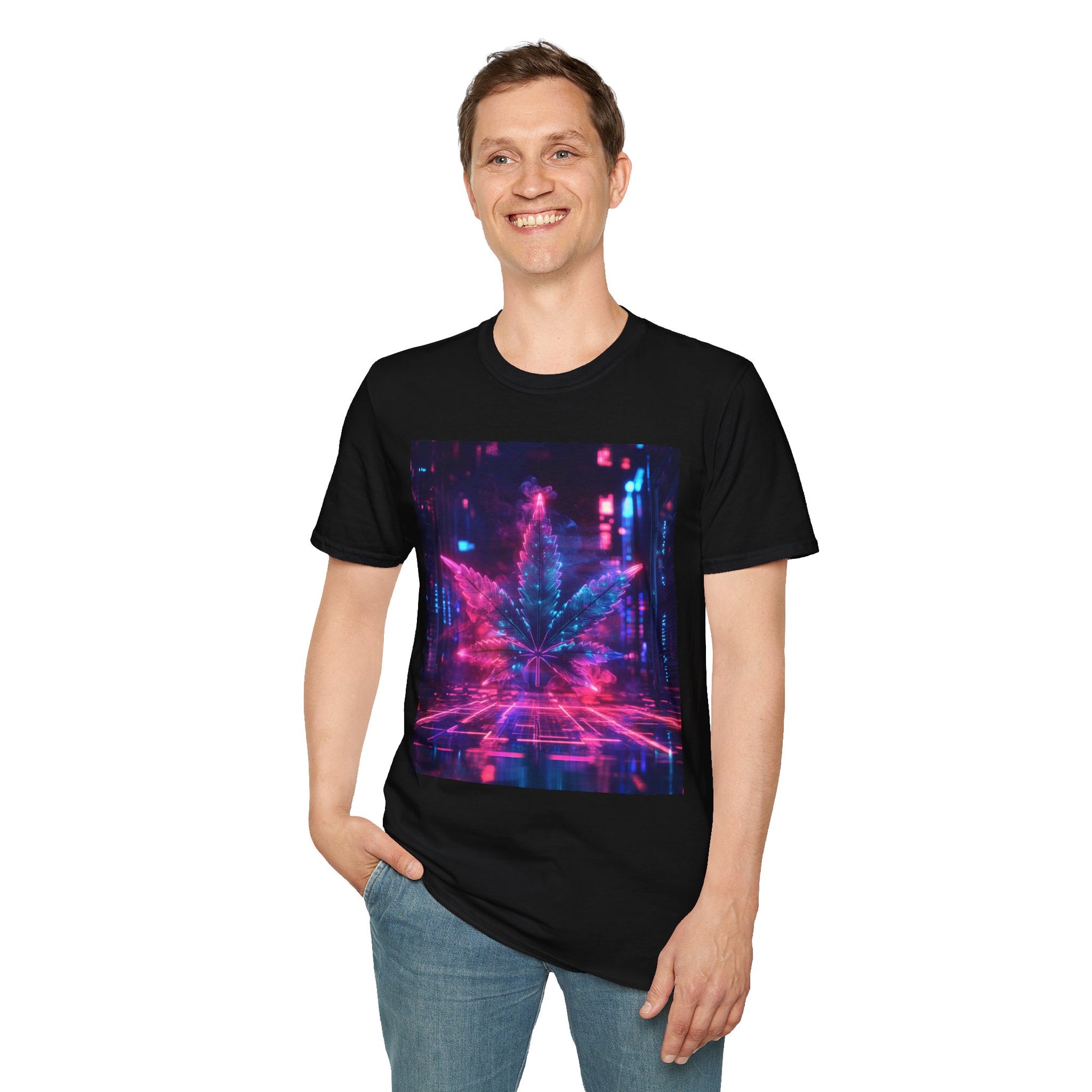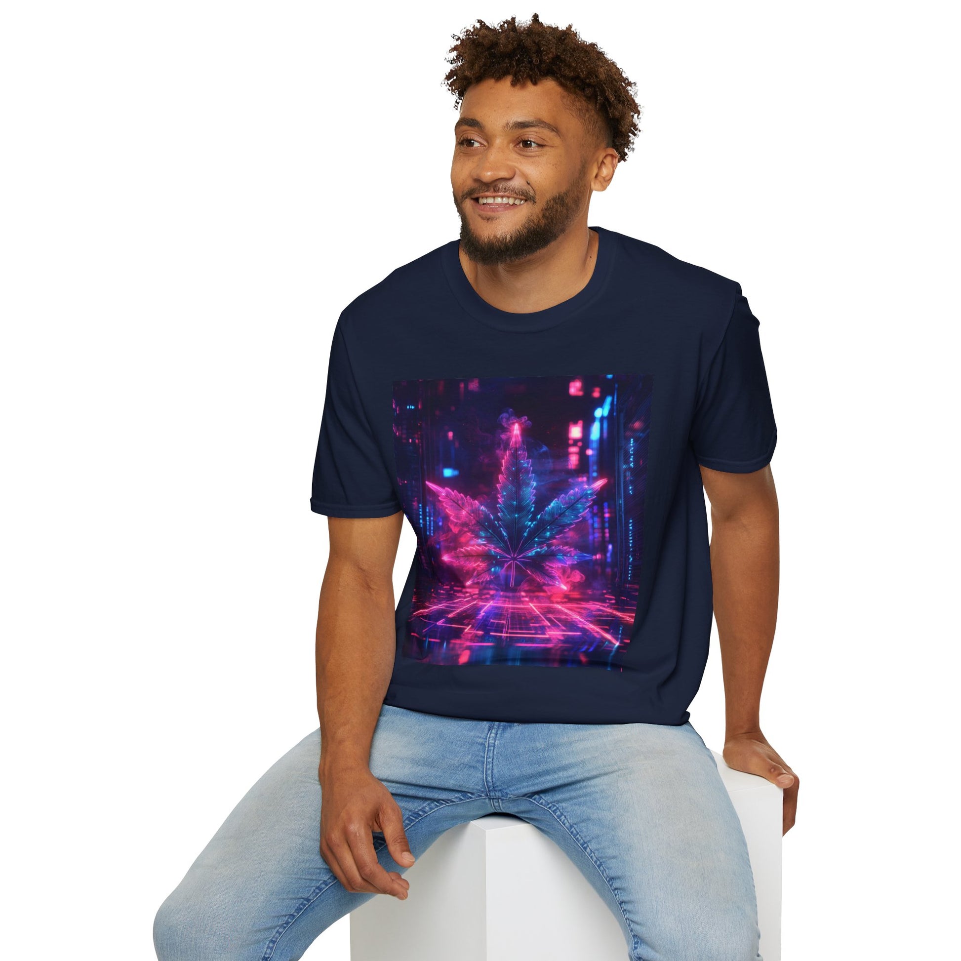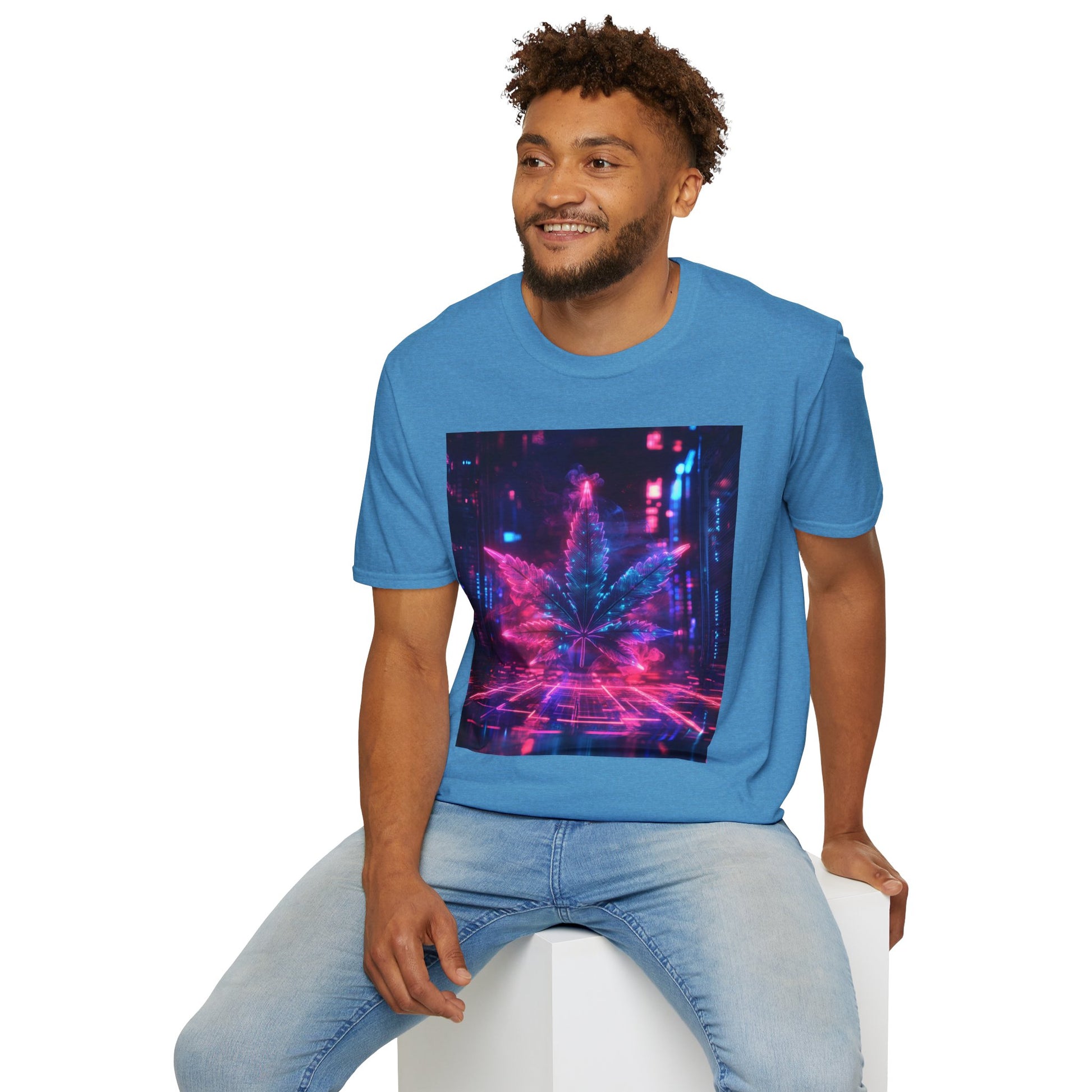 Step into the future of stoner fashion with this Cyber High T-shirt. Featuring a neon-lit marijuana leaf glowing in a futuristic digital cityscape, this tee fuses cyberpunk aesthetics with stoner culture for a truly next-level vibe. Whether you're sparking up or just flexing your chill, this design is a statement piece that pulses with electric energy.