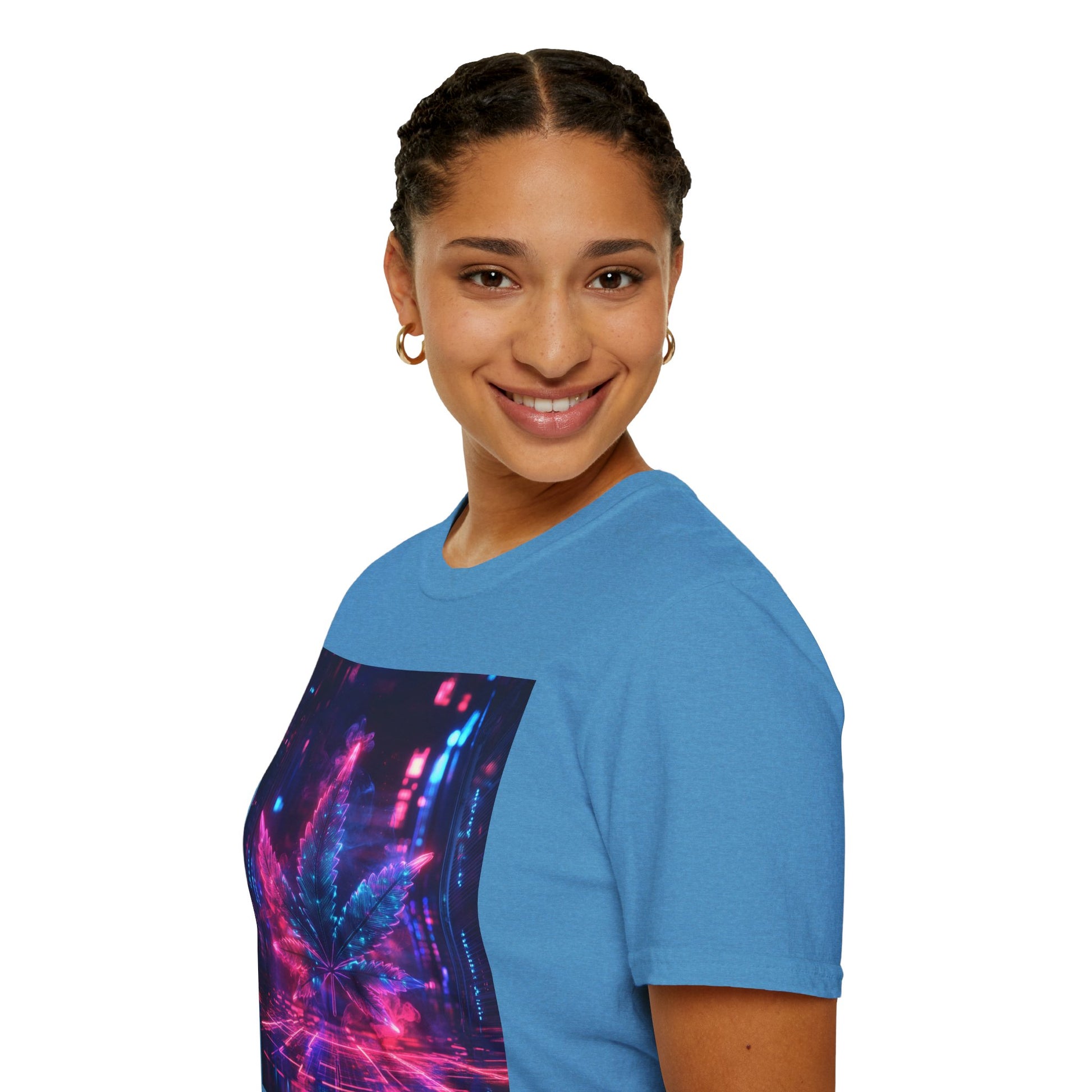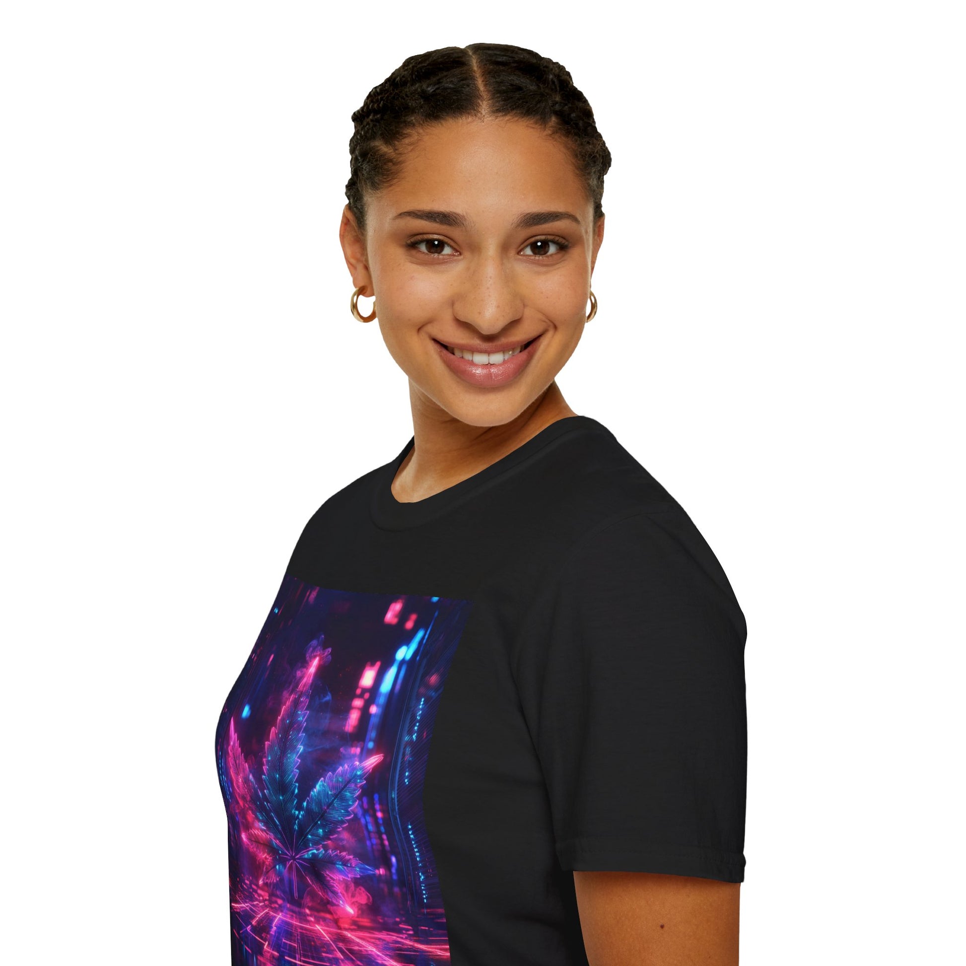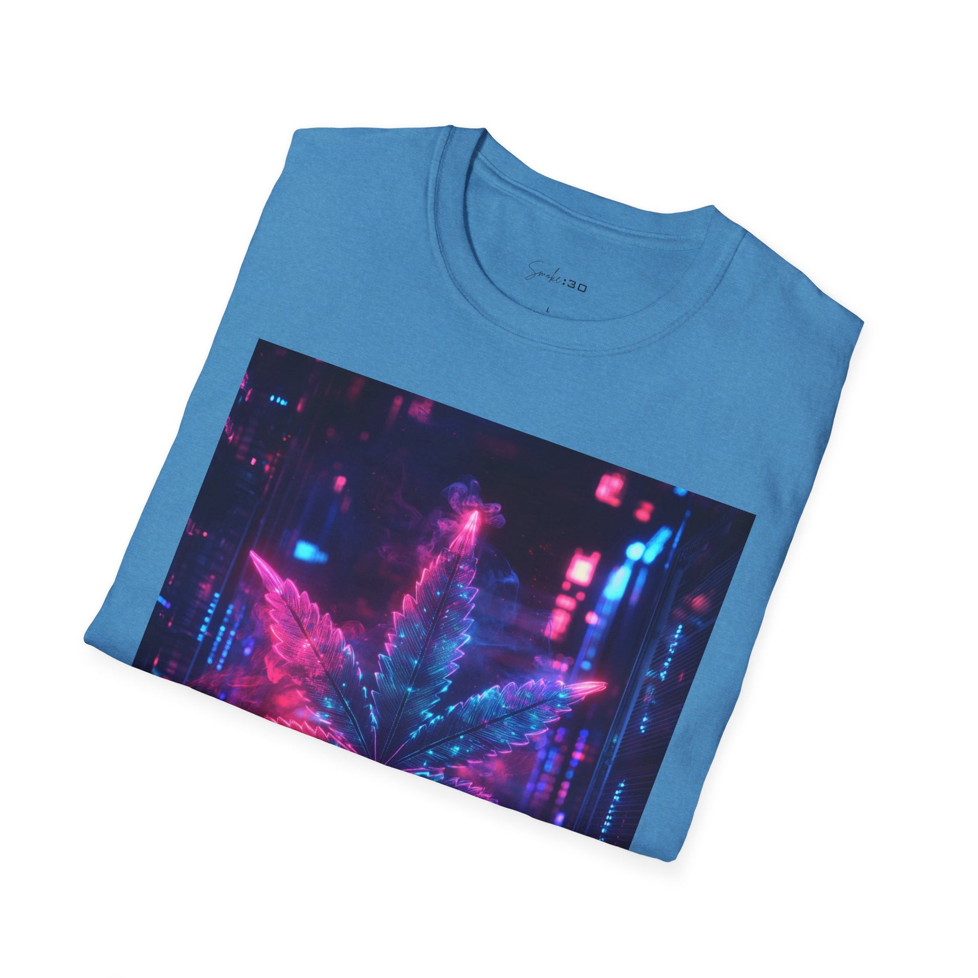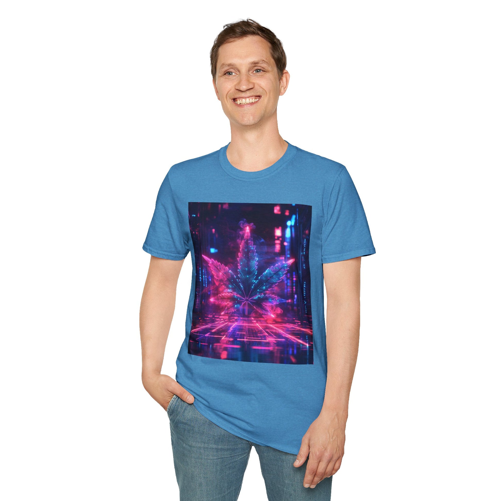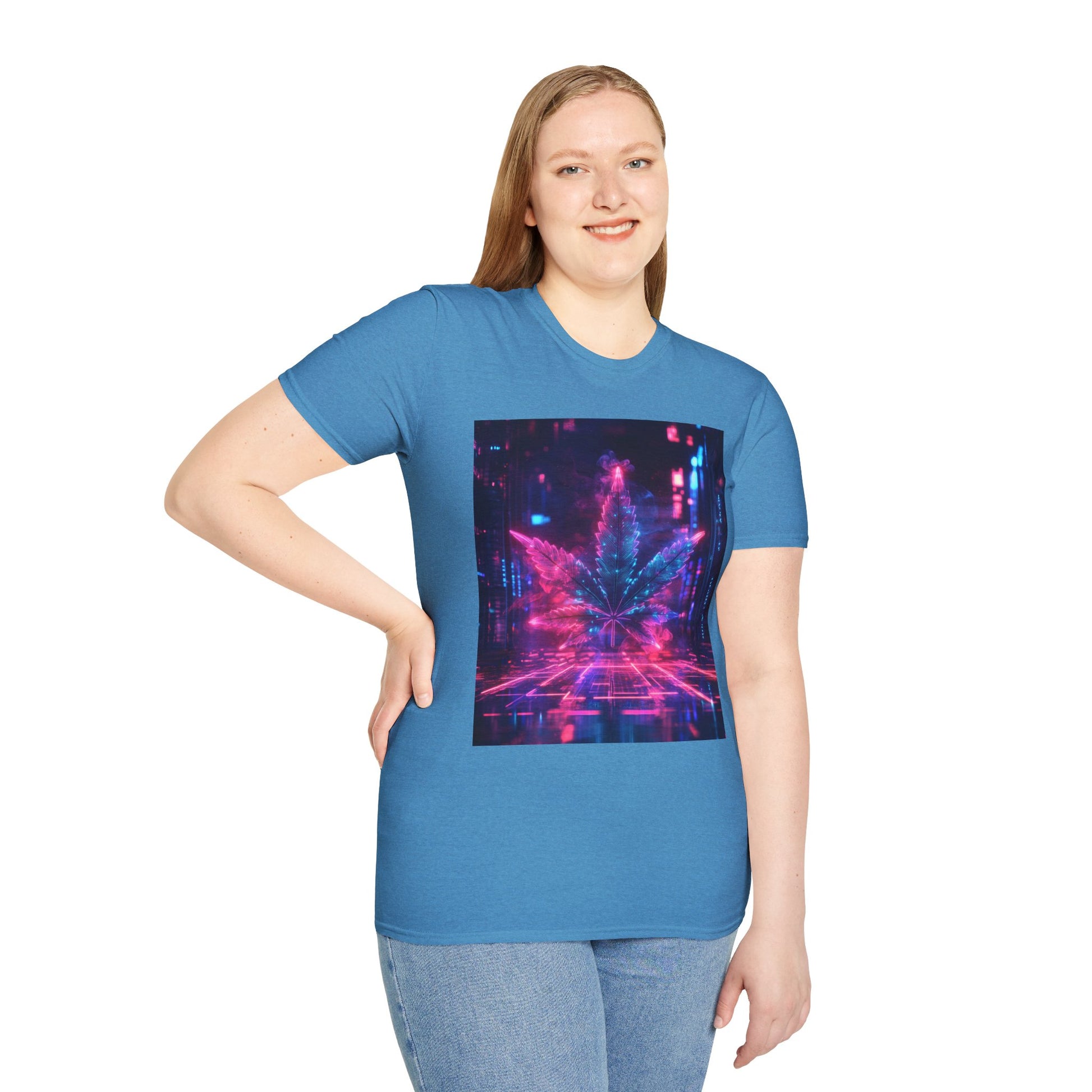Step into the future of stoner fashion with this Cyber High T-shirt. Featuring a neon-lit marijuana leaf glowing in a futuristic digital cityscape, this tee fuses cyberpunk aesthetics with stoner culture for a truly next-level vibe. Whether you're sparking up or just flexing your chill, this design is a statement piece that pulses with electric energy.