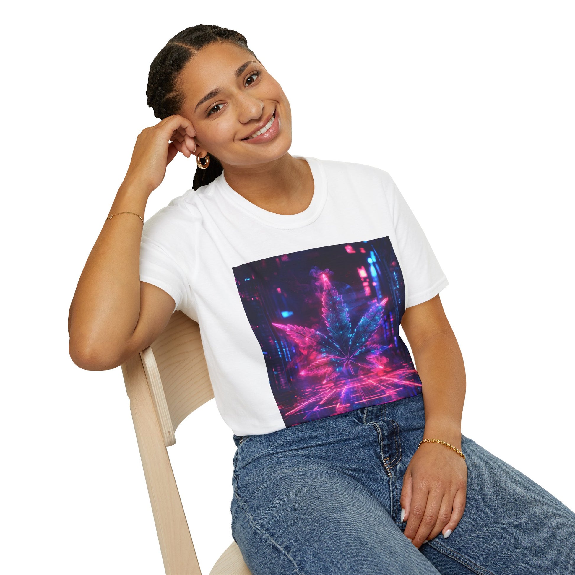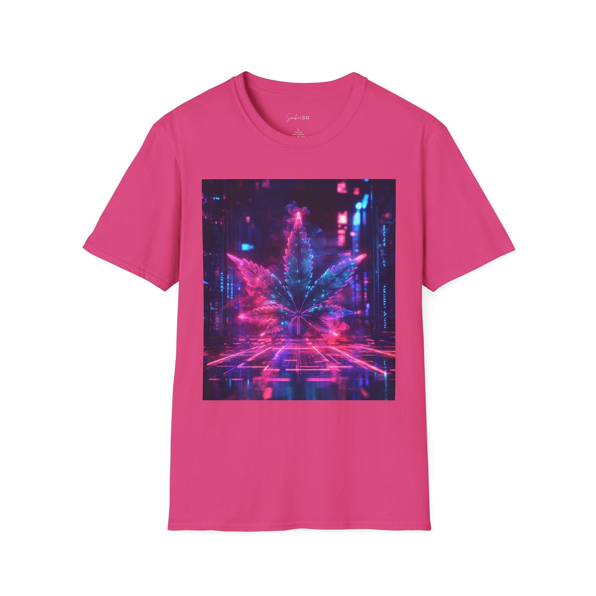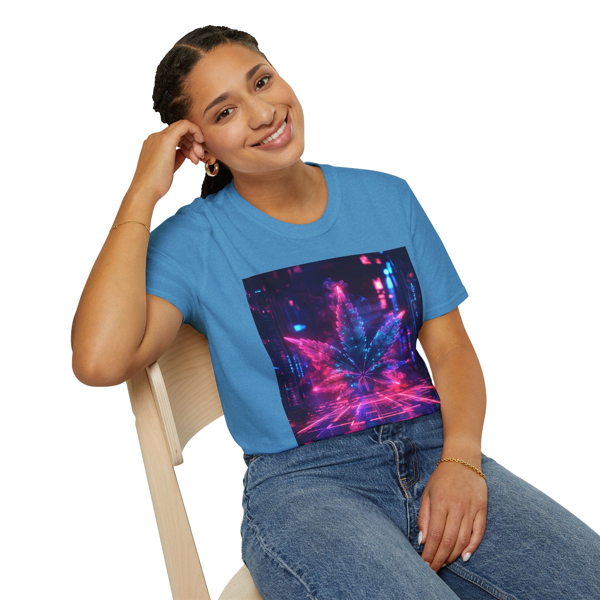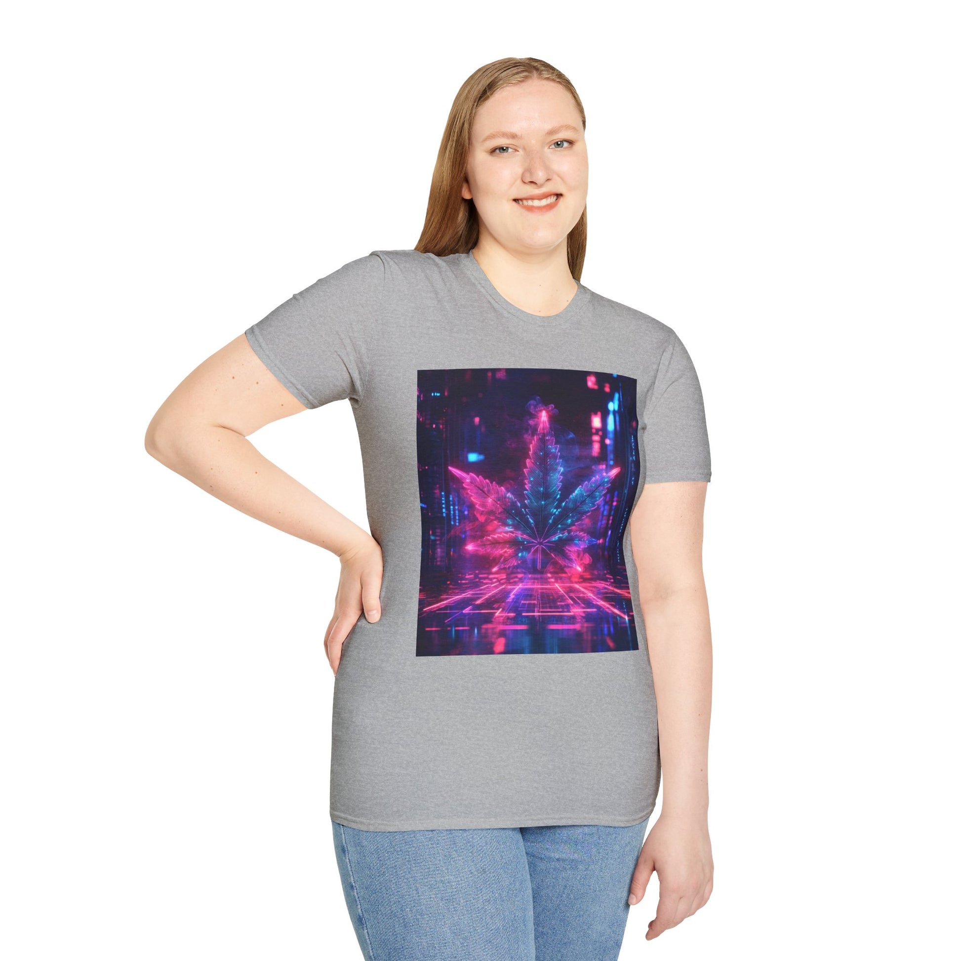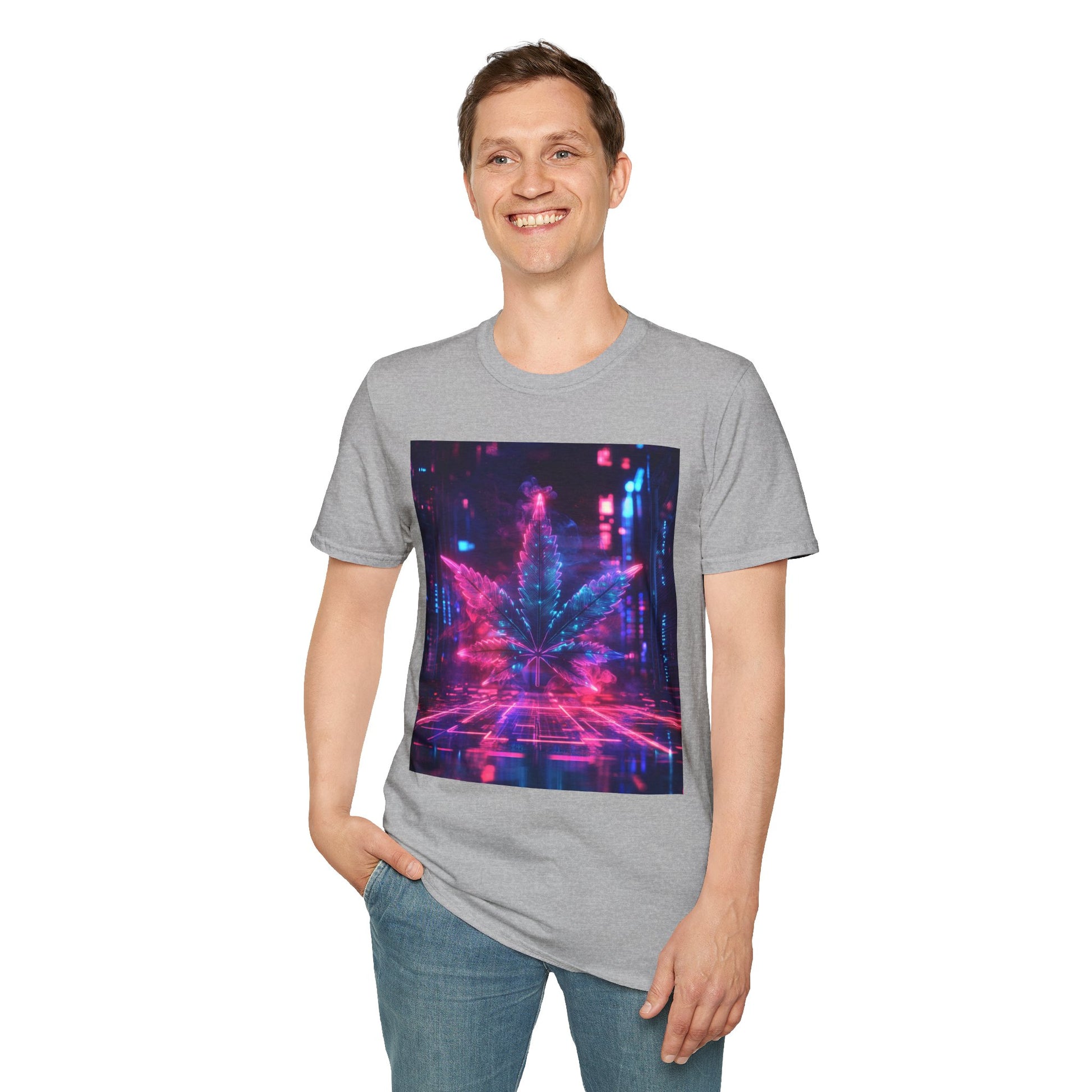 Step into the future of stoner fashion with this Cyber High T-shirt. Featuring a neon-lit marijuana leaf glowing in a futuristic digital cityscape, this tee fuses cyberpunk aesthetics with stoner culture for a truly next-level vibe. Whether you're sparking up or just flexing your chill, this design is a statement piece that pulses with electric energy.
