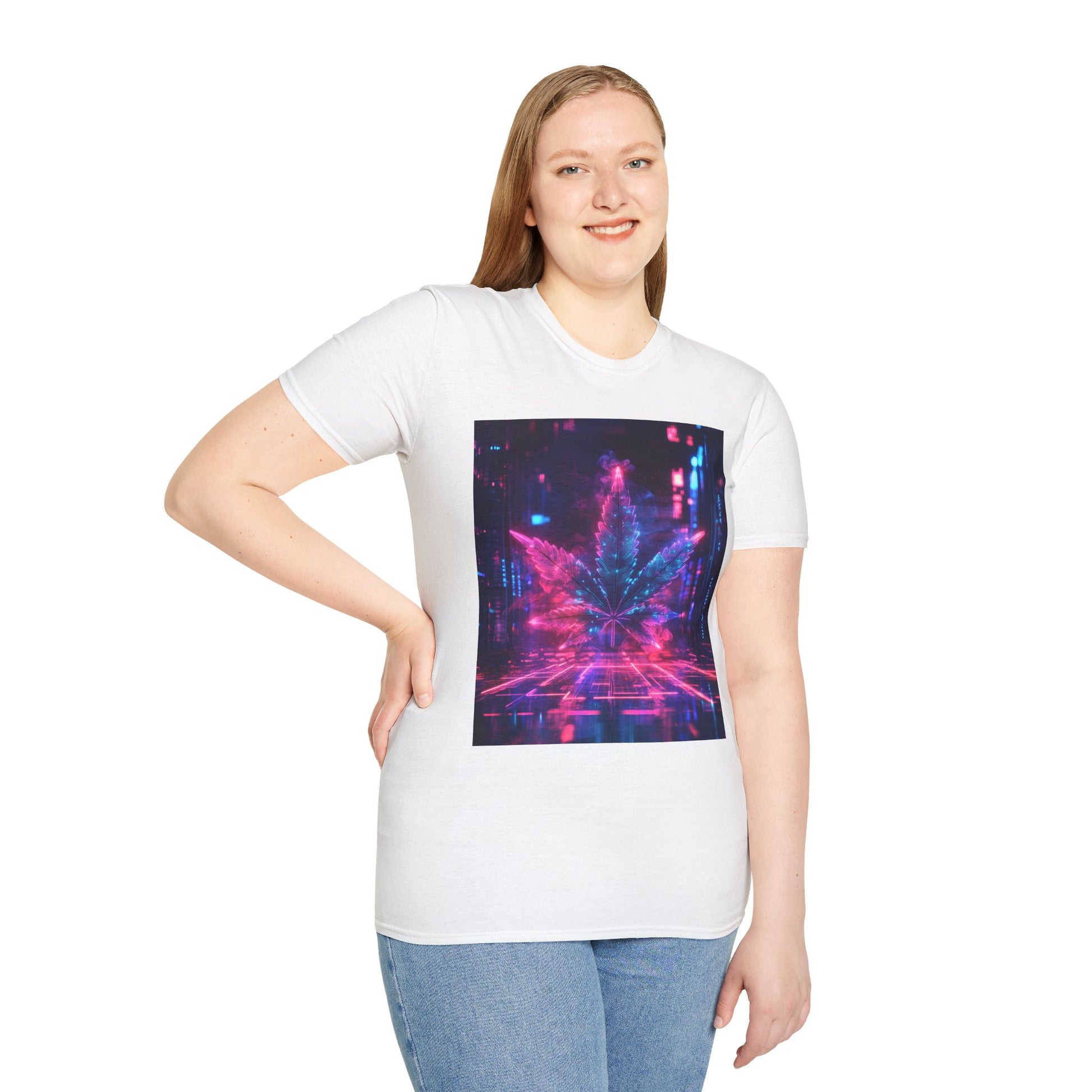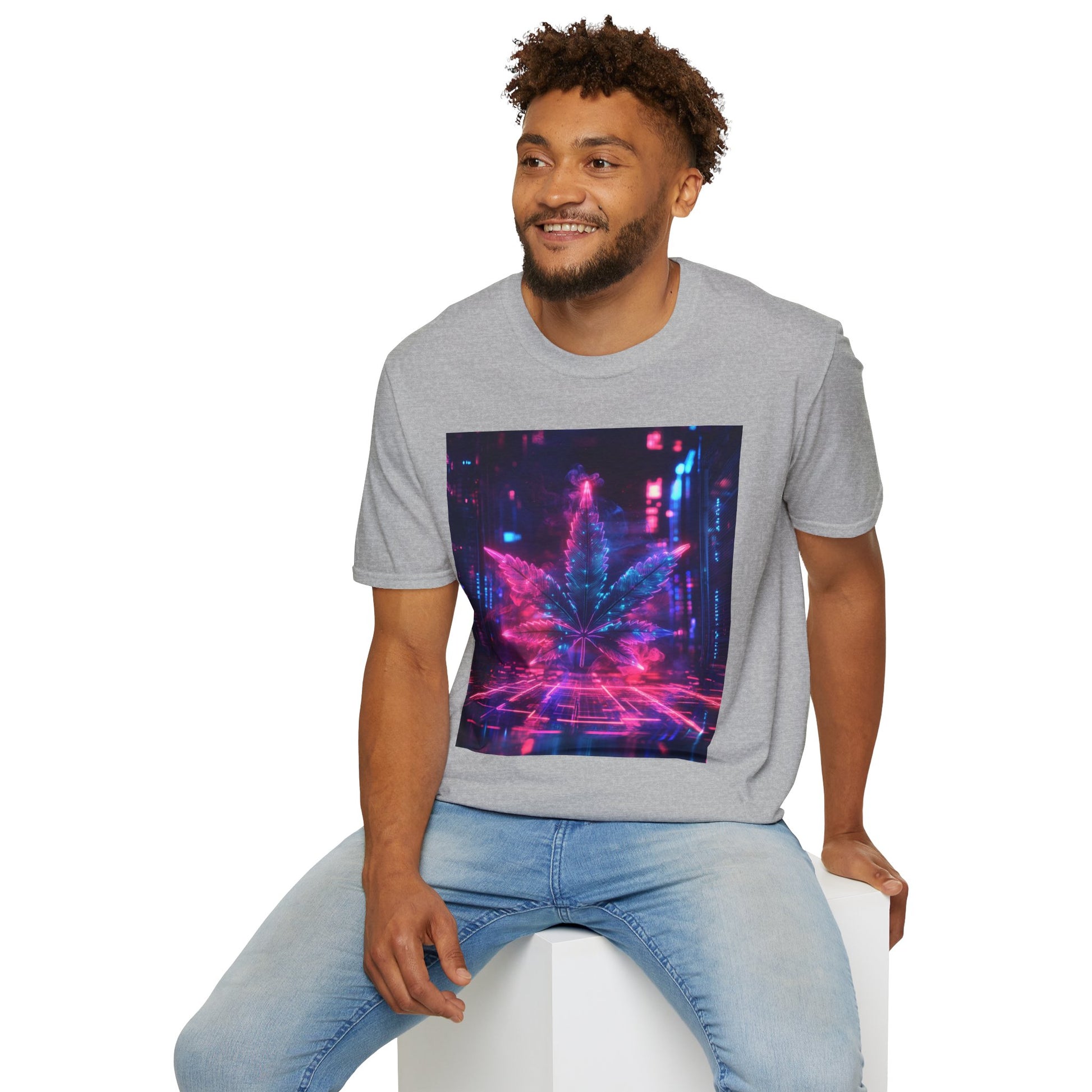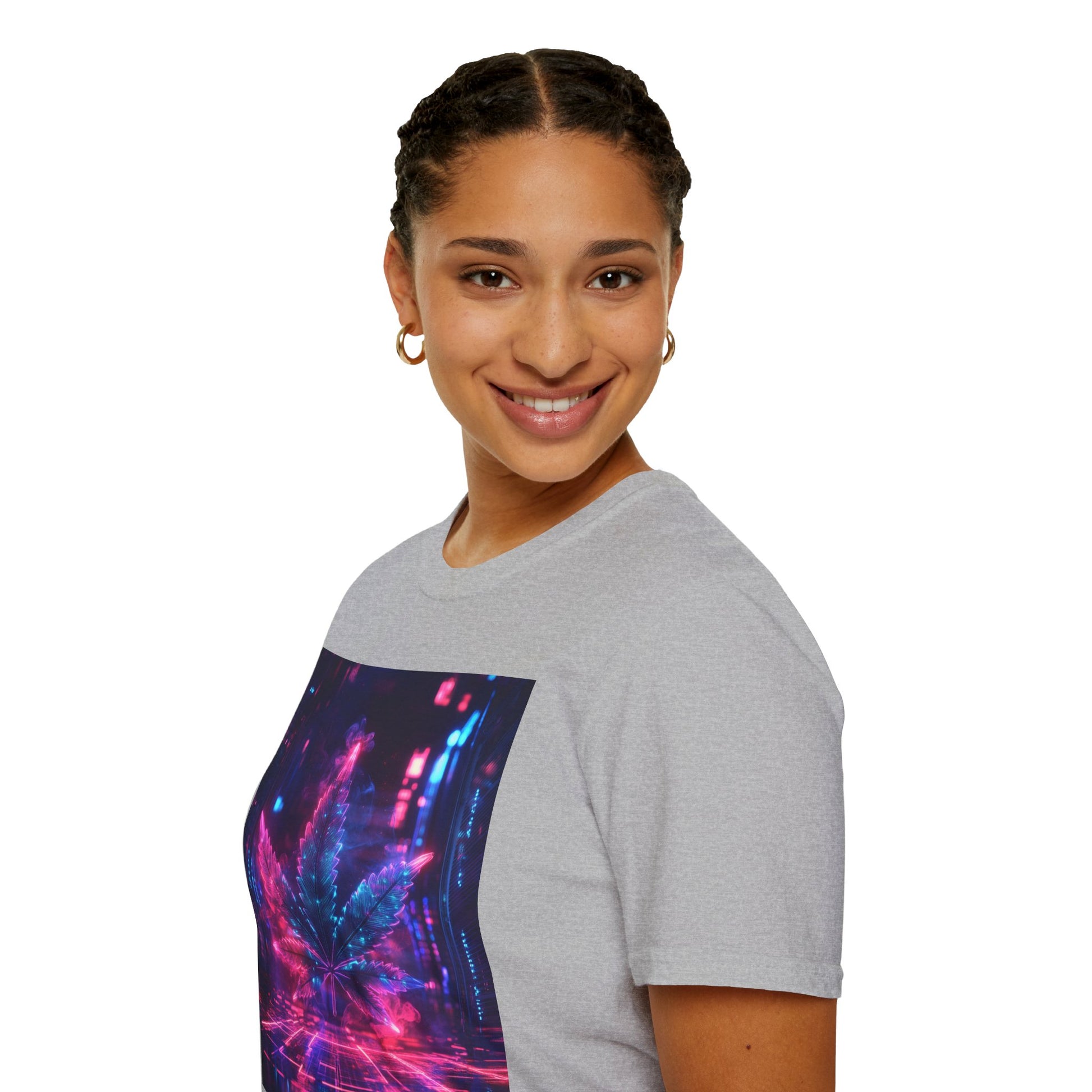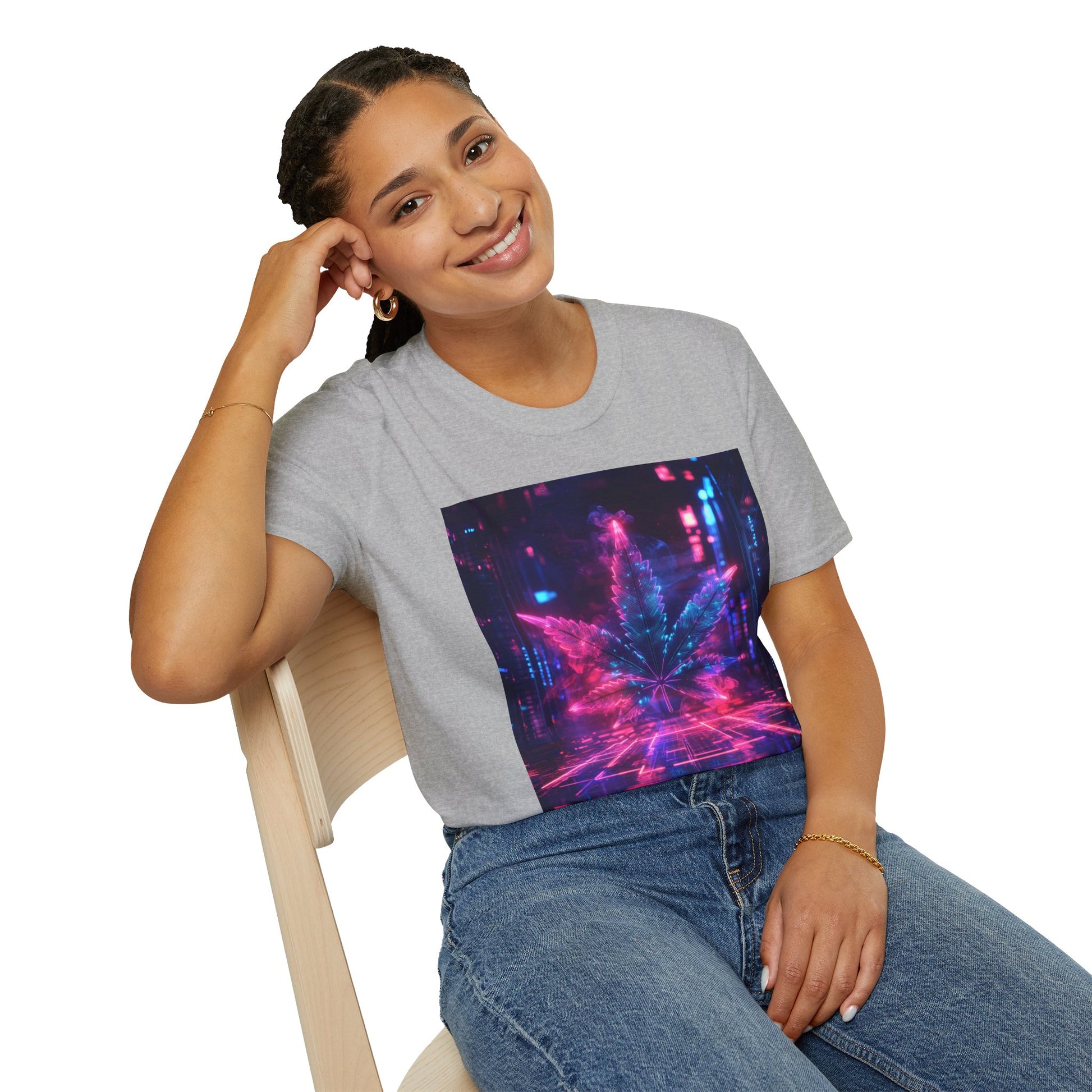 Step into the future of stoner fashion with this Cyber High T-shirt. Featuring a neon-lit marijuana leaf glowing in a futuristic digital cityscape, this tee fuses cyberpunk aesthetics with stoner culture for a truly next-level vibe. Whether you're sparking up or just flexing your chill, this design is a statement piece that pulses with electric energy.