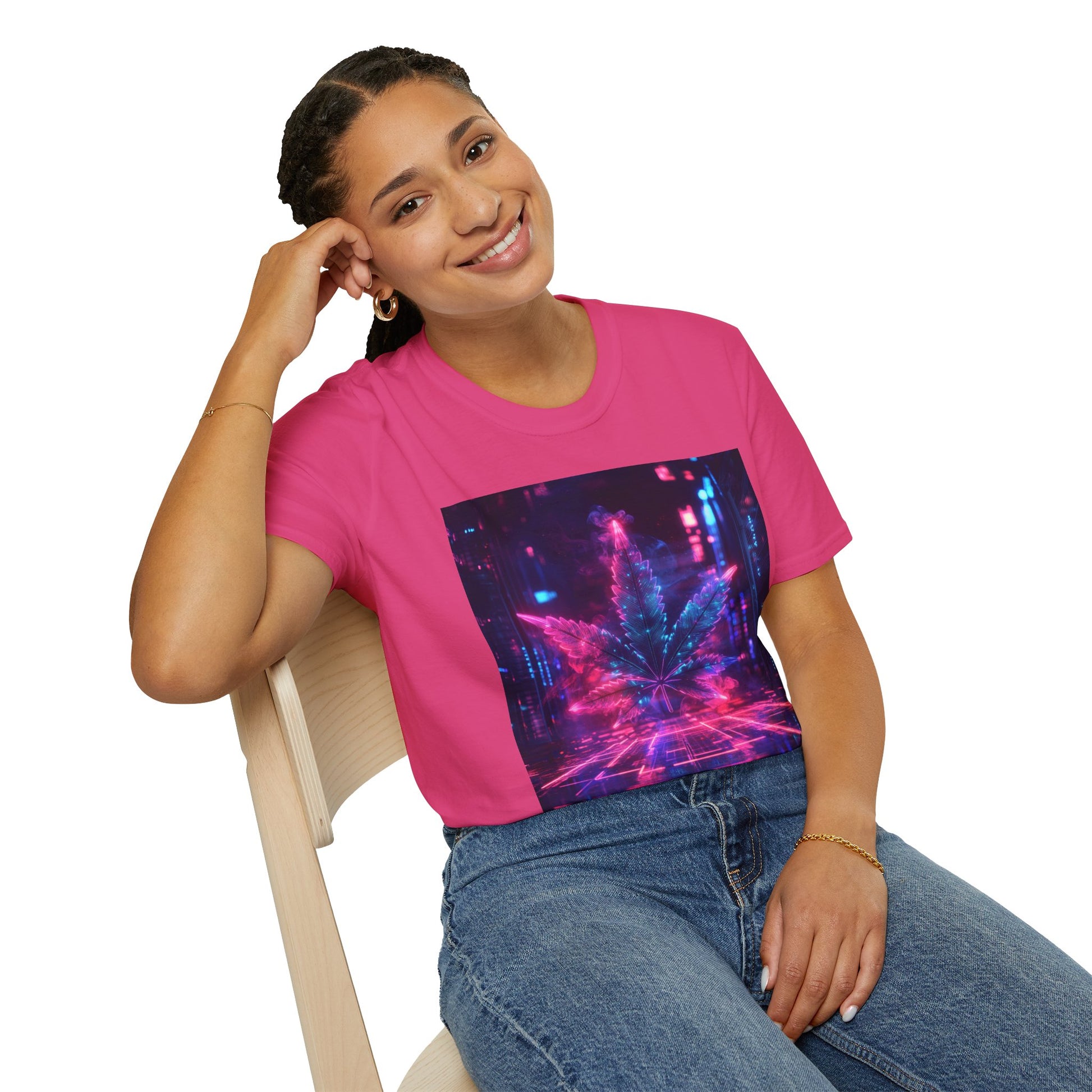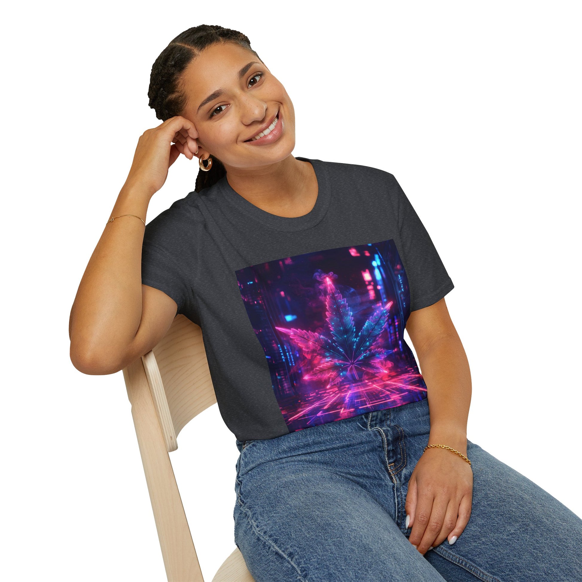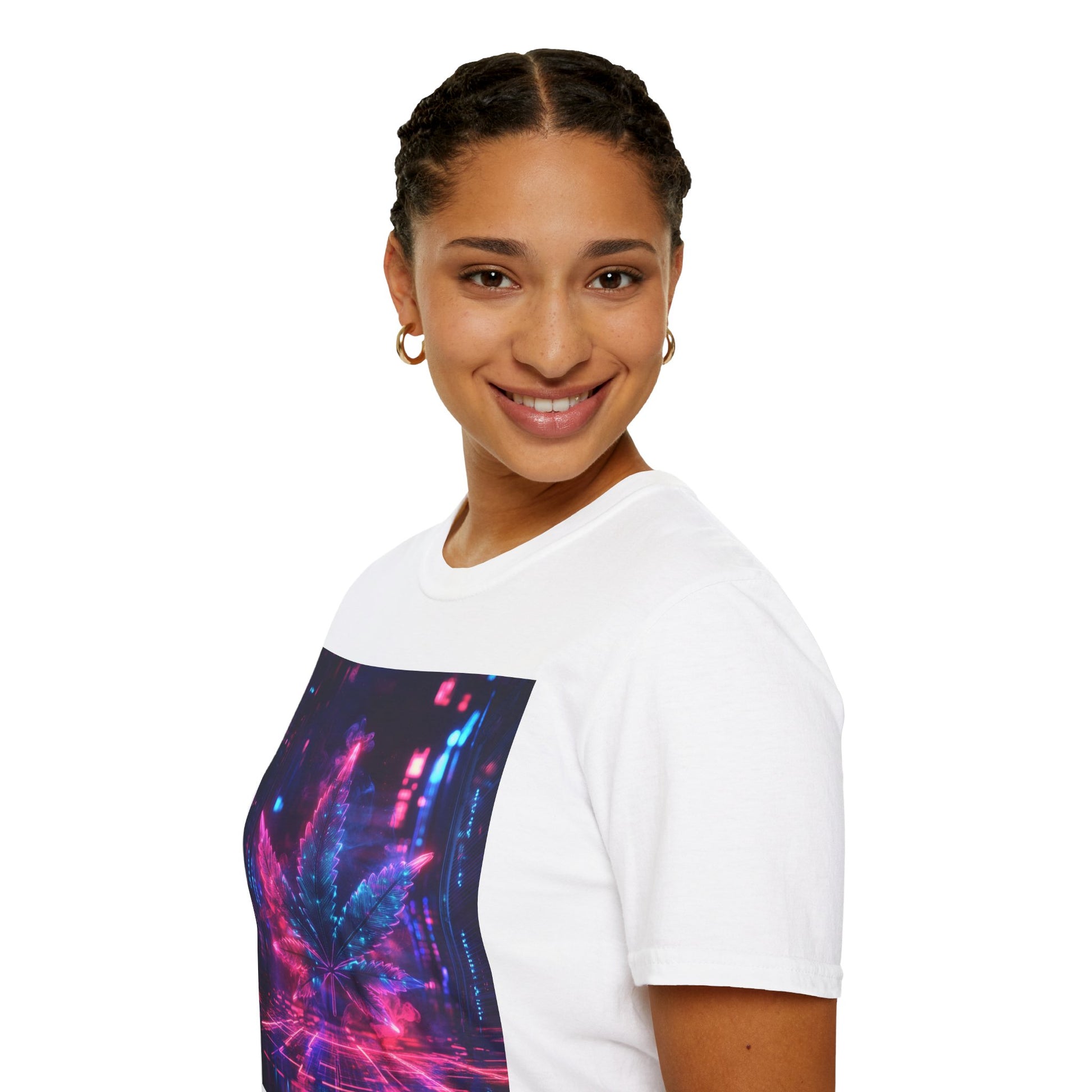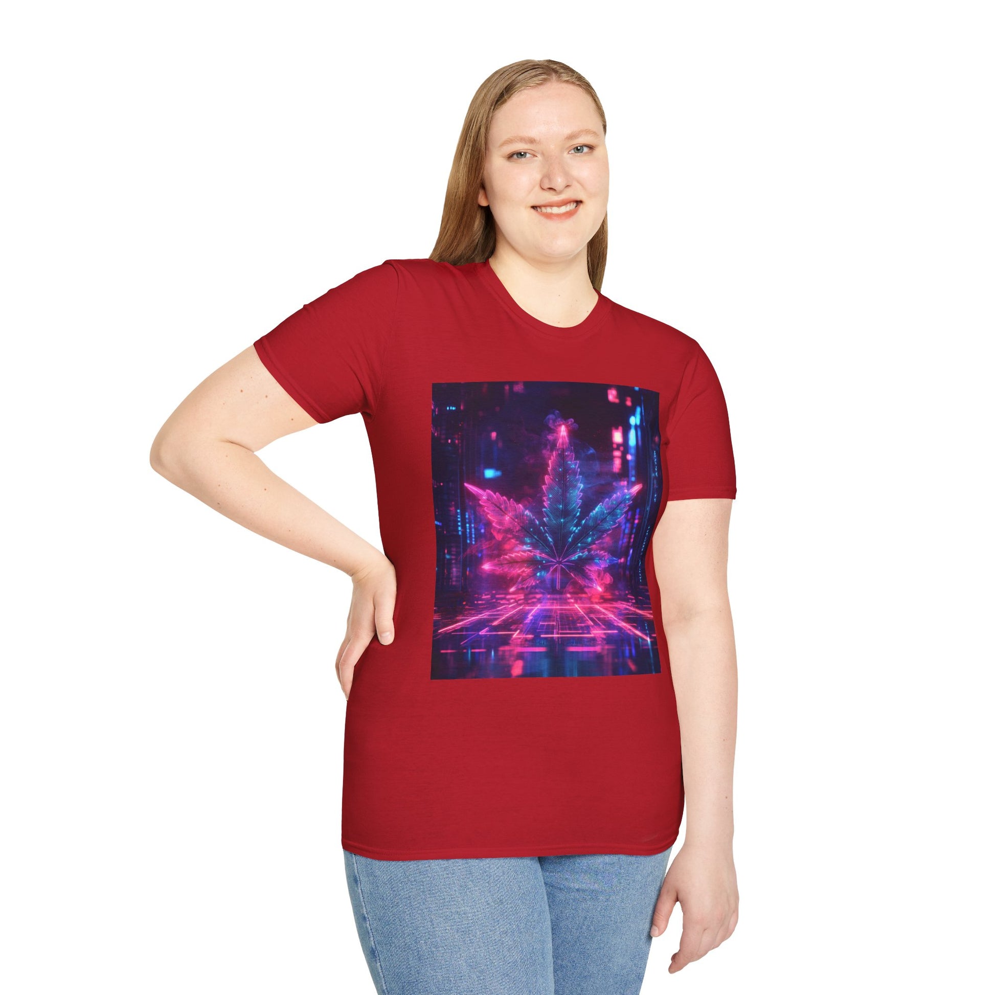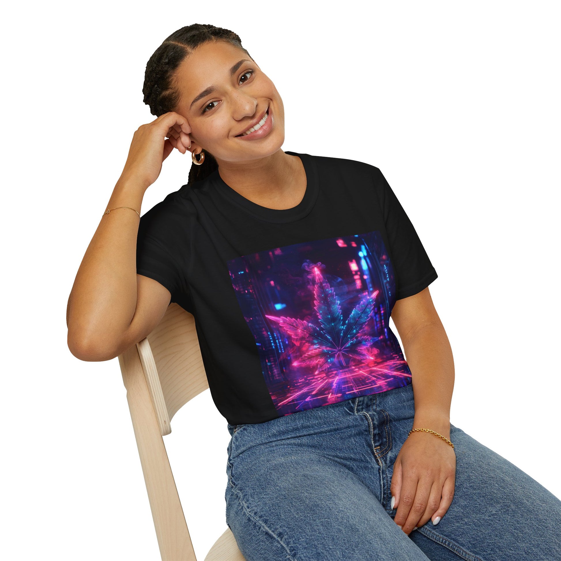 Step into the future of stoner fashion with this Cyber High T-shirt. Featuring a neon-lit marijuana leaf glowing in a futuristic digital cityscape, this tee fuses cyberpunk aesthetics with stoner culture for a truly next-level vibe. Whether you're sparking up or just flexing your chill, this design is a statement piece that pulses with electric energy.