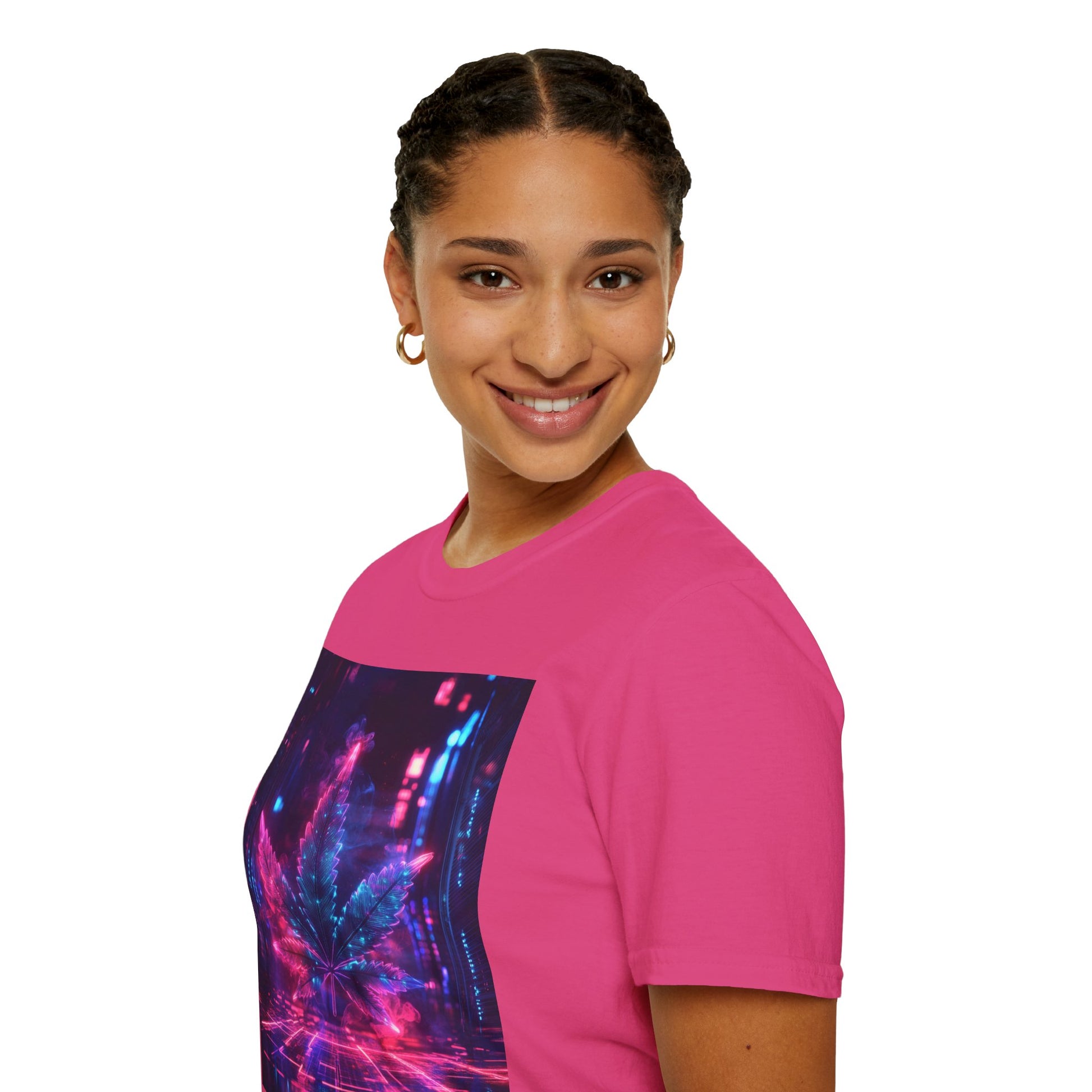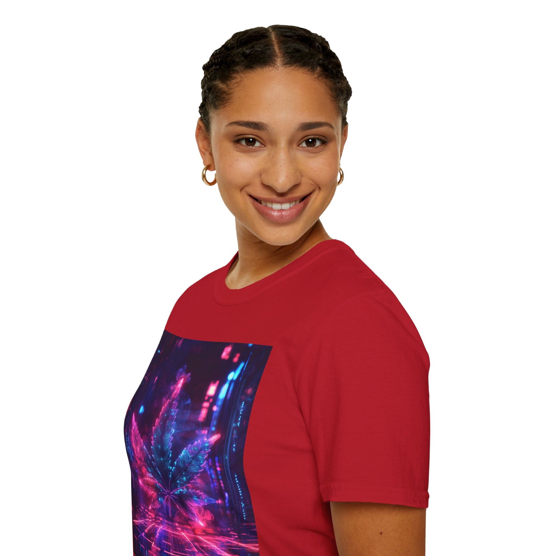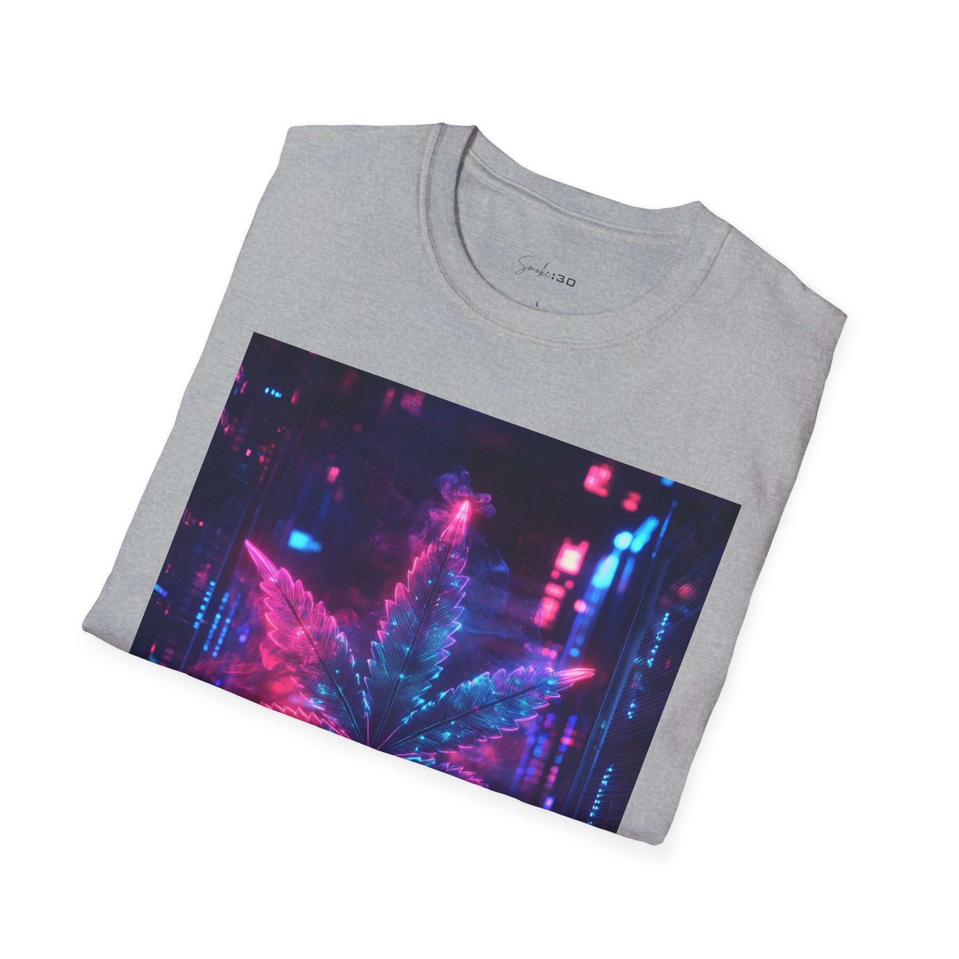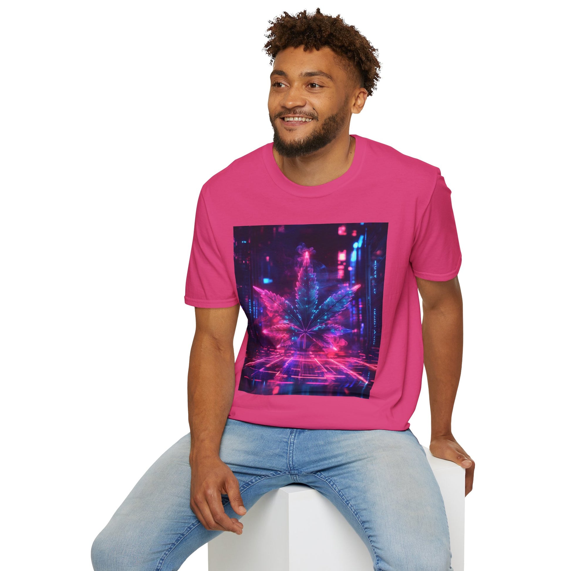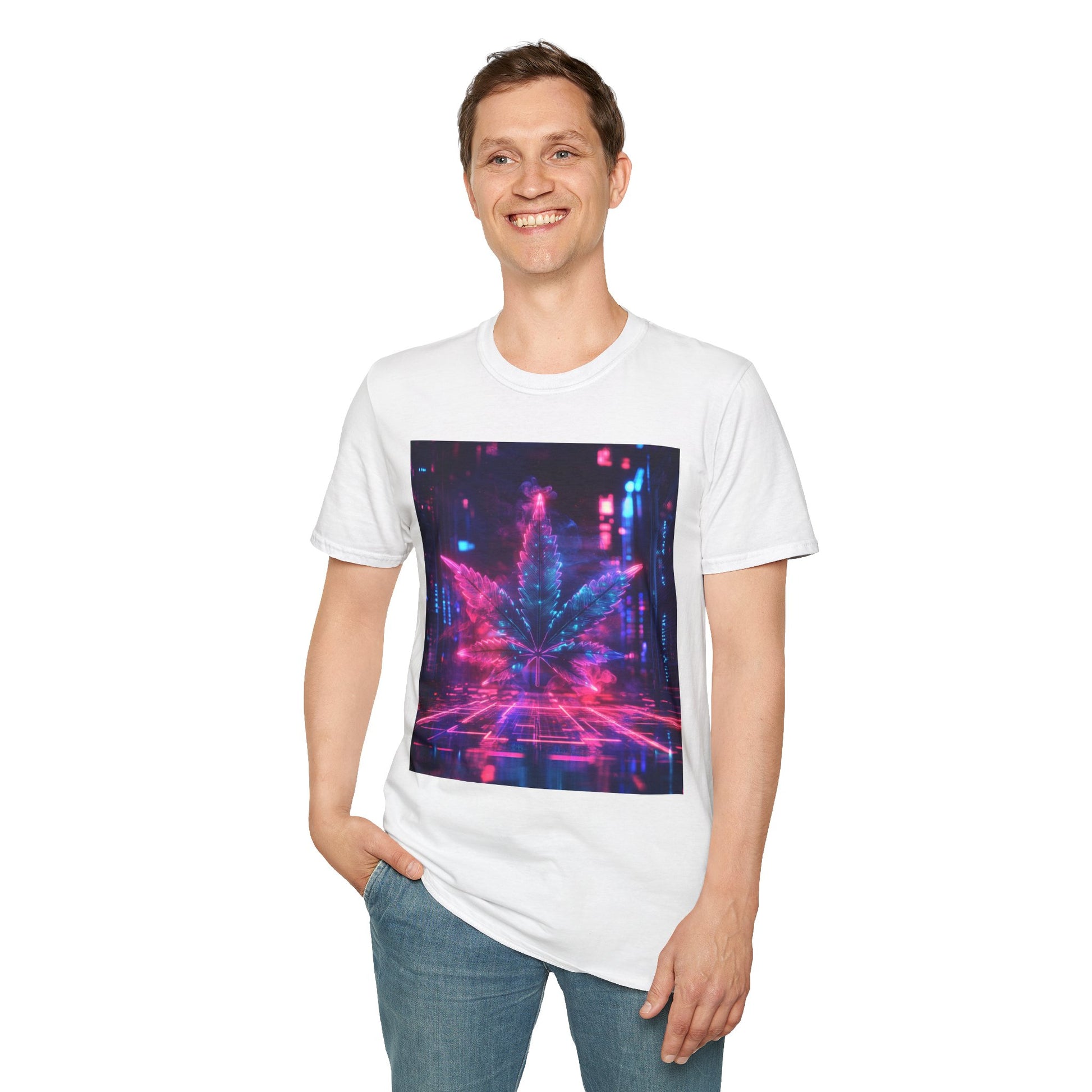 Step into the future of stoner fashion with this Cyber High T-shirt. Featuring a neon-lit marijuana leaf glowing in a futuristic digital cityscape, this tee fuses cyberpunk aesthetics with stoner culture for a truly next-level vibe. Whether you're sparking up or just flexing your chill, this design is a statement piece that pulses with electric energy.