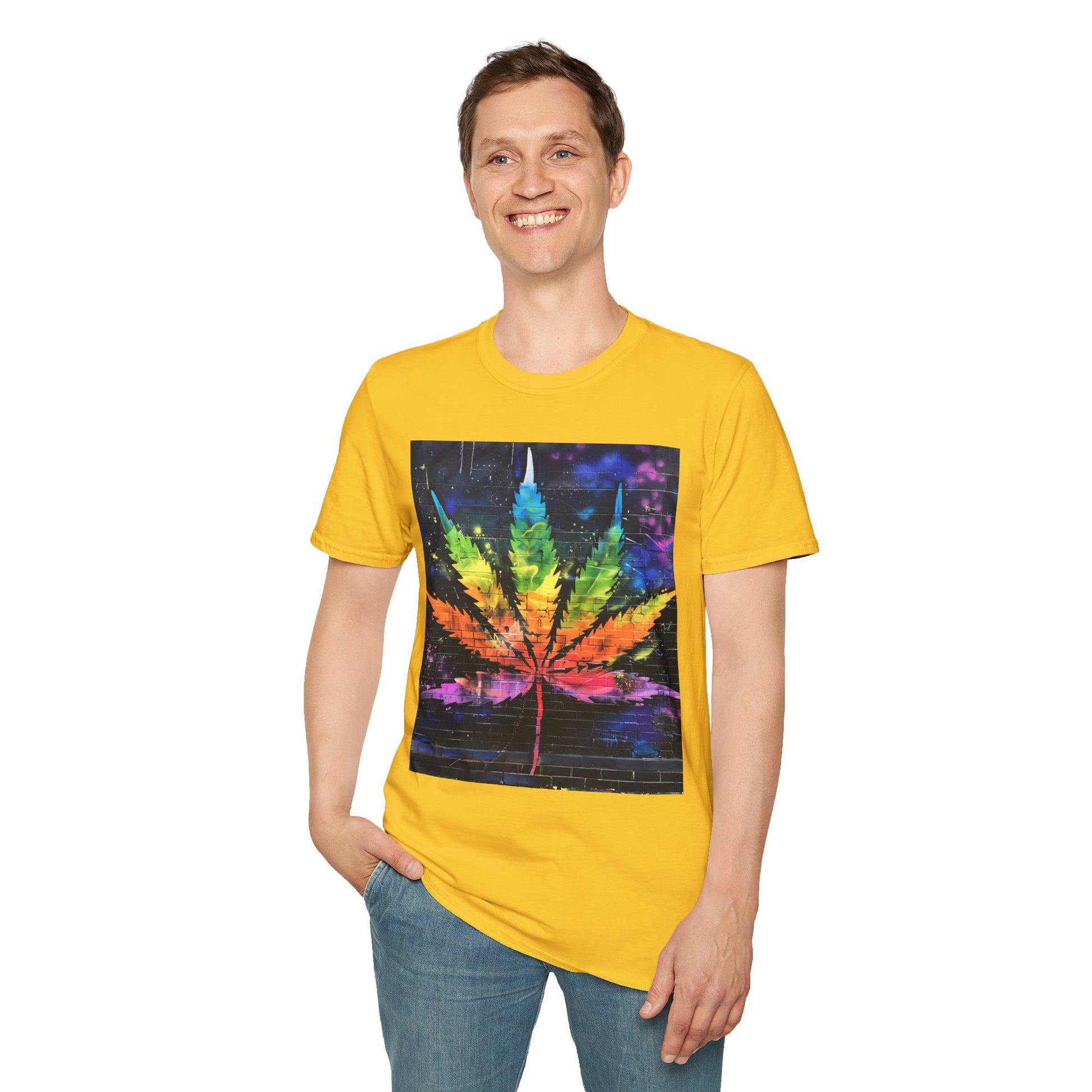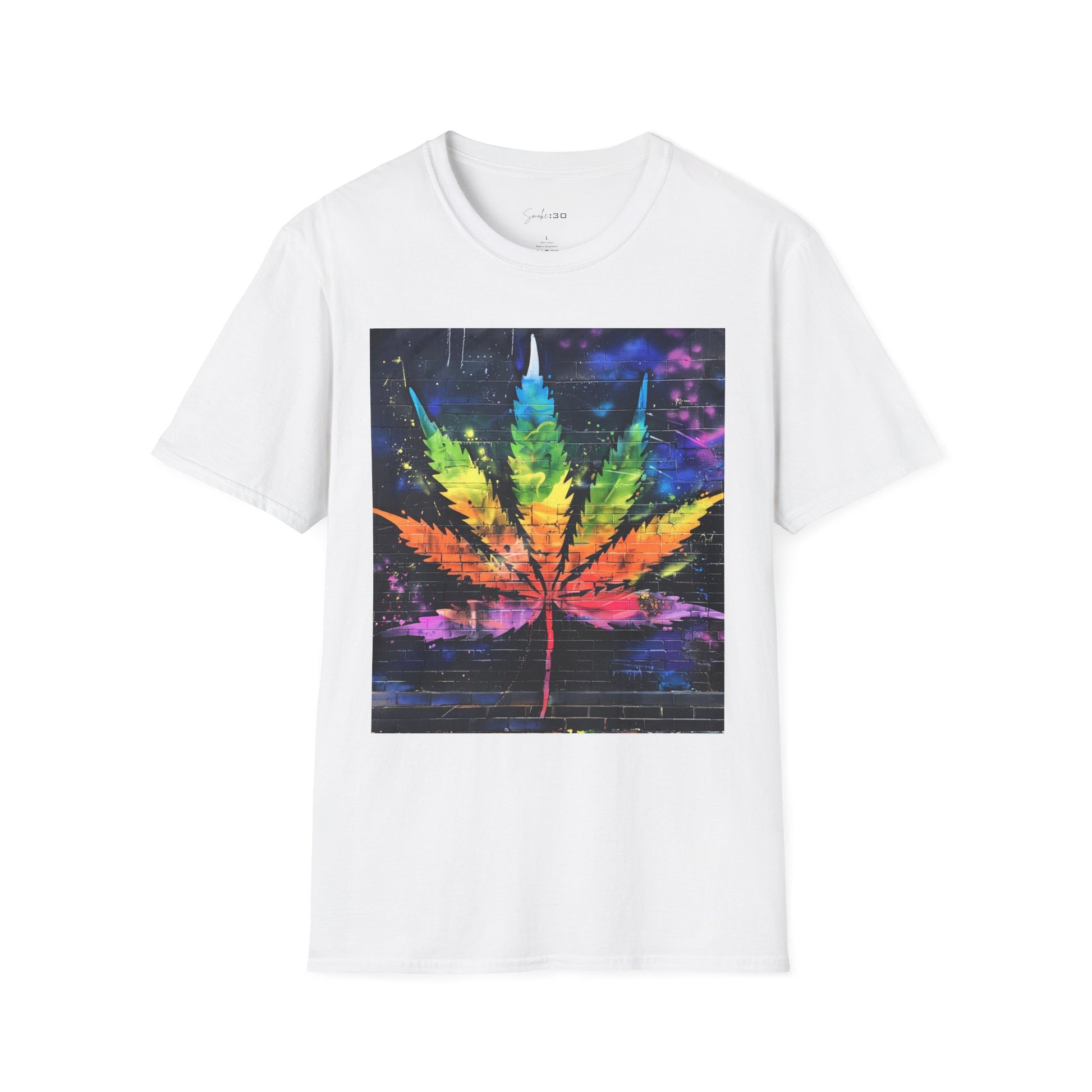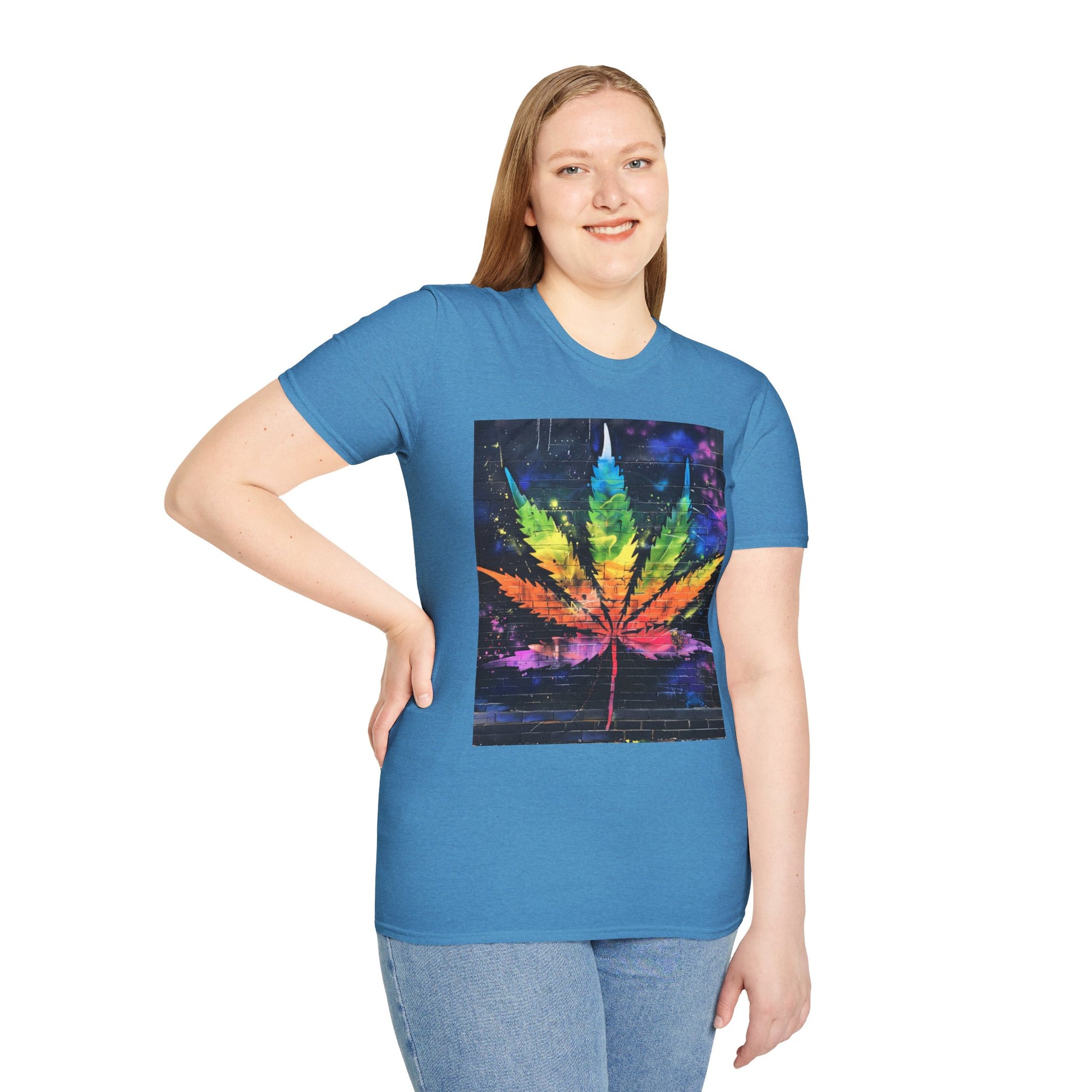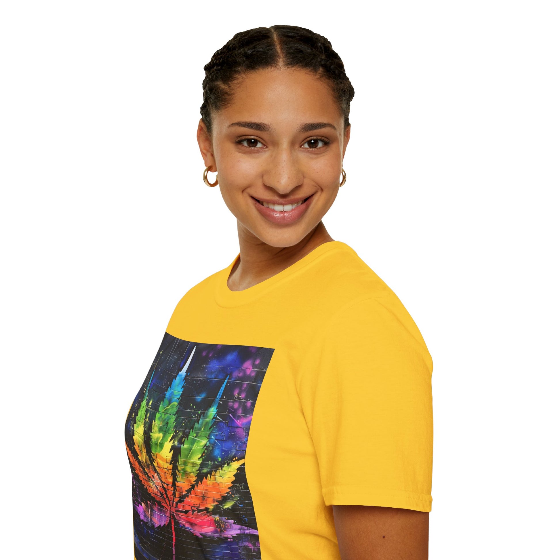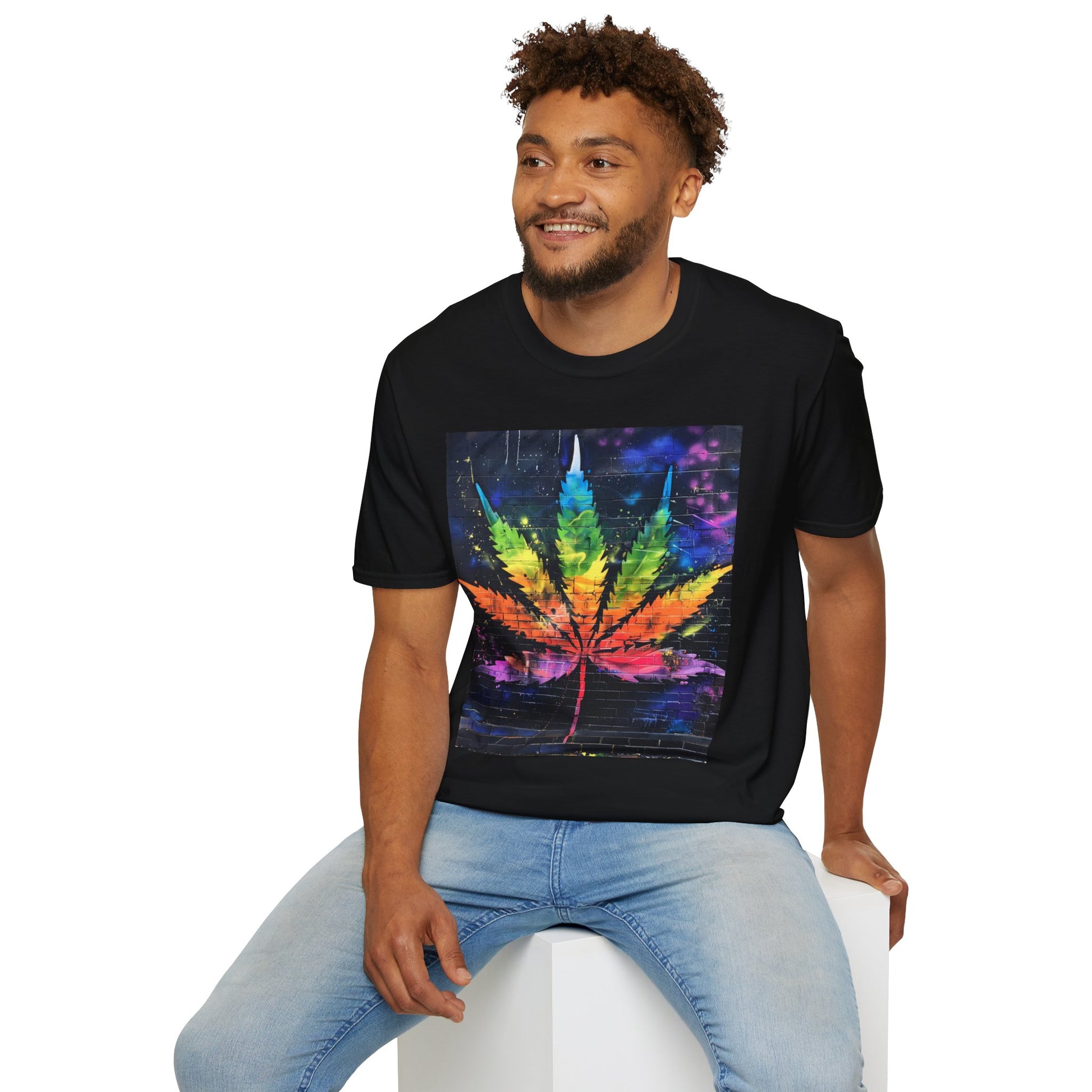 This shirt drips with bold graffiti energy—like it was blasted onto a back-alley brick wall with a can of neon rebellion. This isn’t just a weed leaf, it’s a full-blown street art moment, lit in every color of the spectrum and framed by cosmic splatter. Raw, loud, and unapologetically vibrant, this piece reps the culture with every pixel and paint drip.