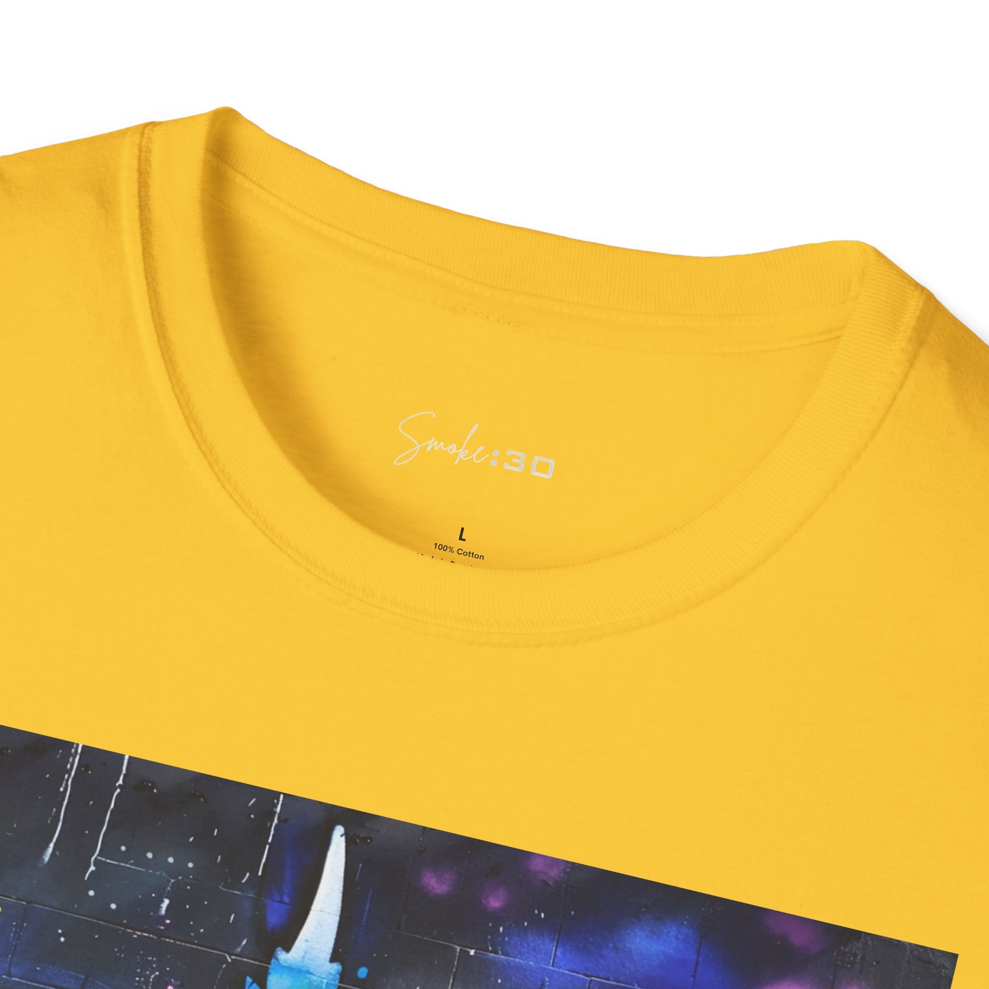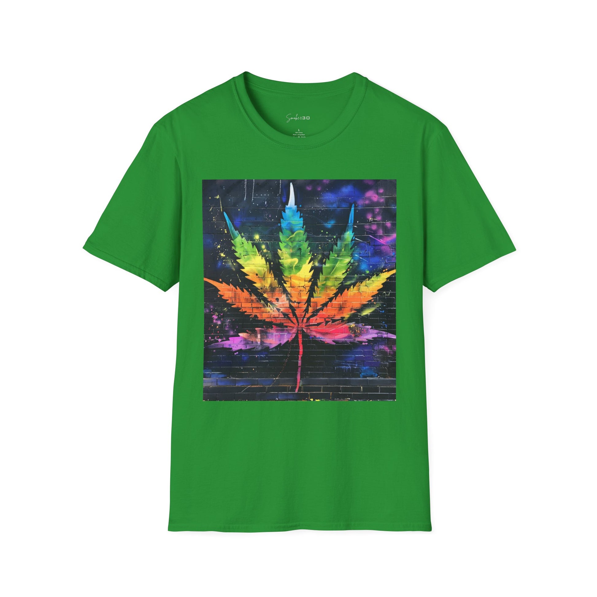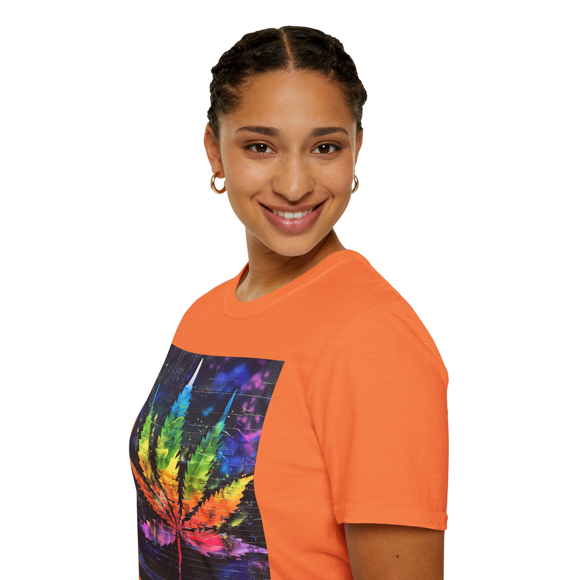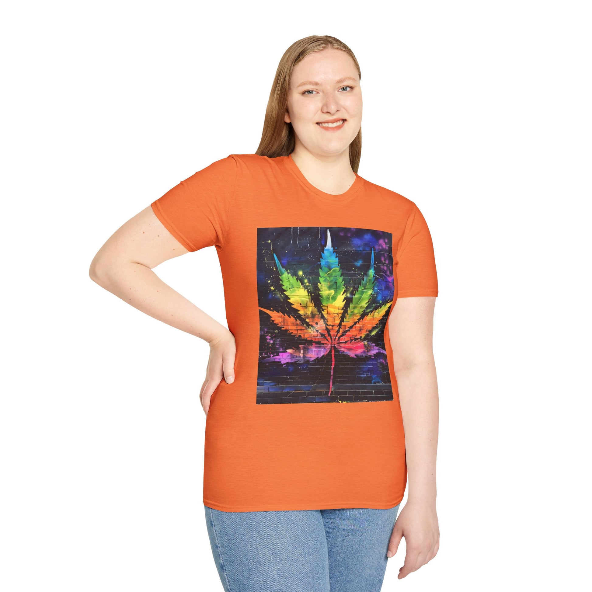 This shirt drips with bold graffiti energy—like it was blasted onto a back-alley brick wall with a can of neon rebellion. This isn’t just a weed leaf, it’s a full-blown street art moment, lit in every color of the spectrum and framed by cosmic splatter. Raw, loud, and unapologetically vibrant, this piece reps the culture with every pixel and paint drip.