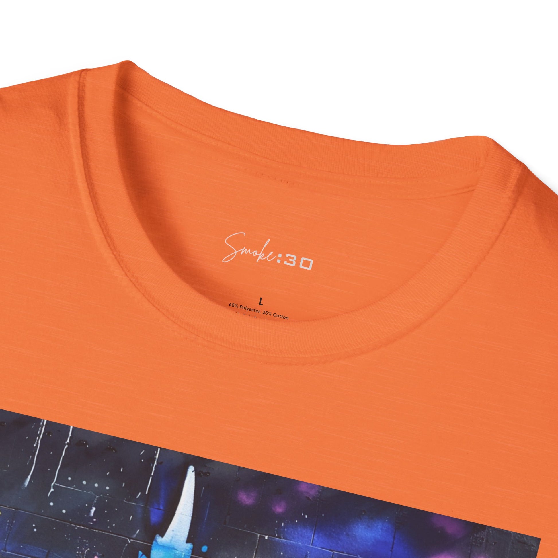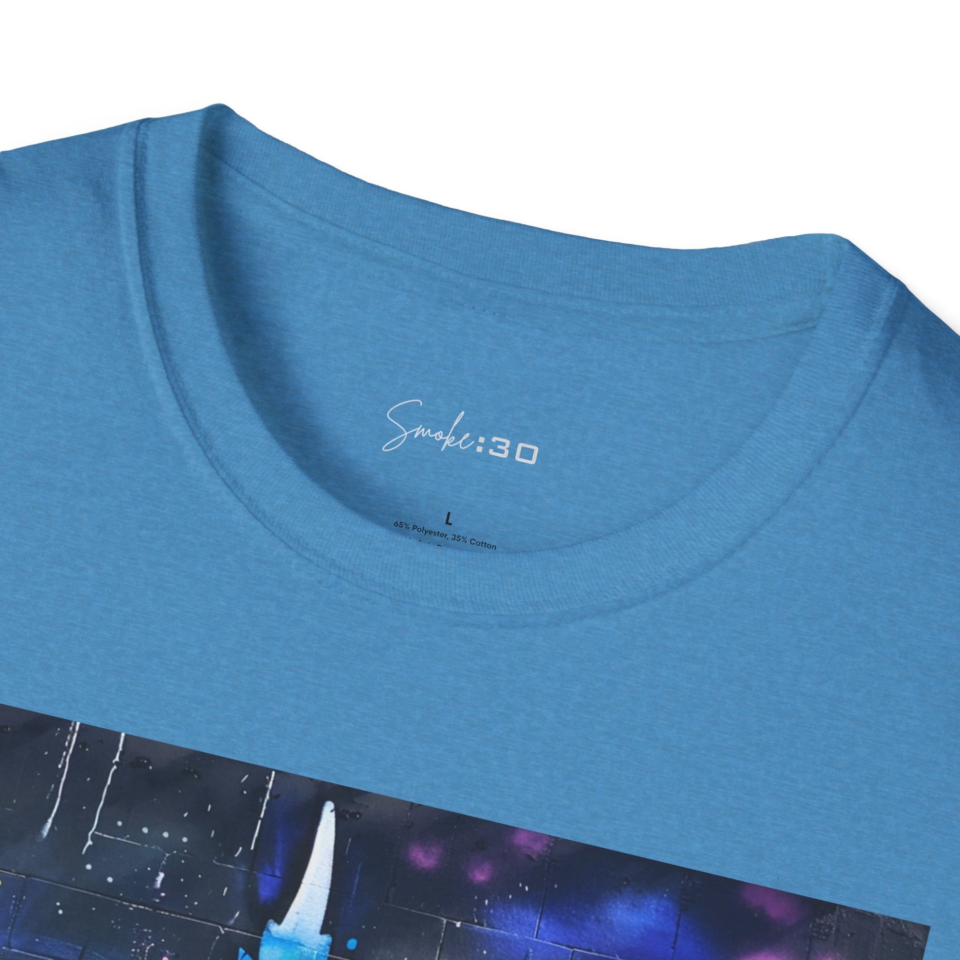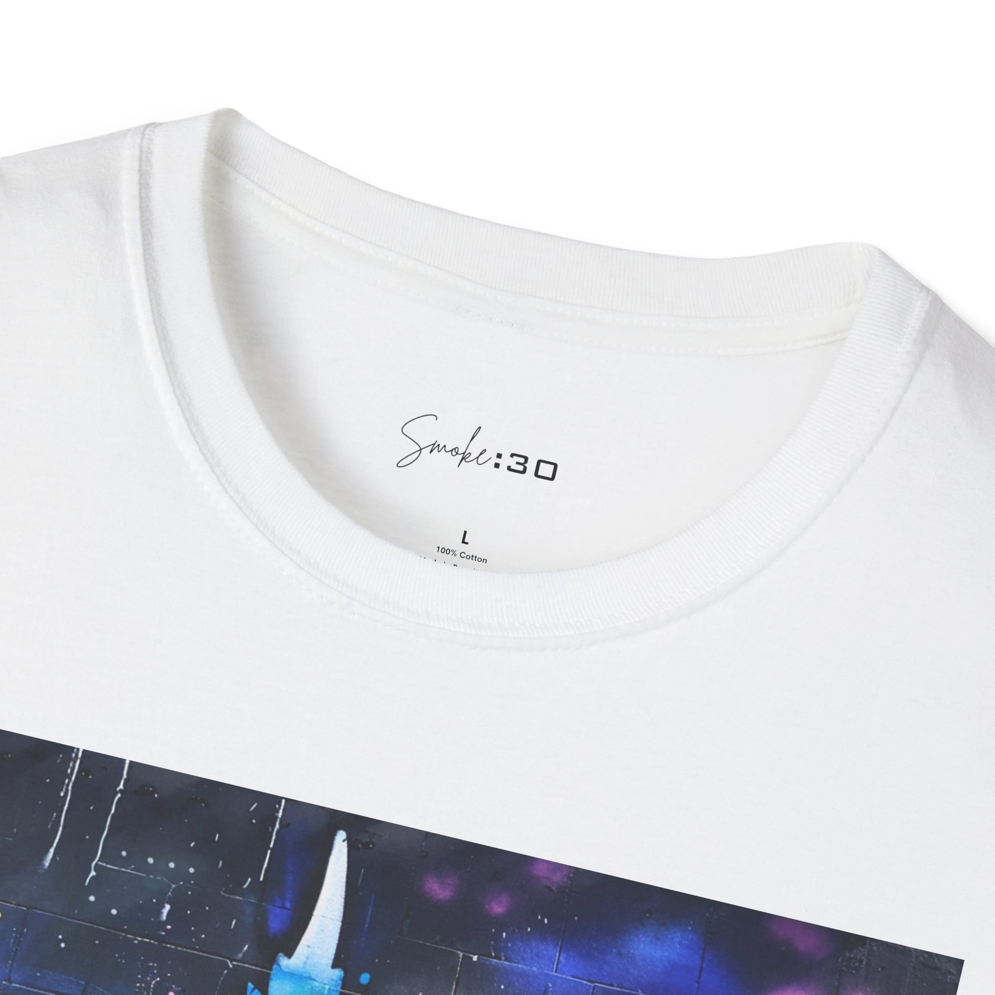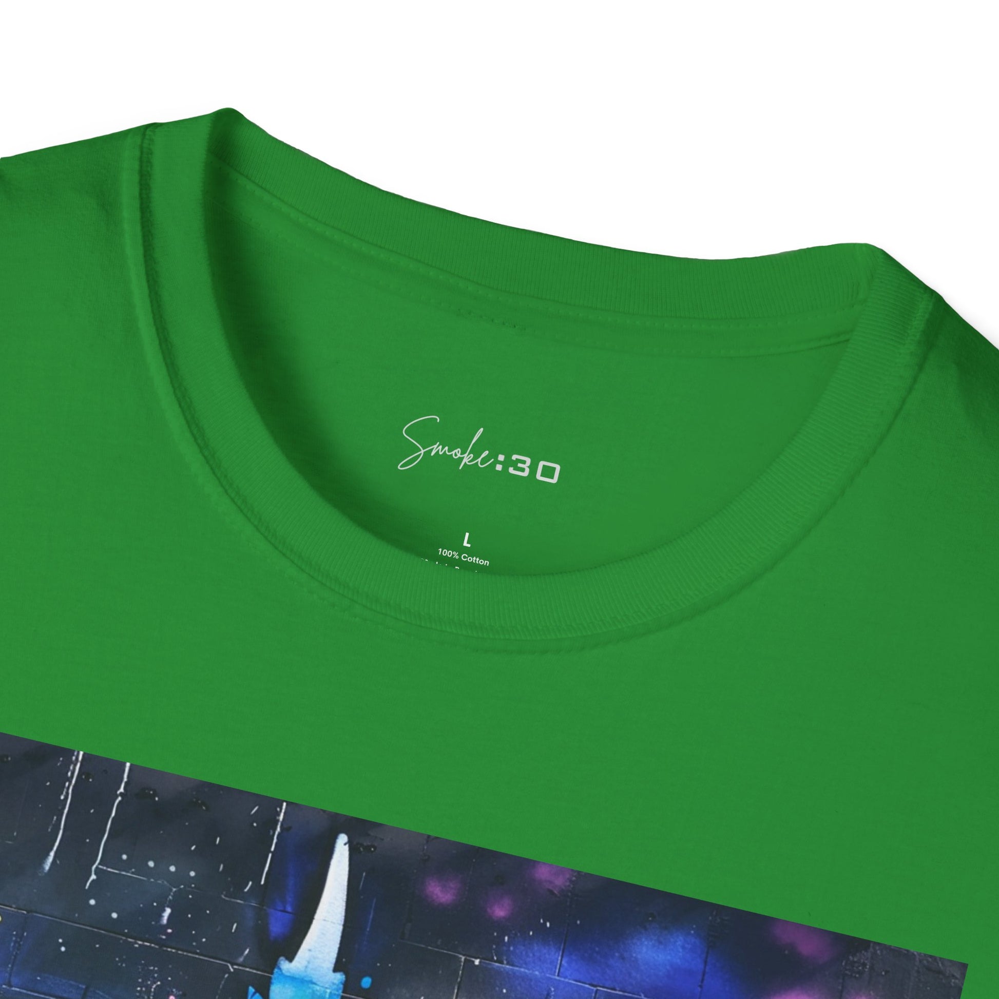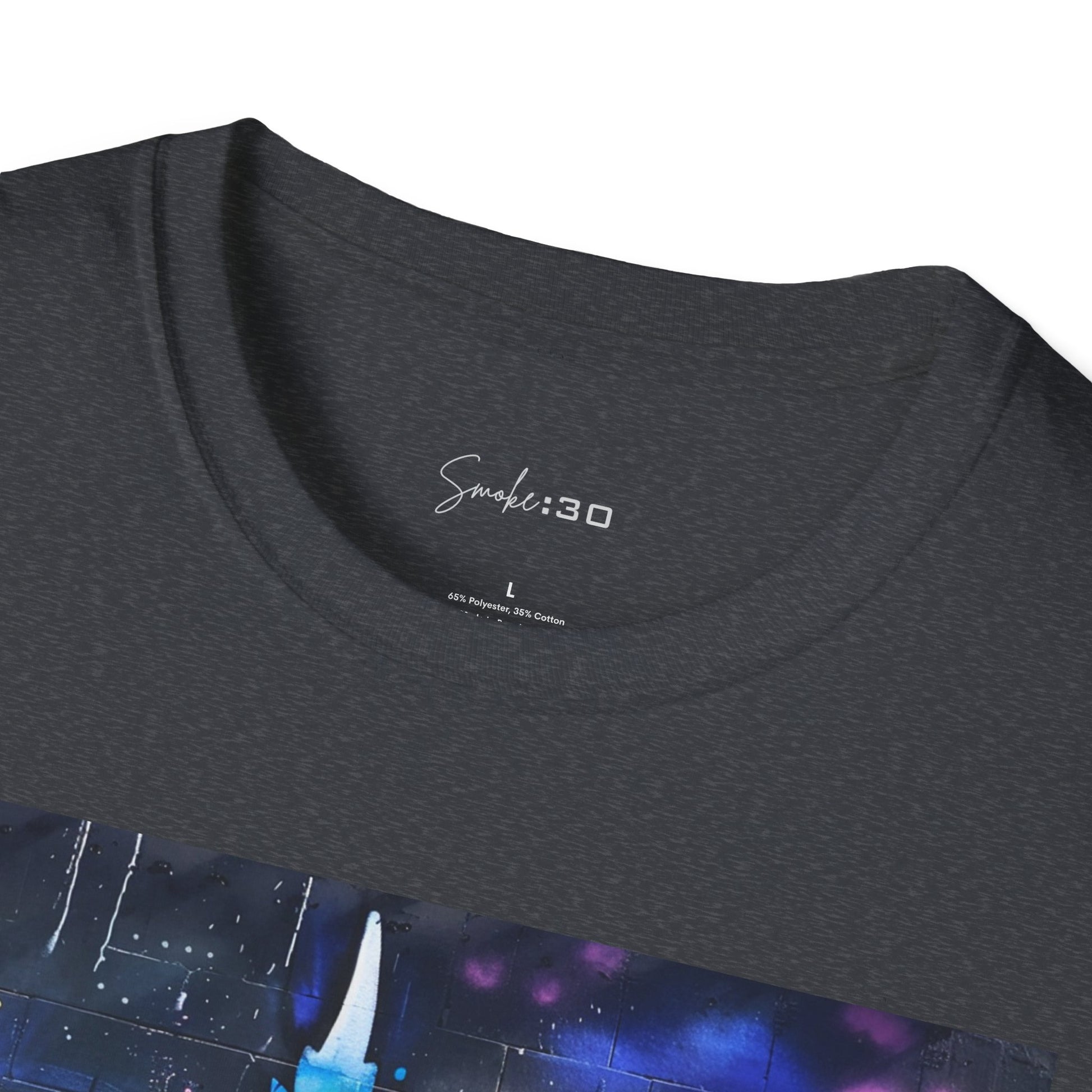 This shirt drips with bold graffiti energy—like it was blasted onto a back-alley brick wall with a can of neon rebellion. This isn’t just a weed leaf, it’s a full-blown street art moment, lit in every color of the spectrum and framed by cosmic splatter. Raw, loud, and unapologetically vibrant, this piece reps the culture with every pixel and paint drip.