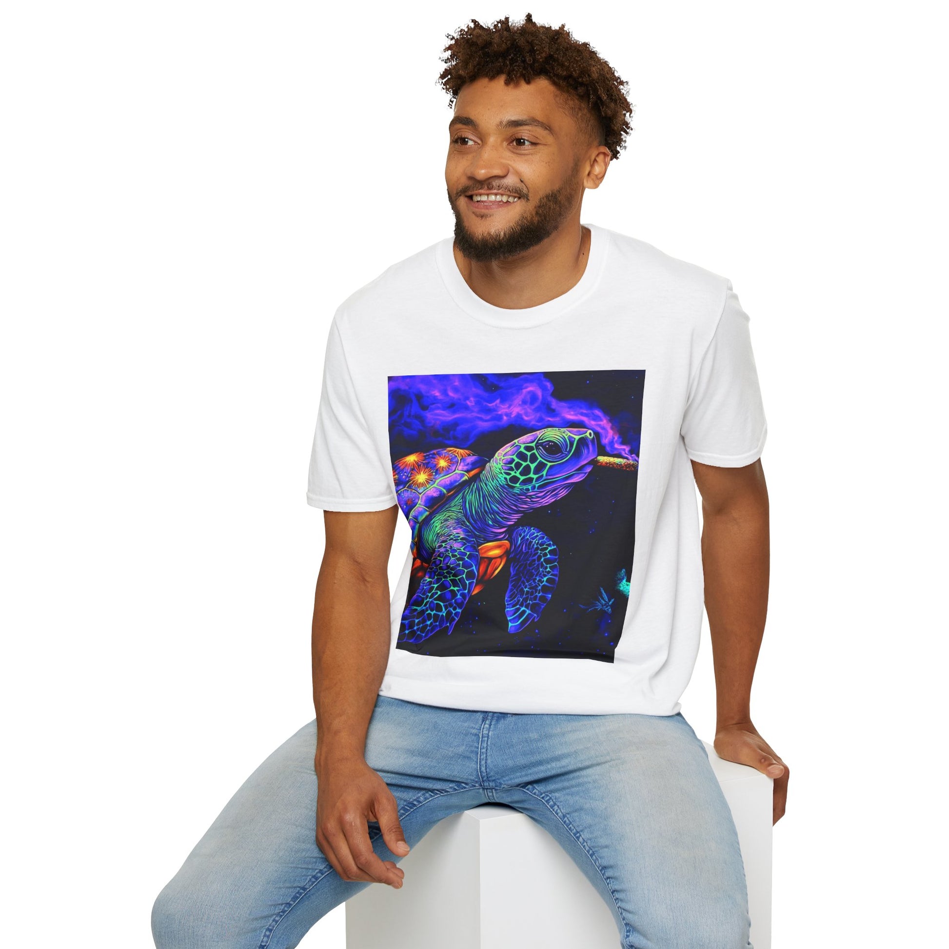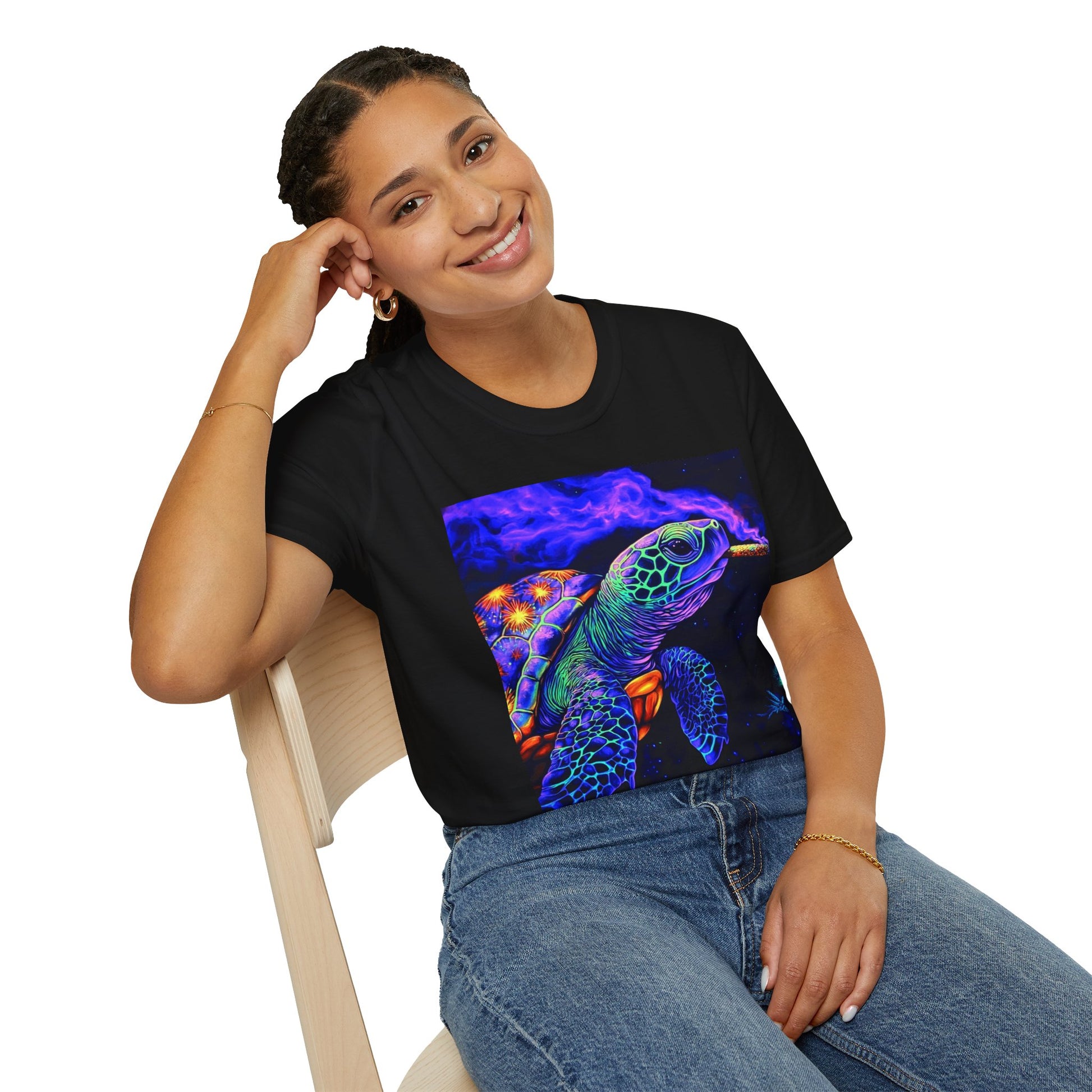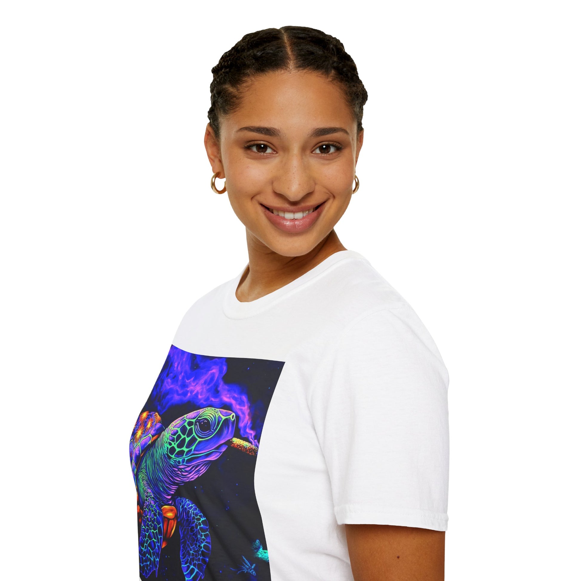 Meet the slowest flex in the galaxy. The Smoking Turtle drifts through a neon ocean of calm, trailing a swirl of violet smoke that blurs the line between space and sea. Electric blues, glowing greens, and cosmic orange ripple through his shell like galaxies in motion. It’s not just a trip — it’s a reminder to move at your own pace, breathe deep, and let the world catch up.